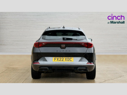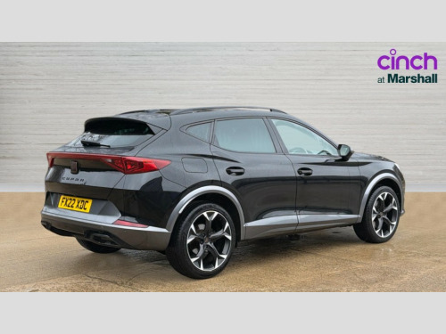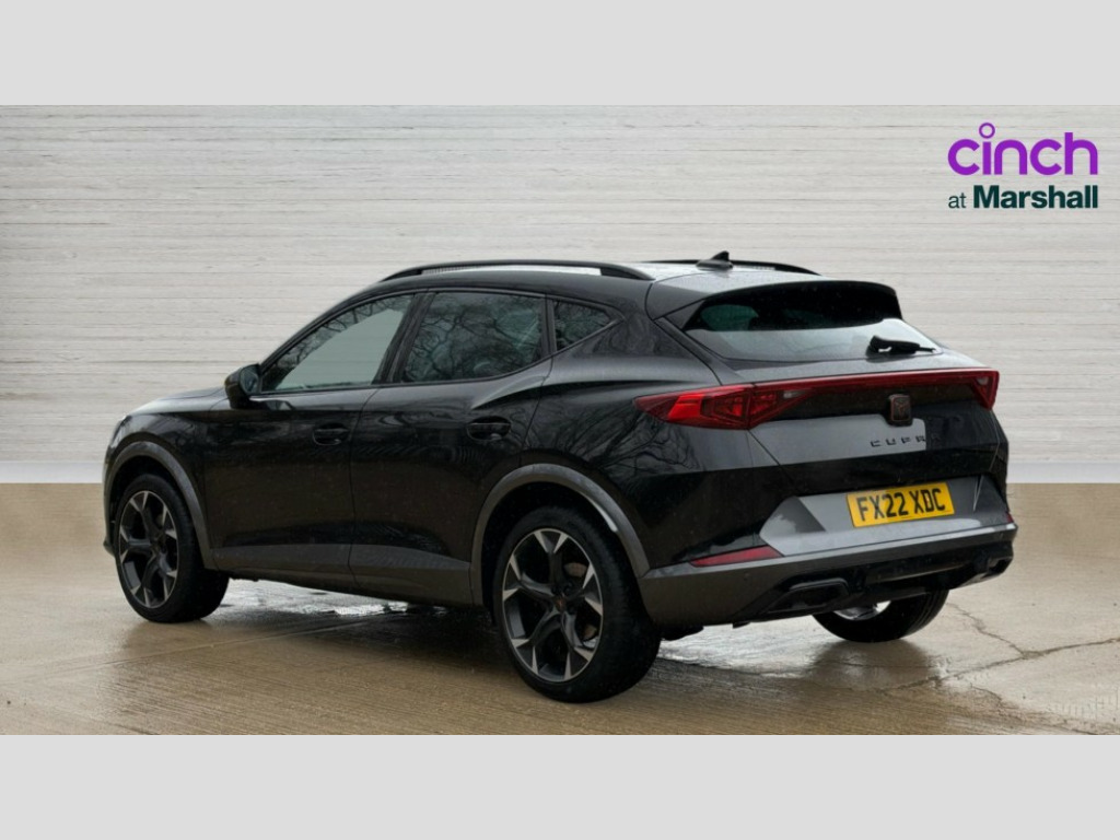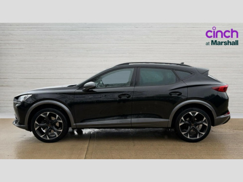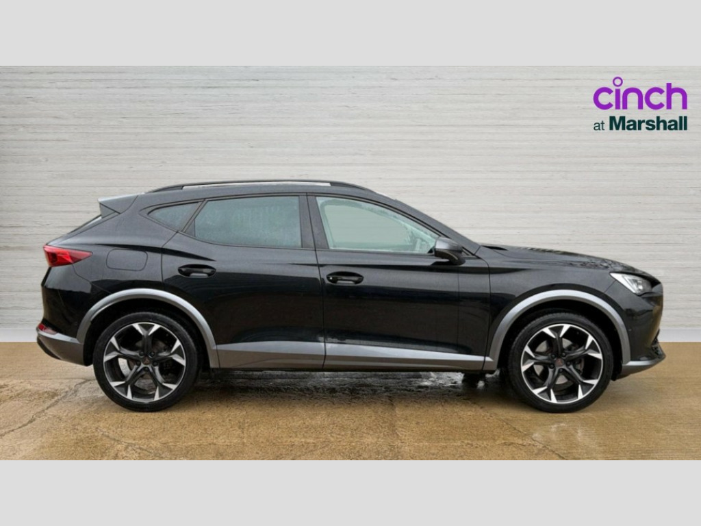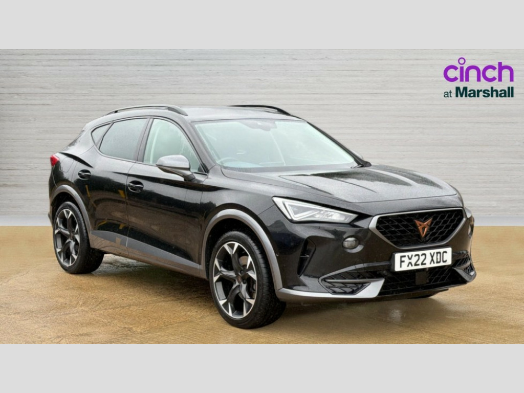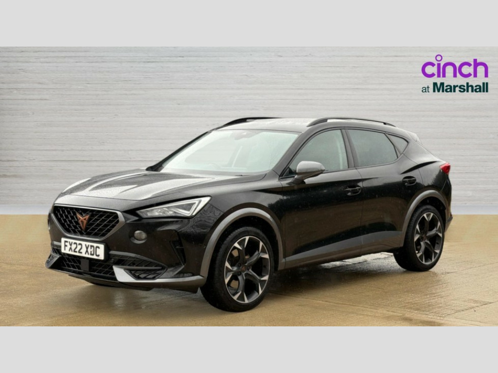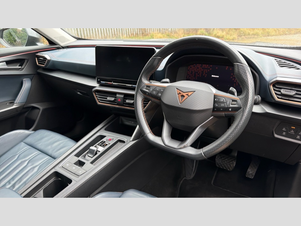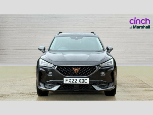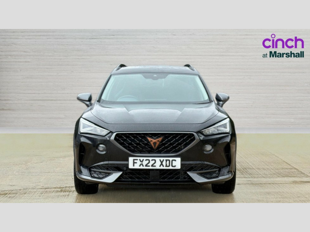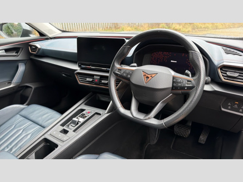 Cupra Formentor 1.5 TSI 150 V2 5dr DSG Digital cockpit and configurable dashboard, Driver alert system, Driving profile selection, E-call, Forward collision warning with automatic braking, Lane assist, Park assist (inc front/rear parking sensors), PAS, Predictive adaptive cruise control with speed limiter, Rear view camera, RPM, trip computer, outside temp gauge, instrument light brightness, low fuel warning light, lights on reminder, gearshift indicator, Service interval indicator, Start/stop system with regenerative braking, Wireless apple carplay, Wireless phone charger, Electronic locking differential and dynamic traction support, Standard suspension, 2 front and 2 rear USB type C sockets, Auxiliary input socket, DAB radio, Auto dimming rear view mirror, Body colour door handles, Body coloured bumpers, Dark grey wing mirror, Daytime running light with automatic headlight control and coming home feature, Dynamic headlight range control, Electric front/rear windows, Electrically adjustable heated and folding door mirrors with memory function, Front fog lamps with cornering function, Gloss black roof rails and window surrounds, LED Headlights, LED Taillights with dynamic indicator, Rain sensing wipers, Rear diffuser with black simulated exhaust pipes, Rear side wing doors, Rear wash/wipe, Third brake light, Tinted rear windows, Welcome lights, 12v power supply in centre console, 12V socket, 12v socket in loadspace, 2 front and 2 rear reading lights, 230V socket, 3 seat bench in 2nd row, 60/40 split rear bench seat with armrest and mechanical seat release, Dust/pollen filter, Front and rear head restraints, Front centre armrest, Height/reach adjust steering wheel, Illuminated interior front door sills, Illuminated sunvisor with mirror, Isofix, Leather multi function heated steering wheel with gear shift paddles, Luggage tie-down hooks, Single front passenger seat, Three zone climate control with control panel in rear, Variable luggage/load compartment floor, Wraparound lighting, Genuine Nappa leather Pack - Cupra, Navigation system pack with 10" navigation system - Formentor, 3 point seatbelts on all rear seats, ABS, Brake control system - ESC and brake booster, Child proof door locks, Driver and front passenger airbags with front passenger airbag de-activation, Electronic parking brake, Front and rear disc brakes, Front side curtain airbags, Hill hold control, Seat belt reminder for front and rear seats, Tyre pressure monitoring system, Anti theft alarm system, Keyless entry and start system (KESSY), Locking wheel bolts, Copper and aluminium interior detailing, 19" 'Exclusive' machined sport matte black and silver alloy wheels