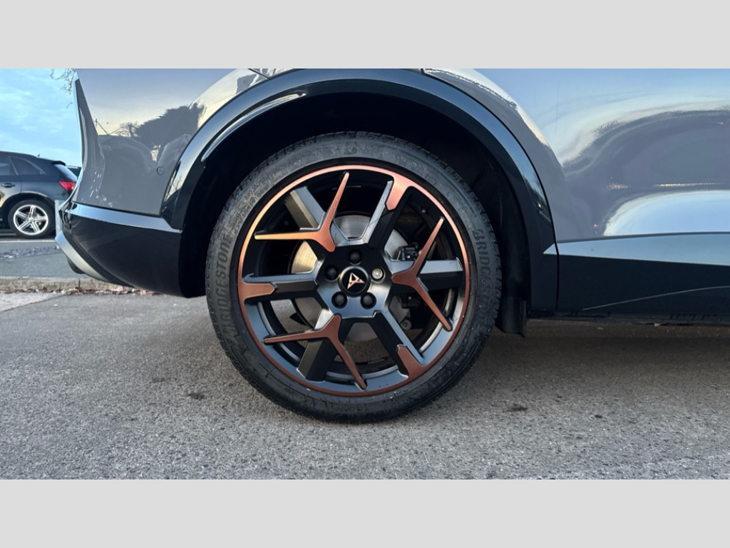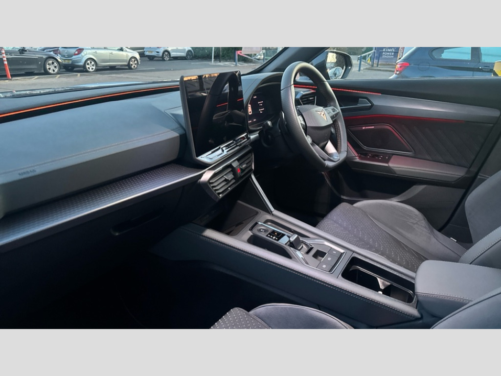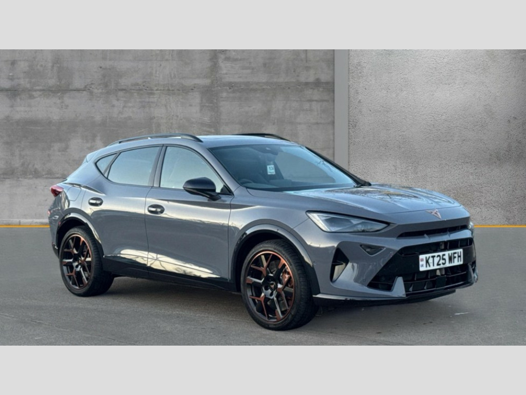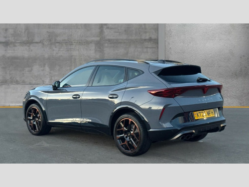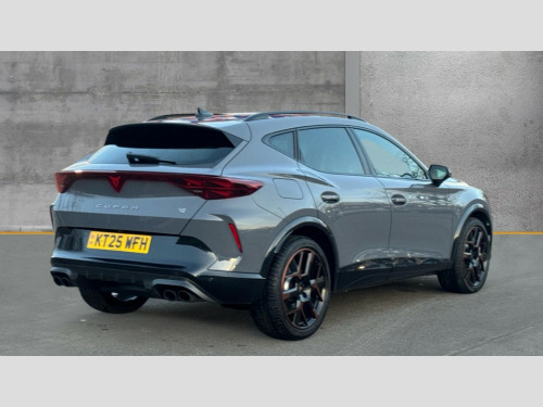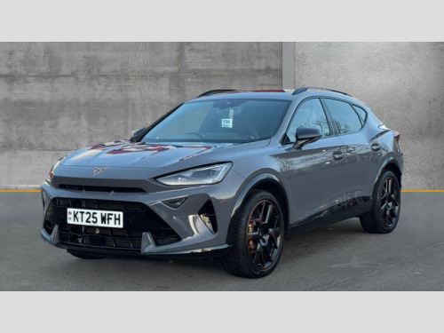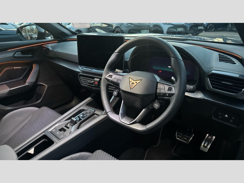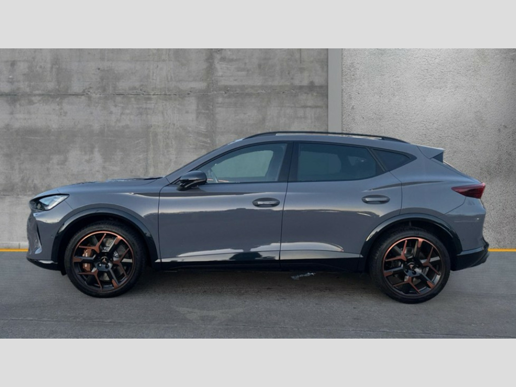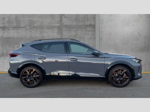 Cupra Formentor 2.0 TSI 333 VZ3 5dr DSG 4Drive 10.25" digital cockpit and configurable dashboard, Adaptive cruise control with follow-to-stop and speed limiter, Advanced lane assist with semi-automatic vehicle control in a medical emergency and traffic jam assist, Driver alert system with driver monitoring, Dynamic chassis control with driving profile selection (Comfort, Sport, CUPRA, Individual), Dynamic road sign display, Emergency steering support with turn assist, Forward collision warning with automatic braking, Front cross traffic assist, Full link phone integration, Intelligent park assist, RPM, trip computer, outside temp gauge, instrument light brightness, low fuel warning light, lights on reminder, gearshift indicator, Service interval indicator, Side and exit assist, Speed sensitive power steering, Start/stop system with regenerative braking, Top view camera, Virtual pedal and electric tailgate, Voice control system, Wired Android Auto, Wireless apple carplay, Wireless phone charger, Adaptive chassis control with continuous operation, CUPRA sport suspension, Electronic locking differential and dynamic traction support, 2 front and 2 rear USB type C sockets, Immersive by Sennheiser TM - 10 speakers, 1 central speaker, 1 subwoofer, Media system with navigation, 12.9" touchscreen display, voice control, DAB, steering wheel mounted controls, Auto dimming rear view mirror, Black roof spoiler, Body colour door handles, Body coloured bumpers, Dark grey wing mirror, Daytime running light with automatic headlight control and coming home feature, Door panel ambient lighting, Dynamic headlight range control, Electric front/rear windows, Electrically adjustable heated and folding door mirrors with memory function, Gloss black roof rails and window surrounds, High beam assist, LED 3rd brake light, LED front fog lamps with cornering function, LED Taillights with dynamic indicator, Matrix Ultra HD headlights, Rain sensing wipers, Rear diffuser with twin exhaust pipe on each side, Rear fog lights, Rear side wing doors, Rear wash/wipe, Side skirts, Tinted rear windows, Welcome lights (within exterior mirror housing), 12V socket, 2 front and 2 rear reading lights, 3 seat bench in 2nd row, 60/40 split rear bench seat with armrest and mechanical seat release, Black headlining, Black interior roof lining, Cupra sports pedals, Dust/pollen filter, Electrically adjustable front seats with lumbar support and memory function, Front and rear head restraints, Front centre armrest, Heated front seats, Heated supersports multifunction leather steering wheel with satellite buttons and gear shift paddles, Height/reach adjust steering wheel, Illuminated aluminium doorsteps, Illuminated interior front door sills, Illuminated sunvisor with mirror, Isofix, Leather dashboard, door insert and side trim panel, LED smart wraparound lighting, PVC/Textile upholstery + cup bucket seats, Satellite steering wheel, Single front passenger seat, Three zone climate control with control panel in rear, Variable luggage/load compartment floor, 3 point seatbelts on all rear seats, ABS, Akebono brakes, Brake control system - ESC and brake booster, Child proof door locks, Driver and front passenger airbags with front passenger airbag de-activation, Driver and front passenger knee airbag, Electronic parking brake, Hill hold control, Pre-crash front and rear seat belt tensioner, window closure and hazard lights, Public e-call, Seat belt reminder for front and rear seats, Side airbag for front and rear with curtain airbags, Tyre pressure monitoring system, Anti theft alarm system, KESSY Advanced - Keyless start, keyless entry with SAFELOCK, Locking wheel bolts, Warranty - 5 years/90,000 miles, Copper and aluminium interior detailing, 19" Hailstorm forged machined R black and copper alloy wheels, Breakdown and tool kit