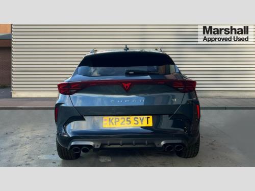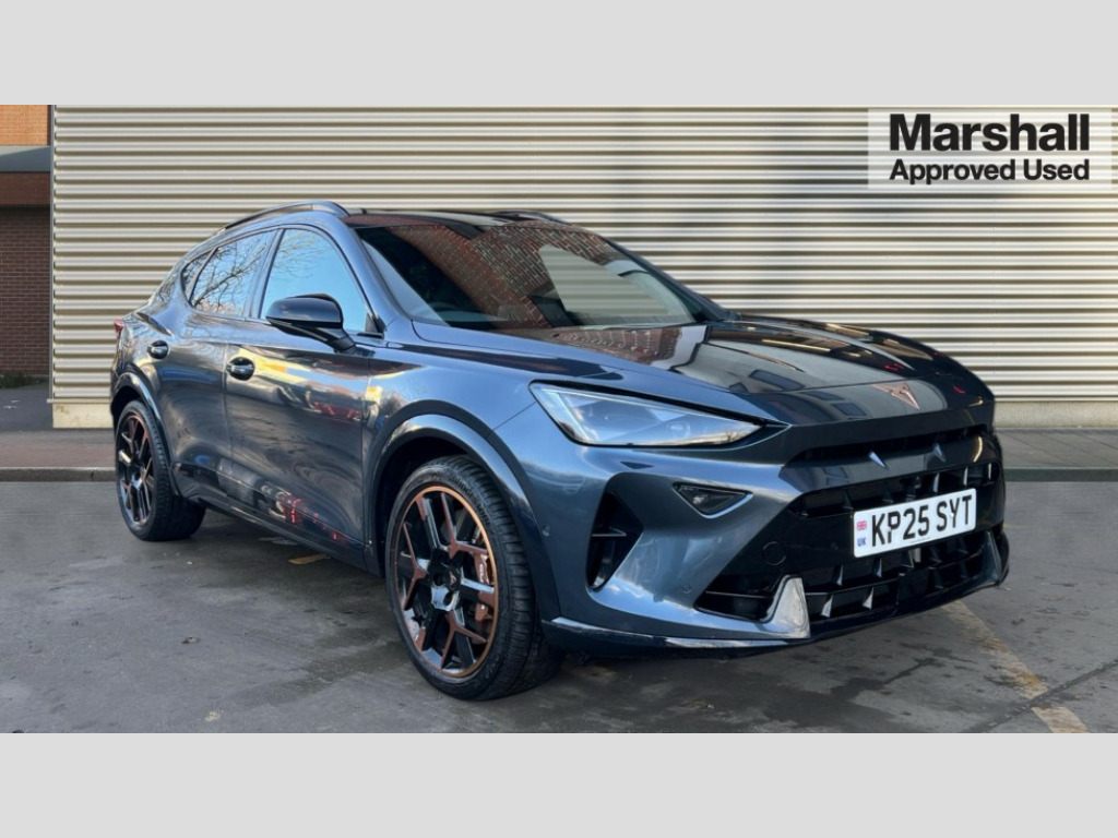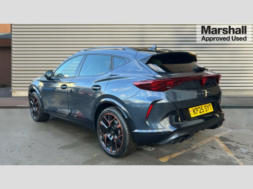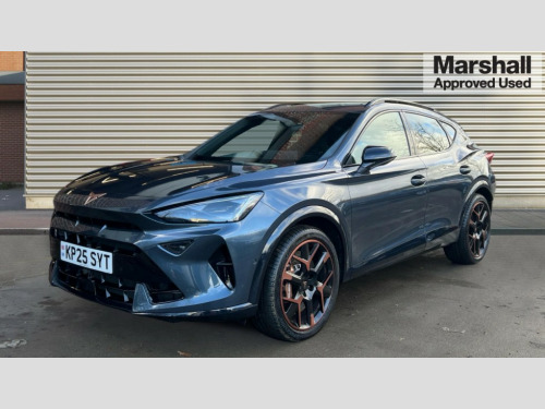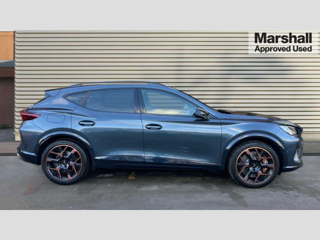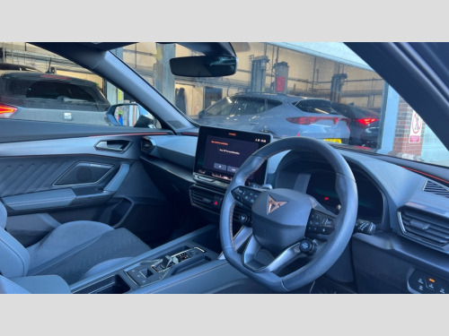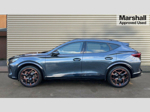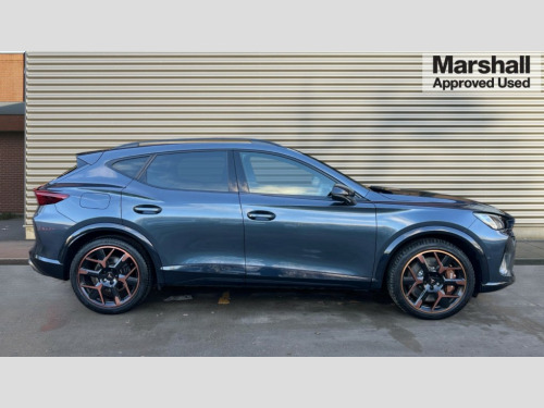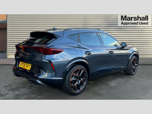 Cupra Formentor 2.0 TSI 333 VZ3 5dr DSG 4Drive 10.25" digital cockpit and configurable dashboard, Adaptive cruise control with follow-to-stop and speed limiter, Advanced driver alert system, Advanced lane assist with semi-automatic vehicle control in a medical emergency and traffic jam assist, Dynamic chassis control with driving profile selection (Comfort, Sport, CUPRA, Individual), Dynamic road sign display, Emergency steering support with turn assist, Forward collision warning with automatic braking, Full link phone integration, Intelligent park assist, RPM, trip computer, outside temp gauge, instrument light brightness, low fuel warning light, lights on reminder, gearshift indicator, Service interval indicator, Side and exit assist, Speed sensitive power steering, Start/stop system with regenerative braking, Top view camera, Virtual pedal and electric tailgate, Voice control system, Wired Android Auto, Wireless apple carplay, Wireless phone charger, Adaptive chassis control with continuous operation, CUPRA sport suspension, Electronic locking differential and dynamic traction support, 2 front and 2 rear USB type C sockets, Immersive by Sennheiser TM - 10 speakers, 1 central speaker, 1 subwoofer, Media system with navigation, 12.9" touchscreen display, voice control, DAB, steering wheel mounted controls, Auto dimming rear view mirror, Black roof spoiler, Body colour door handles, Body coloured bumpers, Dark grey wing mirror, Daytime running light with automatic headlight control and coming home feature, Door panel ambient lighting, Dynamic headlight range control, Electric front/rear windows, Electrically adjustable heated and folding door mirrors with memory function, Gloss black roof rails and window surrounds, High beam assist, LED 3rd brake light, LED front fog lamps with cornering function, LED Taillights with dynamic indicator, Matrix LED headlights with multifunction camera, Rain sensing wipers, Rear diffuser with twin exhaust pipe on each side, Rear fog lights, Rear side wing doors, Rear wash/wipe, Side skirts, Tinted rear windows, Welcome lights (within exterior mirror housing), 12V socket, 2 front and 2 rear reading lights, 3 seat bench in 2nd row, 60/40 split rear bench seat with armrest and mechanical seat release, Black headlining, Black interior roof lining, Cupra sports pedals, Dust/pollen filter, Electrically adjustable front seats with lumbar support and memory function, Front and rear head restraints, Front centre armrest, Heated front seats, Heated supersports multifunction leather steering wheel with satellite buttons and gear shift paddles, Height/reach adjust steering wheel, Illuminated aluminium doorsteps, Illuminated interior front door sills, Illuminated sunvisor with mirror, Isofix, Leather dashboard, door insert and side trim panel, LED smart wraparound lighting, PVC/Textile upholstery + cup bucket seats, Satellite steering wheel, Single front passenger seat, Three zone climate control with control panel in rear, Variable luggage/load compartment floor, 3 point seatbelts on all rear seats, ABS, Akebono brakes, Brake control system - ESC and brake booster, Child proof door locks, Driver and front passenger airbags with front passenger airbag de-activation, Driver and front passenger knee airbag, Electronic parking brake, Hill hold control, Performance brakes with front brembo calipers, Pre-crash front and rear seat belt tensioner, window closure and hazard lights, Public e-call, Seat belt reminder for front and rear seats, Side airbag for front and rear with curtain airbags, Tyre pressure monitoring system, Anti theft alarm system, KESSY Advanced - Keyless start, keyless entry with SAFELOCK, Locking wheel bolts, Copper and aluminium interior detailing, 19" Hailstorm forged machined R black and copper alloy wheels, Breakdown and tool kit