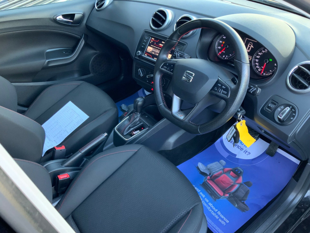 This 2017 SEAT Ibiza 1.0 EcoTSI FR Hatchback has 48,000 miles on the clock and is powered by a petrol engine, making it ULEZ compliant. With MOT valid until 22/08/2026, this 5-door hatchback also boasts 5 seats, making it perfect for families or those in need of extra space. Equipped with a 10.7-litre Glovebox with Light, Active Front Head Restraints, Air Conditioning, and Cupholders, this vehicle provides both convenience and comfort. Its 110 ps engine and DSG transmission ensure a smooth and efficient drive, making this car a great option for those in search of a reliable and practical vehicle. .7-litre glovebox with light, active front head restraints, air conditioning, convenience pack, cupholders - x3, door pockets - front, driver pack, driver and passengers sunvisors with covered mirrors, dust and pollen filter, front courtesy light with front and rear reading lights, height adjustable passenger seat, height and reach adjustable steering wheel, height-adjustable drivers seat, illuminated boot, instrument lighting with brightness control, rain sensing wipers, rear fog light, remote key - folding x2 with remote window functionality, seats - pockets on front backrest, seats - sports fr, split folding rear seats - 60-40, steering wheel - audio controls, steering wheel - leather - flat bottomed - exclusive fr, steering wheel-mounted gearshift paddles, two height-adjustable front and rear headrests, 12 volt power supply in centre console, anti-theft roof antenna, bluetooth audio streaming with handsfree system, digital audio broadcasting - dab - digital radio, fm-am radio, media system colour, six speakers, 16in alloy wheels - stratos, body-coloured door handles, body-coloured door mirrors, bumpers - body coloured with integrated mouldings, bumpers - exclusive fr front and rear, electric windows - front with one-touch and anti-squeeze, electrically folding door mirrors, emergency tyre repair kit, exhaust pipe - twin, gloss black b and c-pillars, locking wheel bolts, seat logo tailgate release, tinted windows, alarm - perimeter and interior monitoring with tow away protection, anti-lock braking system - abs, automatic warning lights, child locks on rear doors, driver and front passenger airbags, esc - electronic stability control with eba - emergency brake assist, electronic engine immobiliser, front passenger airbag deactivation, front side airbags, hill hold control, isofix points with top tether on rear seats, multi-collision braking system, rear wiper, remote central locking with deadlocks, seatbelt reminder - front, three-point seat belts, visible vin in windscreen, auto-headlights, coming home - leaving home headlight function, front fog lights with cornering function, led daytime running lights, led taillights, lights left on warning buzzer, twin halogen headlights with led daytime running lights, cruise control, digital clock, electro-mechanical power steering - speed-sensitive, electronic differential lock system - xds, exterior temperature indicator, gearshift indicator, low fuel warning light, rpm counter, sports suspension, trip computer, tyre pressure monitoring system
