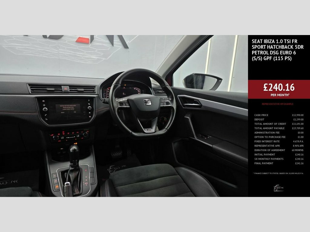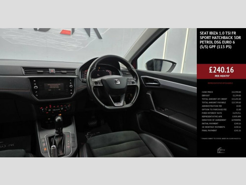 The SEAT Ibiza 1.0 TSI FR Sport DSG blends sporty design with advanced technology and everyday practicality. Finished with striking 18" bi-colour performance alloys, full FR styling, and dark tinted rear windows, it delivers standout presence on the road. Inside, the digital cockpit, multi-coloured ambient lighting, and leather-trimmed FR steering wheel create a premium, driver-focused cabin. Packed with technology, it features Navigation with Media System Plus, Full Link smartphone integration (Apple CarPlay & Android Auto), and cruise control for stress-free driving. The Full LED headlights, rain-sensing wipers, and Front Assist with Multi-Collision Braking ensure confidence and safety in every journey. Car-Net App Connect, 18in Alloy Wheels - Performance - Bi-Col, 6 Litre Glovebox, Active Front Head Restraints, Alarm - Perimeter and Interior Monitorin, Anti-Lock Braking System - ABS, Anti-Theft Roof Antenna, Auto Dimming Rear View Mirror, Auto-Headlights, Automatic Warning Lights, Bluetooth Audio Streaming with Handsfree, Body-Coloured Door Handles, Brilliant Black Painted Door Mirrors, Child Locks on Rear Doors, Coming Home - Leaving Home Headlight Fun, Cruise Control, DAB- Digital Audio Broadcasting, Dark Tinted Rear Windows, Digital Clock, Digital Cockpit, Dimming Interior Rear View Mirror, Driver Sunvisor with Mirror and Card Hol, Driver and Front Passenger Airbags, Driver and Passenge
