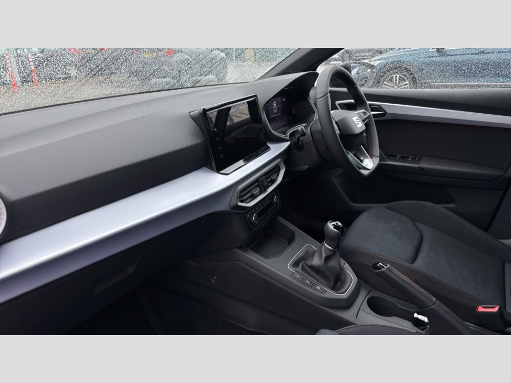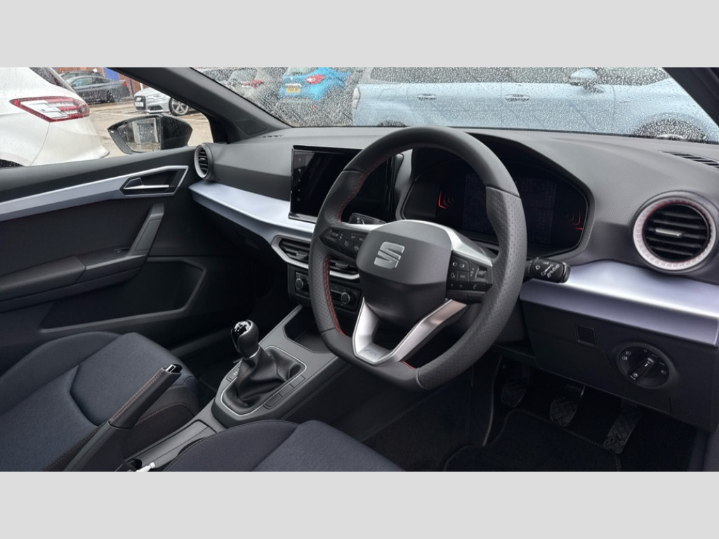 Seat Ibiza 1.0 TSI 115 FR 5dr 'Lights On' Reminder warning buzzer, 8" Digital cockpit, 9.2" touchscreen navigation system with type C USB socket, Voice control and DAB/AM/FM radio, Auto start and stop system, Bluetooth audio streaming with handsfree system, Digital clock, E-call, Full link smartphone integration with mirror link, wireless apple carplay, Google android auto + USB Type C cable for apple and android devices, Lane assist, Low fuel warning light, Outside temperature gauge, Power Steering, Rear parking sensor, Seat connect plus with safety, service, remote and online, SEAT drive profiles and ECO function, SEAT logo boot release, Speed limiter, Traffic sign recognition, Trip computer, Sports suspension, Auxiliary input socket, Radio/MP3 player, SD card slot, Steering wheel mounted controls, Anti theft roof antenna, Auto dimming rear view mirror, Automatic rain sensing wipers, Black door mirror caps, Body colour bumpers, Body colour door handles, Brilliant black window surrounds, Dark tinted rear windows, Electric adjustable/heated/folding door mirrors, Electric front windows, Electric headlight adjustment, Electric rear windows, Front/rear fog lights, FULL LED automatic headlights with dynamic headlight range control, coming and leaving home, LED daytime running lights, LED 3rd brake light, LED tail lights, Rear roof spoiler with FR twin exhausts, Rear side wing doors, Rear wiper, 3 seat bench in 2nd row, 60/40 split folding rear seat, Ambient interior lighting, Chrome detailing and black headlining, Cloth upholstery, Dual zone climate control with combination filter, Front courtesy lights, Front cupholders x 2, Front reading lights, Gear shift indicator, Glovebox, Height adjustable front and rear headrests (five), Height adjustable front seats, Height/reach adjust steering wheel, Illuminated air vent surrounds, Illuminated boot, Instrument lighting with brightness control, Isofix, Leather multifunction flat bottomed sports steering wheel, Passenger sunvisor, Single front passenger seat, Sports seats, Sunvisors with mirror and driver side card holder, Safety and driving pack (S) - Ibiza, 3 point seatbelts on all 3 rear seats, ABS, Active front headrests, Child locks on rear doors, Electronic stability control, Energy recovery system, Front driver and passenger side airbags with curtain airbag and front passenger airbag deactivation, Hill hold control, Multi-Collision braking, Seat belt reminder for front and rear seats, Tiredness recognition system, Tyre pressure monitoring system, Locking wheel bolts, Perimeter alarm and interior monitoring with backup horn and tow away protection, Remote central locking + deadlocks, 17" Alloy wheels in Brilliant silver
