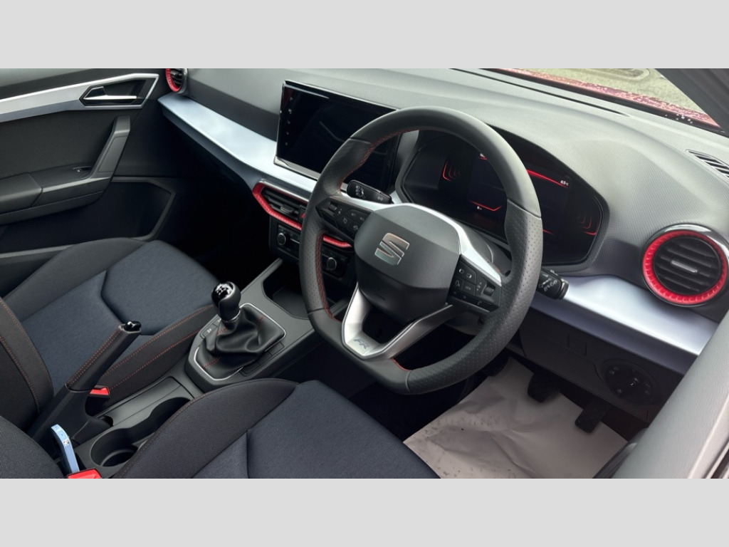 Seat Ibiza 1.0 TSI 115 FR 5dr 'Lights On' Reminder warning buzzer, 8" Digital cockpit, 9.2" touchscreen navigation system with type C USB socket, Voice control and DAB/AM/FM radio, Auto start and stop system, Bluetooth audio streaming with handsfree system, Digital clock, E-call, Full link smartphone integration with mirror link, wireless apple carplay, Google android auto + USB Type C cable for apple and android devices, Lane assist, Low fuel warning light, Outside temperature gauge, Power Steering, Rear parking sensor, Seat connect plus with safety, service, remote and online, SEAT drive profiles and ECO function, SEAT logo boot release, Speed limiter, Traffic sign recognition, Trip computer, Sports suspension, Auxiliary input socket, Radio/MP3 player, SD card slot, Steering wheel mounted controls, Anti theft roof antenna, Auto dimming rear view mirror, Automatic rain sensing wipers, Black door mirror caps, Body colour bumpers, Body colour door handles, Brilliant black window surrounds, Dark tinted rear windows, Electric adjustable/heated/folding door mirrors, Electric front windows, Electric headlight adjustment, Electric rear windows, Front/rear fog lights, FULL LED automatic headlights with dynamic headlight range control, coming and leaving home, LED daytime running lights, LED 3rd brake light, LED tail lights, Rear roof spoiler with FR twin exhausts, Rear side wing doors, Rear wiper, 3 seat bench in 2nd row, 60/40 split folding rear seat, Ambient interior lighting, Chrome detailing and black headlining, Cloth upholstery, Dual zone climate control with combination filter, Front courtesy lights, Front cupholders x 2, Front reading lights, Gear shift indicator, Glovebox, Height adjustable front and rear headrests (five), Height adjustable front seats, Height/reach adjust steering wheel, Illuminated air vent surrounds, Illuminated boot, Instrument lighting with brightness control, Isofix, Leather multifunction flat bottomed sports steering wheel, Passenger sunvisor, Single front passenger seat, Sports seats, Sunvisors with mirror and driver side card holder, Safety and driving pack (S) - Ibiza, 3 point seatbelts on all 3 rear seats, ABS, Active front headrests, Child locks on rear doors, Electronic stability control, Energy recovery system, Front driver and passenger side airbags with curtain airbag and front passenger airbag deactivation, Hill hold control, Multi-Collision braking, Seat belt reminder for front and rear seats, Tiredness recognition system, Tyre pressure monitoring system, Locking wheel bolts, Perimeter alarm and interior monitoring with backup horn and tow away protection, Remote central locking + deadlocks, 17" Alloy wheels in Brilliant silver