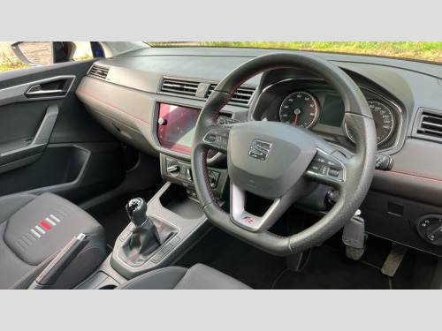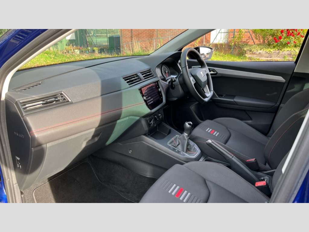 Seat Ibiza 1.0 TSI 95 FR [EZ] 5dr 'Lights On' Reminder warning buzzer, Bluetooth Handsfree Phone Connection, Cruise control, Digital clock, Full Link Smartphone Integration with Mirror Link, Apple Car Play, Google Android Auto, Low fuel warning light, Outside temperature gauge, Satellite navigation system with 3D mapping, 8" touch screen, voice control and additional USB port, SEAT Drive profile, SEAT logo boot release, Speed sensitive power steering, Trip computer, Sports suspension, 6 speakers, Auxiliary input socket, CD player, Digital Audio Broadcast (DAB) Tuner, Radio/MP3 player, SD card slot, SEAT USB media cable, Steering wheel mounted controls, USB port, Anti theft roof antenna, Auto dimming rear view mirror, Automatic headlights, Automatic rain sensing wipers, Body colour bumpers, Body colour door handles, Brilliant black door mirrors, Chrome front grille frame, Chrome grille, Coming/leaving home lighting function, Cornering front fog lights, Dark tinted rear windows, Electric folding door mirrors, Electric front windows, Electric headlight adjustment, Electrically adjustable and heated door mirrors, Exclusive FR rear bumper, Full LED headlights, LED daytime running lights, LED tail lights, Rear fog lights, Twin exhaust pipes, 3 rear headrests, 60/40 split folding rear seat, Air conditioning, Door and steering wheel ice metal decorative inserts, Driver's sunvisor with ticket holder/vanity mirror, Dust/pollen filter, Flat bottomed perforated leather steering wheel with red stitching and FR logo, Front courtesy lights, Front cupholders x 2, Front reading lights, Gear shift indicator, Glovebox, Height adjustable driver's seat, Height adjustable front/rear head restraints, Height adjustable passenger seat, Height/reach adjust steering wheel, Illuminated boot, Instrument lighting with brightness control, Leather handbrake, Leather steering wheel and gear knob, Multi-colour ambient interior lighting, Nora cloth upholstery, Passenger sunvisor, Rear top tether child seat ISOFIX attachment, Sports seats, Full LED headlight pack - Ibiza, 3 point seatbelts on all 3 rear seats, ABS, Active front headrests, Child locks on rear doors, Curtain airbags, Driver/Front Passenger airbags, ESP+EBA, Front assist (AEB), Front passenger airbag deactivation, Front side airbags, Hill hold control, Multi-Collision braking, Seatbelt warning, Tiredness recognition system, Tyre pressure monitoring system, 2 folding remote keys with window open/close function, Electronic engine immobiliser, Locking wheel bolts, Remote central locking + deadlocks, Volumetric alarm with back up horn, Black dash trim, Leather dashboard, 17" Dynamic alloy wheels