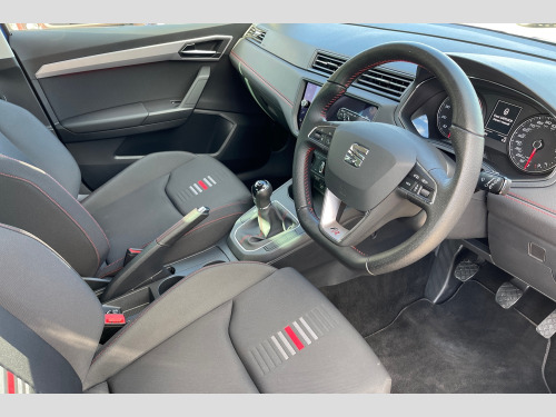 Exterior Features, Metallic paint, Paint - Metallic, Metallic - Mystery blue, Exterior Features, Automatic rain sensing wipers, Dark tinted rear windows, Electric front windows, Sports suspension, Anti theft roof antenna, Body colour bumpers, Body colour door handles, Chrome front grille frame, Chrome grille, Exclusive FR rear bumper, Twin exhaust pipes, Automatic headlights, Coming/leaving home lighting function, Cornering front fog lights, Electric headlight adjustment, Full LED headlights, LED daytime running lights, LED tail lights, Rear fog lights, Safety, ABS, ESP+EBA, Front assist (AEB), Hill hold control, Multi-Collision braking, Cruise control, Power Steering, SEAT Drive profile, Auto dimming rear view mirror, Brilliant black door mirrors, Electric folding door mirrors, Electrically adjustable and heated door mirrors, 3 point seatbelts on all 3 rear seats, Active front headrests, Child locks on rear doors, Curtain airbags, Driver/Front Passenger airbags, Front passenger airbag deactivation, Front side airbags, Seatbelt warning, Tiredness recognition system, Tyre pressure monitoring system, Audio / Communications, Bluetooth Handsfree Phone Connection, 6 speakers, Auxiliary input socket, CD player, Digital Audio Broadcast (DAB) Tuner, Radio/MP3 player, SD card slot, SEAT USB media cable, Steering wheel mounted controls, USB port, Driver Convenience, SEAT logo boot release, Miscellaneous, 'Lights On' Reminder warning buzzer, Digital clock, Full Link Smartphone Integration with Mirror Link, Apple Car Play, Google Android Auto, Low fuel warning light, Outside temperature gauge, Satellite navigation system with 3D mapping, 8" touch screen, voice control and additional USB port, Trip computer, Interior Features, Air conditioning, Dust/pollen filter, Door and steering wheel ice metal decorative inserts, Flat bottomed perforated leather steering wheel with red stitching and FR logo, Front cupholders x 2, Gear shift indicator, Glovebox, Height/reach adjust steering wheel, Leather dashboard, Leather handbrake, Nora cloth upholstery, Passenger sunvisor, Front courtesy lights, Front reading lights, Illuminated boot, Instrument lighting with brightness control, Multi-colour ambient interior lighting, Driver's sunvisor with ticket holder/vanity mirror, Packs, Full LED headlight pack - Ibiza, Trim, 3 rear headrests, 60/40 split folding rear seat, Height adjustable driver's seat, Height adjustable front/rear head restraints, Height adjustable passenger seat, Rear top tether child seat ISOFIX attachment, Sports seats, Security, Electronic engine immobiliser, Locking wheel bolts, Remote central locking + deadlocks, Volumetric alarm with back up horn, Wheels, 17" Dynamic alloy wheels
