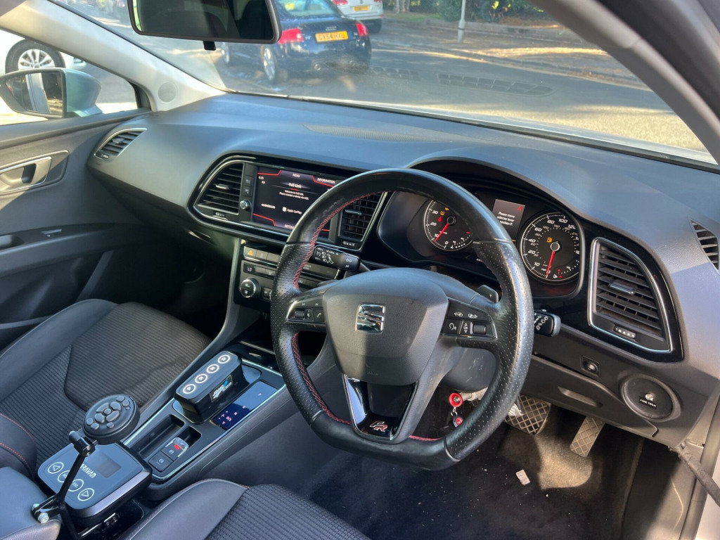 This 2017 SEAT Leon EcoTSI FR Technology is a remarkable find, having been cherished by just one owner from new and boasting a low mileage of only 54,000 miles. This Euro 6 compliant 1.4 litre petrol model offers a compelling blend of performance and efficiency, with an impressive fuel economy of 58 miles per gallon. The FR Technology trim ensures a premium experience, featuring Full LED headlights for superior visibility and a comprehensive Navigation System with Bluetooth connectivity. Inside, you'll appreciate the convenience of Steering Wheel Mounted Gearshift Paddles and Dual Zone Climate Control, ensuring comfort for all occupants.The SEAT Leon EcoTSI FR Technology truly stands out with its excellent acceleration, achieving 0 to 62 miles per hour in just 8.0 seconds, demonstrating its dynamic capabilities. Furthermore, the inclusion of Full Link, which supports both Android Auto and Apple CarPlay, keeps you seamlessly connected on every journey. This model also offers generous boot space, making it a practical choice for families and those who require ample storage. These highlights collectively position this Leon as a superior option compared to other vehicles in its class.please call this has had a disabled conversion sold as is v power supply in centre console, 17in alloy wheels - dynamic, 3.5in drivers display, 7 airbags, abs - anti-lock braking system - tcs - traction control system, active front head restraints and 3 rear head restraints, alarm - perimeter and interior monitoring with back-up horn and tow-away protection, aluminium front door sill trims with fr logo, body-coloured door handles, body-coloured door mirrors with integrated led indicators, boot storage net, bumpers - exclusive fr front and rear, cargo rings in the boot, cruise control, dark tinted rear windows, driver and passenger seat height adjustment, driver and passenger sunvisor with covered and illuminated mirrors, drivers seat lumbar adjustment, dual zone climate control, esc - electronic stability control and tyre pressure warning light indicator, electric parking brake including autohold function, electrically folding door mirrors, electro-mechanical power steering, electronic differential lock system - xds, emergency tyre repair kit, exhaust pipe - twin, front assist with pedestrian protection, front seat back storage pockets, front sports seats, front and rear electric windows, fuel filler flap linked to central locking, full led headlights, full link, head restraints - height adjustable front, high centre console, high gloss black b and c pillars, hill hold control, isofix points in outer rear seats with top tether anchorage points, illuminated glovebox, instrument lighting with brightness control, interior chrome detailing, leather gear knob, lights left on warning buzzer, low fuel warning light, lower suspension - 15mm, media system plus, multi coloured ambient lighting, multi-collision braking system, navigation system, outside temperature gauge, rpm counter, radiator grille frame in chrome, radiator grille in black, reading lights front and rear with ambient spots - boot lights and illuminated foot area, rear parking sensors, remote central locking with deadlocks, seat drive profile, seatbelt reminder - front, seats - passenger lumbar adjustment, split folding rear seats - 60-40, sports suspension, steering wheel - flat-bottomed perforated leather with red stitching and fr logo, steering wheel-mounted gearshift paddles, storage box under driver and front passenger seat, trip computer, two remote keys with window open-close - door mirror folding and boot opening functionality
