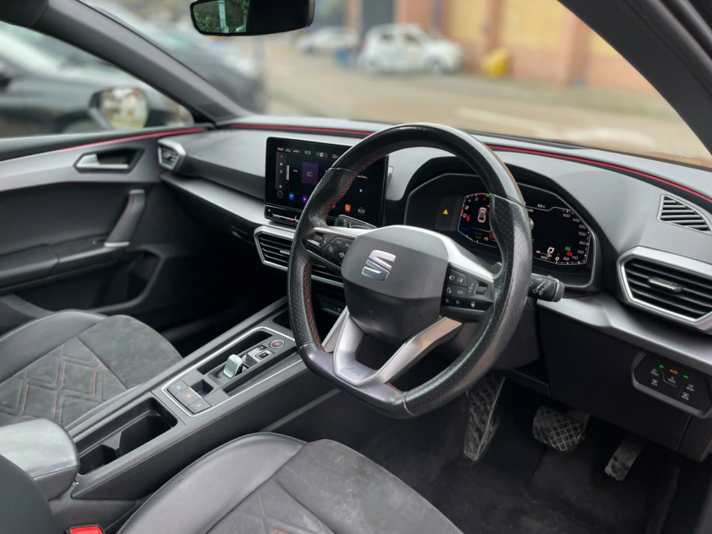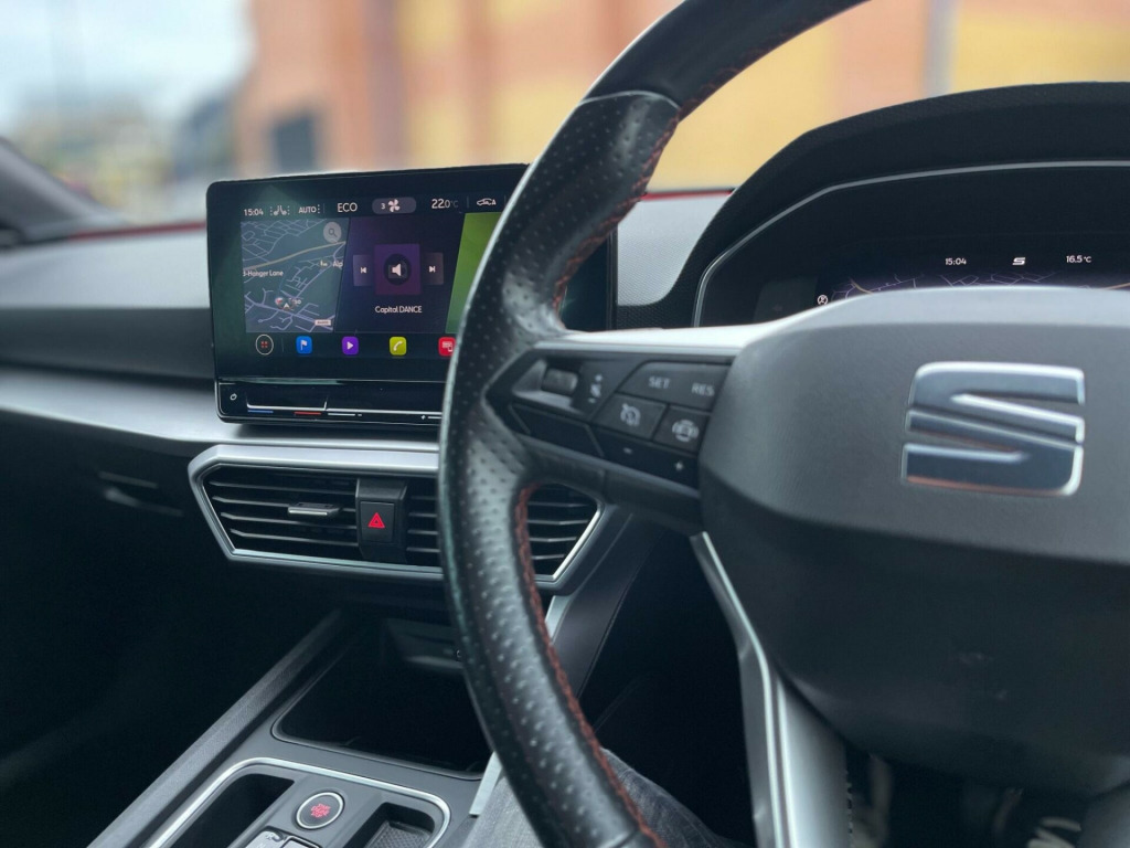 This 2021 SEAT Leon eHybrid FR Sport presents a superb ownership proposition, having been meticulously maintained by just one owner from new. This Euro 6 compliant model boasts a sophisticated 1.4 litre petrol plug in hybrid engine, offering an efficient and dynamic driving experience. The FR Sport trim level ensures a premium feel, enhanced by striking LED headlights with dynamic turn signals. Inside, you'll appreciate the comfort of three zone climate control and the luxury of a heated leather flat bottomed, perforated steering wheel.Navigating tight spaces is made effortless with the park assist system, complete with front and rear parking sensors. Connectivity is seamless thanks to Full Link smartphone integration, supporting wireless Apple CarPlay and wired Google Android Auto, alongside Mirror Link. These features collectively demonstrate the advanced technology and thoughtful design packed into this SEAT Leon, setting it apart and providing a superior driving environment compared to other vehicles in its class. v power supply in centre console, 18in alloy wheels - performance machined, ambient lighting, ambient lighting in door trim, anti-lock brakes - abs, anti-theft alarm system - interior monitoring - backup horn and towing protection, auto dimming rear view mirror, black interior roof, brake control system - esc and brake booster, charging cable - mode 2, chrome interior detailing, cruise control with speed limiter, dark tinted rear windows, digital cockpit, driver and front passenger airbags with front passenger airbag de-activation - front side - curtain airbag, electric parking brake, electrically adjustable folding and heated door mirrors with memory, electro-mechanical power steering - speed-sensitive, electronic differential lock system - xds - dynamic traction support, emergency tyre repair kit, extended safety system, fr sport bumpers, folding boot cover, four usb type c ports, front assist, front centre armrest, front led fog lights with cornering function, front seat back storage pockets, front and rear electric windows, front and rear reading lights - four, full link smartphone integration - mirror link - wireless apple carplay - wired google android auto, heated leather flat bottomed - perforated steering wheel, height-adjustable front and rear headrests - with third headrest in rear, isofix points in outer rear seats with top tether anchorage points, illuminated front door sill, interior lighting, interior wraparound lighting, kessy go - keyless start, led headlights with dynamic turn signals, lane keeping system, lockable tailgate, media system plus with navigation, multi coloured ambient lighting, park assist including front and rear parking sensors, powered driver seat with memory and manual height adjustment for passenger, powered lumbar adjustments on drivers side - manual on passenger side, rain sensing wipers, rear bench seats with 60-40 split and armrest, rear fog light, seat connect app, seat drive profile, seatbelt reminder - front and rear, separate daytime running light with automatic headlight control and automatic coming home feature, seven speakers, sports suspension, start-stop and regenerative braking, sunvisors with illuminated mirrors, three-zone climate control, tiredness recognition system, tool kit, tyre pressure monitoring system, wireless device charger