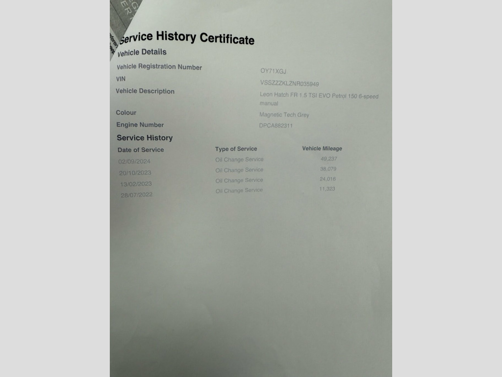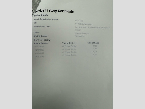 This 2022 SEAT Leon TSI EVO FR boasts a clear vehicle history, offering you peace of mind. This Euro 6 compliant model features a 1.5 litre petrol engine and comes with an MOT valid until February 2026. Inside, you'll find a Media System Plus with navigation and Bluetooth connectivity, alongside a Wireless Device Charger for your convenience. The FR trim also includes LED headlights with dynamic turn signals and automatic coming home functionality, plus three zone climate control to ensure everyone's comfort. Experience a responsive drive with this SEAT Leon, accelerating from 0 to 60mph in just 8.7 seconds. This performance, combined with its advanced features like LED headlights and automatic climate control, sets it apart from other vehicles in its class. The inclusion of a clear vehicle history check and a long MOT further enhances its appeal, making this Leon a well maintained and desirable choice. Magnetic Grey, 12V Power Supply in Centre Console, 17in Alloy Wheels - Dynamic Bi-Spoke, Ambient Lighting, Anti-Lock Brakes - ABS, Anti-Theft Alarm System - Interior Monit, Auto Dimming Rear View Mirror, Brake Control System - ESC and Brake Boo, Chrome Interior Detailing, Cruise Control with Speed Limiter, Dark Tinted Rear Windows, Digital Cockpit, Driver and Front Passenger Airbags with , Driver and Passenger Seat Manual Height , Driver and Passenger Seat with Lumbar Ad, Electric Parking Brake, Electrically Adjustable Folding and Heat, Electro-Mechanical Power Steering - Spee, Emergency Tyre Repair Kit, Extended Safety System, FR Sport Bumpers, Folding Boot Cover, Four USB Type C Ports, Fro