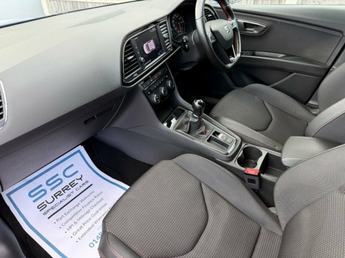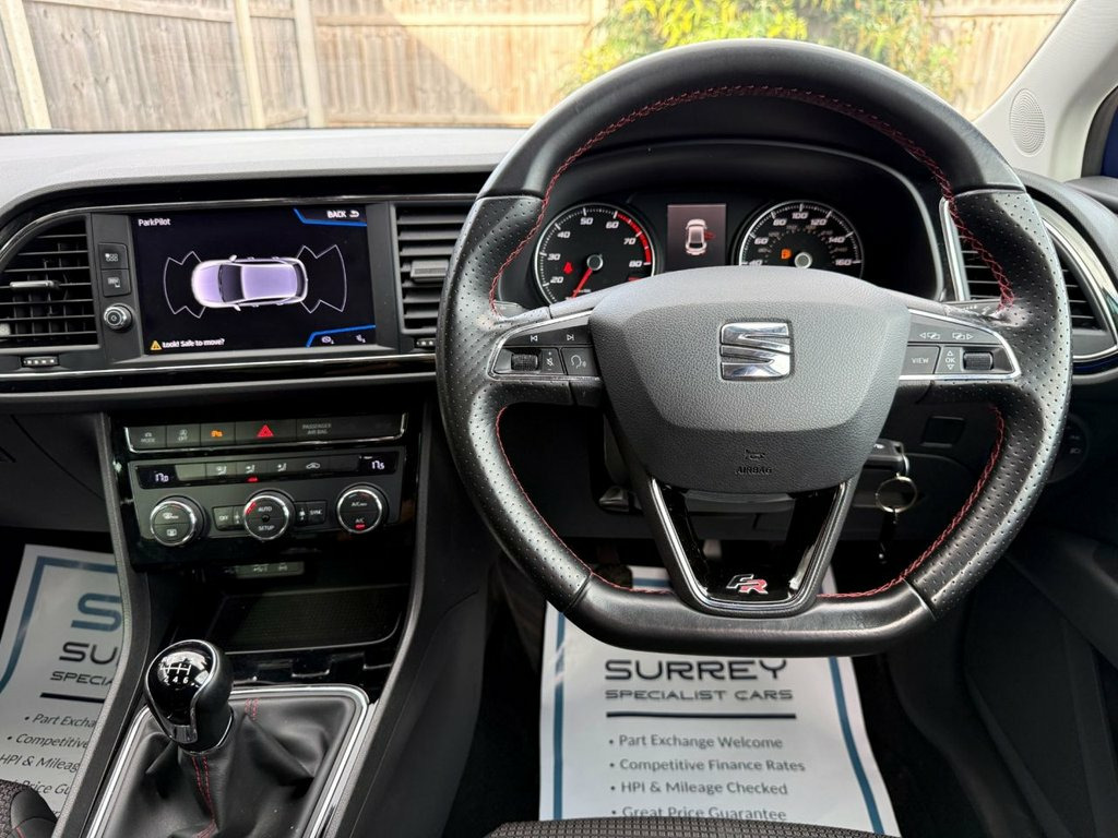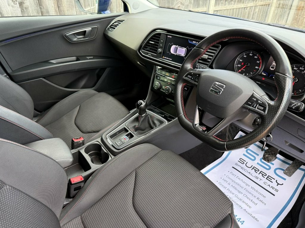 Surrey Specialist Cars are proud to present our lovely Seat Leon FR TSI EVO. This amazing car comes with Service History, finished in stunning metallic blue with grey contrast interior. The car was last serviced in February 2025 at 55,358 miles. The car will come with Long MOT so it will be ready to go. The 1.5L Petrol engine offers superb economy at over 48 MPG on combined cycle. Features Include Multifunction Steering Wheel, Trip Computer, Cruise Control, Stereo Control, Touch Screen, FM/DAB Radio, CD Player, SD Card, USB Input, AUX Input, Apple CarPlay, Bluetooth Audio, Start/Stop System, Drive Mode, Dual Zone Climate Control, two Cup Holders, Electronic Hand Brake, Fog Lights, 12V Charging Socket, 6 Speed Manual Gearbox, 17 Inch Alloy Wheels and two Remote Control Keys to name a few. 12V Power Supply in Centre Console, 17in Alloy Wheels - Dynamic 30-2, 7 Airbags, ABS and Traction Control System - TCS - , Alarm - Volumetric, Body-Coloured Door Handles, Body-Coloured Door Mirrors with Integrat, Boot Storage Net, Bumpers - Exclusive FR Front and Rear, Cargo Rings in the Boot, Convenience Pack Plus, Cruise Control, Dark Tinted Rear Windows, Digital Clock, Driver and Passenger Seat Height Adjustm, Driver and Passenger Sunvisor with Cover, Drivers Seat Lumbar Adjustment, Dual Zone Climate Control, ESC - Electronic Stability Control and T, Electric Parking Brake Including Autohol, Electrically Adjustable and Heated Door , Electrically Foldable Exterior Mirrors w, Electro-Mechan