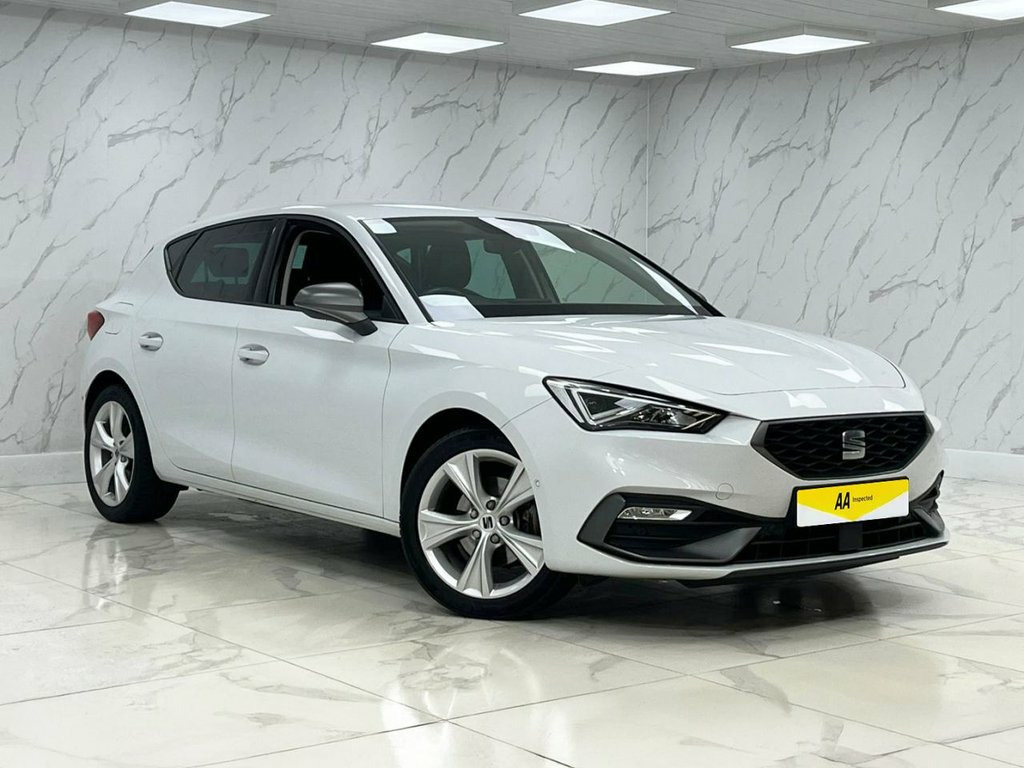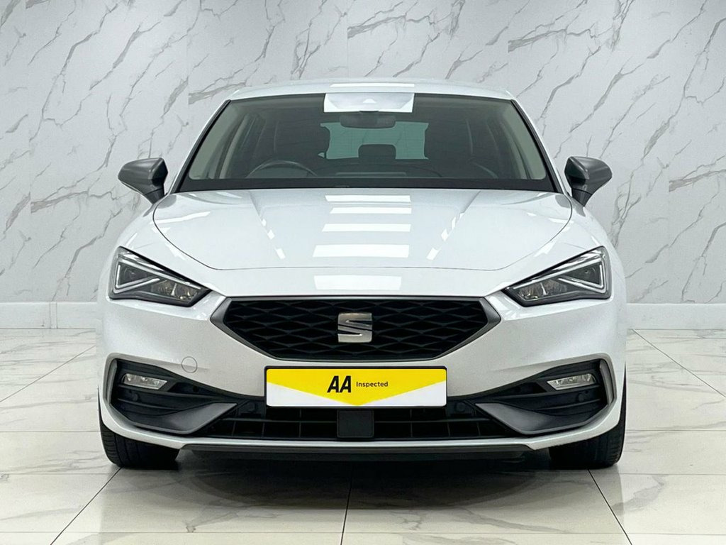 This 2021 SEAT Leon TSI EVO FR is a standout example, boasting exceptionally low mileage for its age and a single owner from new. With a 1.5 litre Euro 6 compliant petrol engine, this FR trim model offers a responsive drive, reaching 0-60mph in just 9.5 seconds. Its comprehensive full service history provides peace of mind, and the vehicle comes equipped with a suite of modern conveniences. Enjoy seamless connectivity with Full Link Smartphone Integration, featuring Mirror Link, wireless Apple CarPlay, and wired Google Android Auto. The advanced Media System Plus includes navigation and Bluetooth, while the three zone climate control ensures comfort for all occupants. Further enhancing its appeal, this Leon features LED headlights with dynamic turn signals for improved visibility and style. Parking is made effortless thanks to the Park Assist system, complete with front and rear parking sensors. These features, combined with its economical 1.5L engine and impressive acceleration, demonstrate how this particular SEAT Leon TSI EVO FR offers a superior driving experience compared to other vehicles in its class. Nevada White, White, Fabric - Two Tone Grey with Lava Red Sti, 12V Power Supply in Centre Console, 17in Alloy Wheels - Dynamic Bi-Spoke, Ambient Lighting, Anti-Lock Brakes - ABS, Anti-Theft Alarm System - Interior Monit, Auto Dimming Rear View Mirror, Brake Control System - ESC and Brake Boo, Chrome Interior Detailing, Cruise Control with Speed Limiter, Dark Tinted Rear Windows, Digital Cockpit, Driver and Front Passenger Airbags with , Driver and Passenger Seat Manual Height , Driver and Passenger Seat with Lumbar Ad, Electric Parking Brake, Electrically Adjustable Folding and Heat, Electro-Mechanical Power Steering - Spee, Emergency Tyre Repair Kit, Extended Safety System, FR Sport Bumpers
