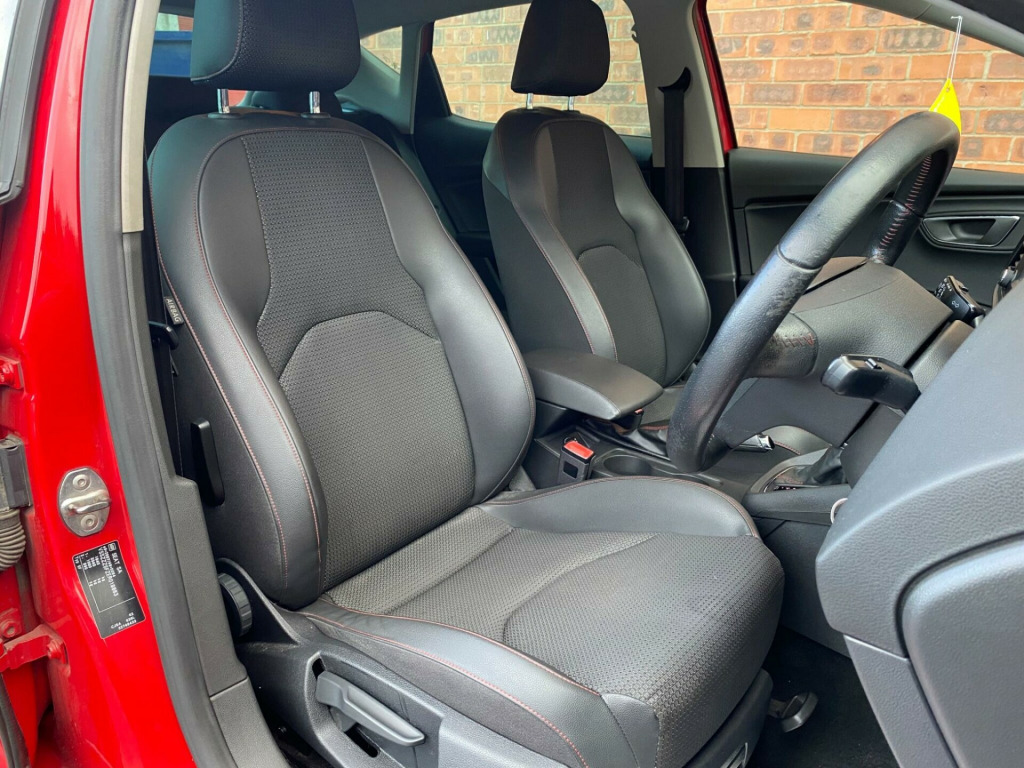 2 KEYS WITH SERVICE HISTORYGEARBOX RECONDITIONED WITH NEW OIL+FILTER, SERVICE INTERVALS AT 8K, 15K, 21K, 26K, 31K, 58K, 82KGEARBOX RECON,RECEIPTS TO PROVE GEARBOX REPAIR AND WARRANTY WITH GEARBOXThis 2013 SEAT Leon TSI FR offers an exhilarating driving experience, boasting a swift 0-62mph acceleration time of just 7.2 seconds. Under the bonnet, you'll find a responsive 1.8 litre petrol engine, compliant with Euro 6 emissions standards. This FR trim level comes equipped with practical parking sensors, both front and rear, complete with an optical parking system to aid manoeuvring. Stay comfortable on every journey with dual zone climate control, allowing you to set individual temperatures for both driver and passenger. Connectivity is made simple with integrated Bluetooth, enabling handsfree calls and audio streaming.The generous boot space ensures you have ample room for luggage or shopping, making this Leon a versatile choice for everyday life. The combination of its sporty performance, advanced parking aids, and convenient technology sets this SEAT Leon apart from others in its class, offering a refined and enjoyable drive. v power supply in centre console - front, 17in alloy wheels - dynamic, 3.5in monochrome drivers display, aux-in port, active front head restraints, airbags - curtain, airbags - driver, airbags - front passenger, alarm - perimeter tow away protection, ambient spot lighting and footwell illumination, anti-lock braking system - abs, armrest - front with storage compartment, bluetooth audio streaming, body-coloured door handles, bumpers - exclusive fr front and rear, child locks on rear doors, cruise control, cupholders - front x2, dark tinted rear windows, daytime running lights, deadlocks, door mirrors - with integrated led indicators, door sill trim - aluminium, drivers knee airbag, drivers seat lumbar adjustment, dual zone climate control, dust and pollen filter, eba - electronic brake assist, electric windows - front and rear with one-touch and anti-squeeze, electrically folding door mirrors, electrically folding and heated door mirrors, electro-mechanical power steering - speed-sensitive, electronic differential lock system - xds, electronic stability control - esc, emergency tyre repair kit, exhaust pipe - twin chrome finished, exterior temperature indicator, fm-am radio, front fog lights with cornering function, front passenger airbag de-activation, front side airbags, fuel filler flap linked to central locking, gearshift indicator, gloss black b and c-pillars, head restraints - height adjustable front, head restraints - height adjustable rear x3, headlights - coming home function, headlights - twin halogen, height adjustable passenger seat, height and reach adjustable steering wheel, height-adjustable drivers seat, hill hold control, isofix points with top tether on rear seats, illuminated boot, illuminated glovebox, inserts - dash - chrome detailing, instrument lighting with brightness control, integrated bluetooth handsfree system, led taillights, leather handbrake, leatherette bolsters, lights left on warning buzzer, locking wheel bolts, low fuel warning light, luggage compartment - net, luggage compartment - rings, mp3 compatible cd player, parking sensors - front and rear with optical parking system, passenger door mirror with kerb function when reversing, radiator grille - chrome centre surround, reading light - front and rear, rear parking sensors, rear wiper, remote central locking, remote key - folding x2 with remote window functionality, sd card slot, seat drive profile - sport-comfort-eco-individual, seat logo tailgate release, seatbelt reminder - front, seats - passenger lumbar adjustment, seats - pockets on front backrest, seats - split folding rear, seats - sports, speakers x8, sports suspension, steering wheel - flat-bottomed perforated leather with red stitching and fr logo, steering wheel mounted audio and phone controls, storage box under front seat, sunvisors with illuminated vanity mirrors, sunvisors with vanity mirrors, tcs - traction control system, touch screen - colour 5in, trip computer, tyre pressure monitoring system, usb port