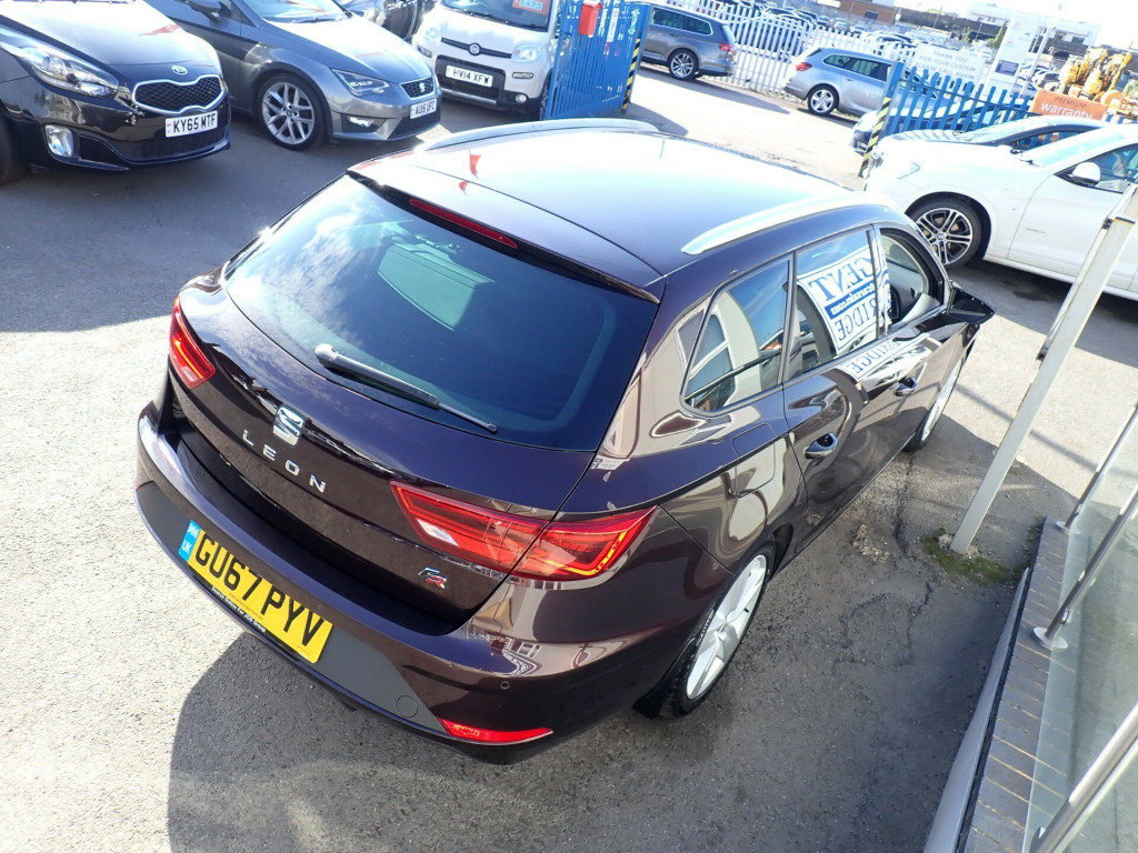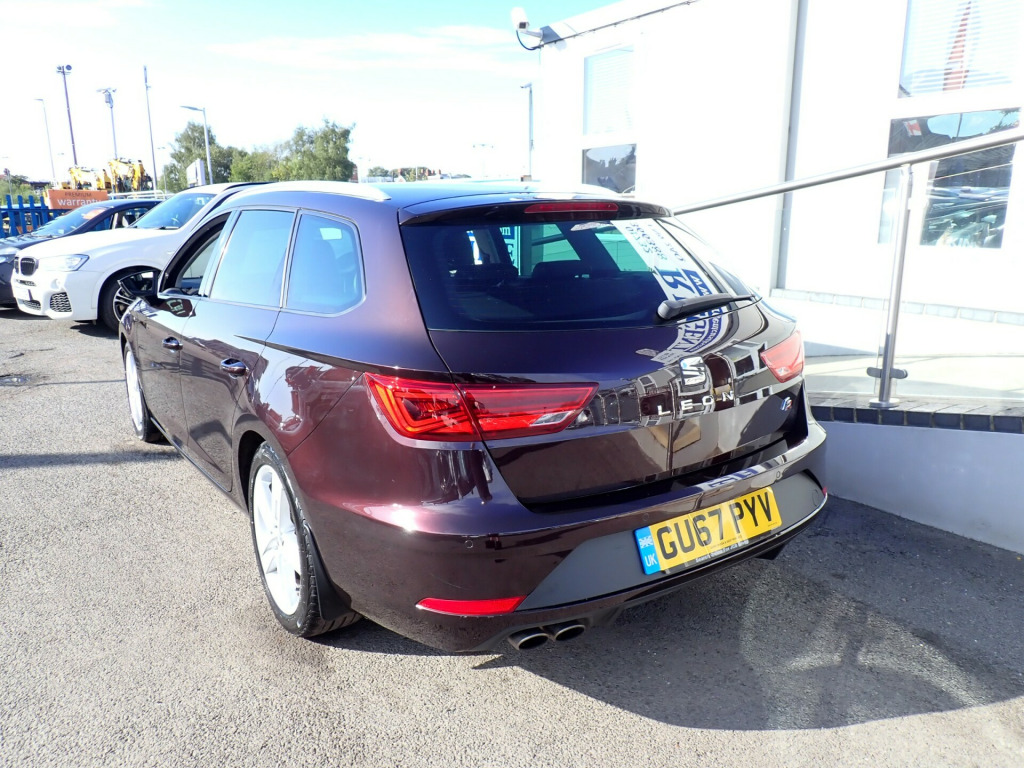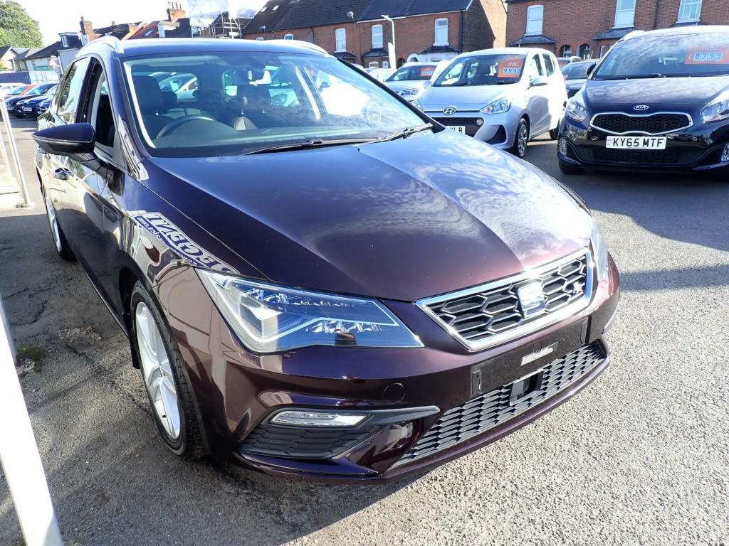 We are very pleased to offer this Boheme Purple 2017 Seat Leon FR Technology ST 5-door Estate. It's powered by the 1.8 litre TSi petrol engine with 6-speed manual transmission and has black leather / alcantara seats with red stitching and 17'' silver alloy wheels. It comes equipped with full smartphone Link, dual zone climate control, a leather flat bottomed FR steering wheel, satellite navigation, rear parking sensors, cruise control and much more. This being the estate model is has the extra practicality of a very generous boot with a retractable load cover, and roof rails. Additionally this Leon FR comes complete with a full service history, a spare wheel, 2 keys and the Seat book pack. Presented in excellent condition inside and out, it's available now for your viewing and test drive in Tonbridge where we are open 7 days a week. v power supply in centre console, media system plus, navigation system, seat full link smartphone integration - mirror link - apple carplay - google android auto, 17in alloy wheels - dynamic 30-2, body-coloured door handles, body-coloured door mirrors with integrated led indicators, bumpers - exclusive fr front and rear, dark tinted rear windows, electrically folding door mirrors, emergency tyre repair kit, front and rear electric windows, high gloss black b and c pillars, illuminated door sill plates, radiator grille frame in chrome, radiator grille in black, visual twin exhaust pipes, 2 boot storage net - left and right, active front head restraints and 3 rear head restraints, aluminium front door sill trims with fr logo, chrome loading sill, driver and passenger seat height adjustment, driver and passenger sunvisor with covered and illuminated mirrors, drivers seat lumbar adjustment, dual zone climate control, front seat back storage pockets, front sports seats, fuel filler flap linked to central locking, head restraints - height adjustable front, high centre console, illuminated glovebox, instrument lighting with brightness control, interior chrome detailing, luggage compartment cover, multi coloured ambient lighting, reading lights front and rear with ambient spots - boot lights and illuminated foot area, seats - passenger lumbar adjustment, split folding rear seats - 60-40, steering wheel - flat-bottomed perforated leather with red stitching and fr logo, storage box under drivers seat, 7 airbags, abs - anti-lock braking system - tcs - traction control system, esc - electronic stability control and tyre pressure warning light indicator, electric parking brake including autohold function, front assist with city emergency braking, hill hold control, isofix points in outer rear seats with top tether anchorage points, multi-collision braking system, remote central locking with deadlocks, seatbelt reminder - front, two remote keys with window open-close - door mirror folding and boot opening functionality, cruise control, electro-mechanical power steering, electronic differential lock system - xds, gearshift indicator, low fuel warning light, outside temperature gauge, rpm counter, rear parking sensors, seat drive profile, sports suspension, trip computer, full led headlights, lights left on warning buzzer