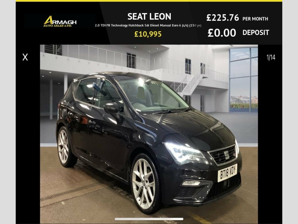 SEAT LEON 2.0 TDI FR 150BHP 5DR ??2018??70,677MILES??£10,995 ????12 MONTHS MOT ????TWO OWNERS FROM NEW ????LED INTERIOR ILLUMINATION PACK ????MULTI MEDIA INTERFACE ????SAT NAVIGATION ????8"TOUCH SCREEN ????PARKING SENSORS ????PARK ASSIST ????18" ALLOY WHEELS ….AND MUCH MORE ? EXTENDED WARRANTY OPTIONS AVAILABLE ? FINANCE AVAILABLE ?? CLICK AND DELIVER AVAILABLE ON REQUEST ???? ALL CREDIT/DEBIT CARDS ACCEPTED ???? ALL TRADE INS WELCOME ????Check out our 5 star google reviews ??OFFICE:02837528557 ????SHANE:07470186374 OR CALL IN AND SEE US???? 57 LISANALLY LANE ARMAGH BT617HF ????ALL FINANCE PACKAGES CAN BE ADJUSTED TO SUIT YOUR BUDGET???? ???????? ???????? https://www.armaghautosalesltd.co.uk/finance-application/7612612/apply?deposit=0&reference=34a12419-eb9d-4fb1-be70-b9f671949b67&term=60&mileage=0&facility_type=HP&credit_rating=excellent 12V Power Supply in Centre Console, 17in Alloy Wheels - Dynamic 30-2, 7 Airbags, ABS - Anti-Lock Braking System - TCS - T, Active Front Head Restraints and 3 Rear , Aluminium Front Door Sill Trims with FR , Body-Coloured Door Handles, Body-Coloured Door Mirrors with Integrat, Boot Storage Net, Bumpers - Exclusive FR Front and Rear, Cargo Rings in the Boot, Cruise Control, Dark Tinted Rear Windows, Driver and Passenger Seat Height Adjustm, Driver and Passenger Sunvisor with Cover, Drivers Seat Lumbar Adjustment, Dual Zone Climate Control, ESC - Electronic Stability Control and T, Electric Parking Brake Including Autohol, Electrically Folding Door Mirrors, Electro-Mechanical Power Steering, El