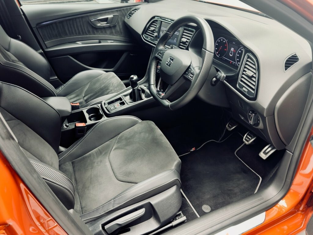 Finished in Eclipse Orange with CUPRA Bucket Seats - Alcantara with Simil Leather Bolsters - Black with White Accents. --- FACTORY SPEC --- This particular example boasts a great spec from the factory including; SEAT Sound System / 19" Cupra Machined alloy wheels / DCC (Dynamic Chassis Control) / Winter Pack / Camera Pack / Front & Rear Parking Sensors / Mechanical Limited Slip Differential / Full Link Smartphone Integration with Mirror Link / Apple Car Play / Google Android Auto with USB cable for Apple and Android compatibility / Keyless Entry and Go - KESSY and Wireless Phone Charger / Adaptive Cruise Control with Front Assist / Navigation system / Digital cockpit / Bluetooth / DAB Radio / Electrically Heated/Folding Door Mirrors / Auto Lights Wipers / Tyre Pressure Monitoring / Privacy Glass plus so much more. --- MODIFICATIONS --- Also benefits from some very tasteful visual and handling modifications carried out by its former keeper, these consist of: Eibach Lowering Springs / Powerflex Hybrid Dogbone Mount / Exhaust Res Delete / Maxton Spoiler Lip / Black Badges. --- SERVICE HISTORY --- All of this is topped with Full Service History, 8 services in total with the most recent being a Major with Spark Plugs carried out on 55,473 miles. Independent Multi-point health check just carried out showing a clean bill of health, tyres averaging 5.8 mm. MOT till 07/12/2026. Eibach Lowering Springs, Powerflex Hybrid Dogbone Mount, Exhaust Res Delete , Maxton Spoiler Lip , Black Badges, SEAT Sound System, CUPRA Bucket Seats - Alcantara with Simi, Eclipse Orange, Adaptive Cruise Control - ACC, Winter Pack, 12V Power Supply in Centre Console, 19in Alloy Wheels - CUPRA Machined, 7 Airbags, ABS - Anti-Lock Braking System - TCS - T, Active Front Head Restraints and 3 Rear , Black Interior Roof Lining, Body-Coloured Door Handles, Boot Storage Net, Brake Callipers - Red with Cupra Logo, Bumpers - Exclusive Cupra Front and Rear, CUPRA Performance Interface, Cargo Rings in the Boot, Convenience Pack Plus, Cruise Control, DCC - Dynamic Chassis Control, Dark Tinted Rear Win