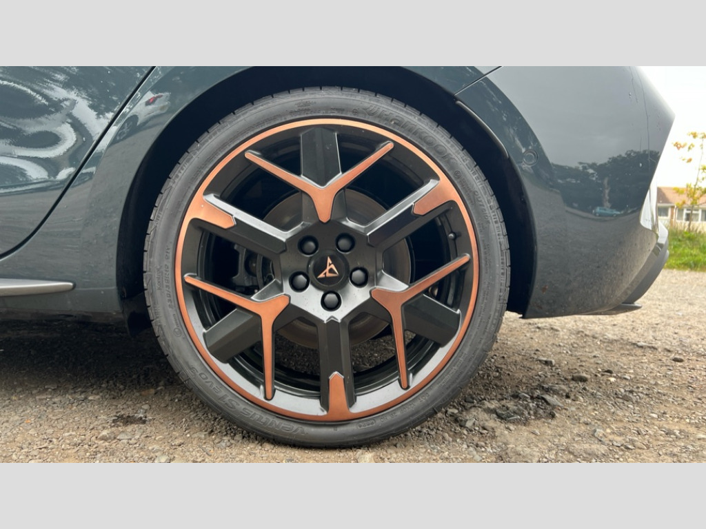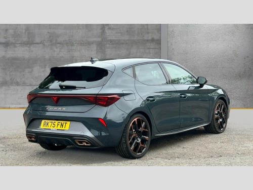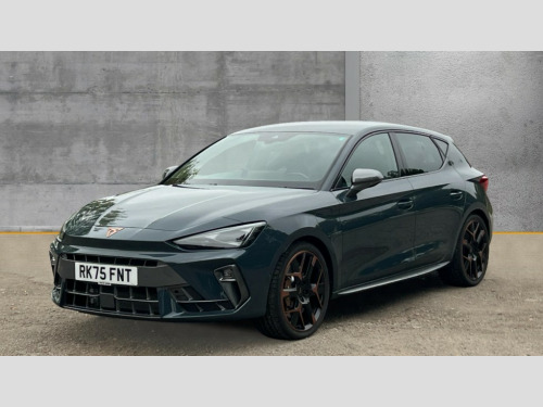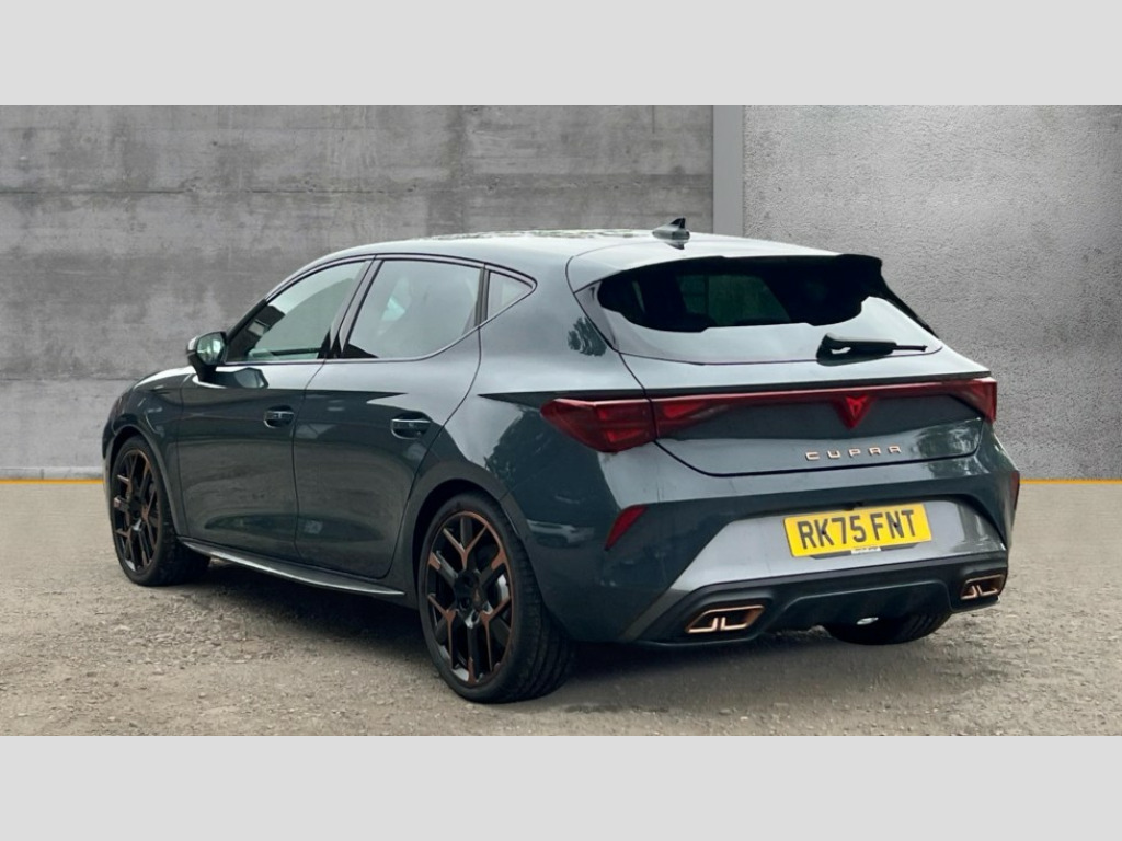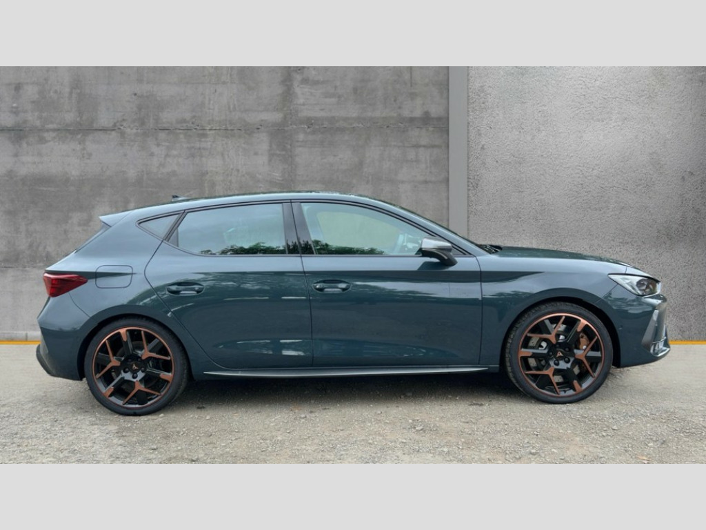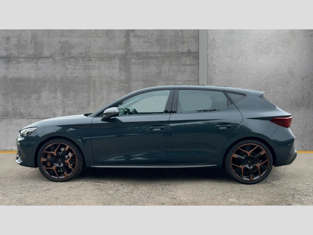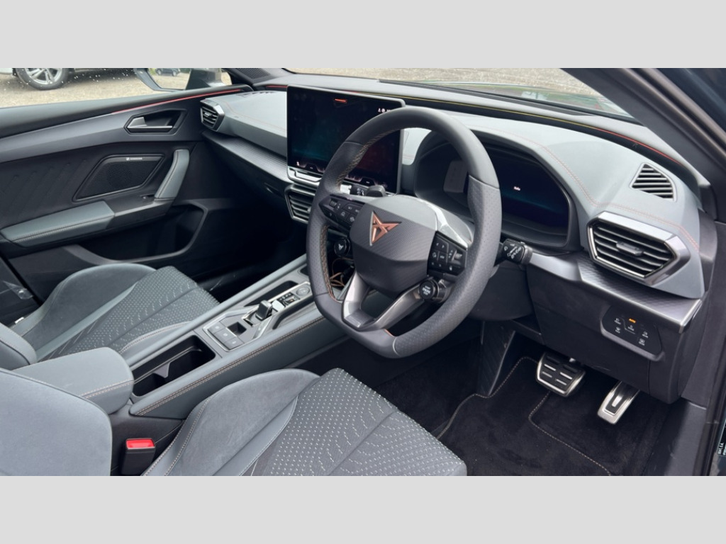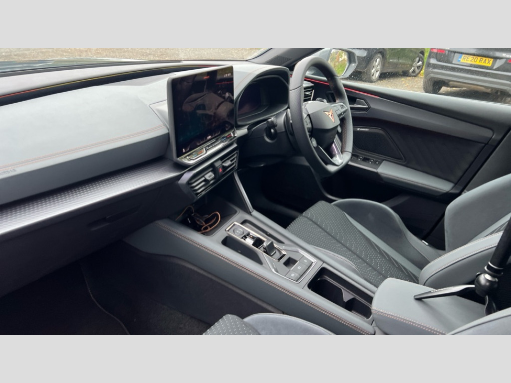 Cupra Leon 1.5 eHybrid 272 VZ3 5dr DSG Adaptive cruise control with follow-to-stop and speed limiter, CUPRA mode drive profile selection with throttle response and gearshift mode, Digital cockpit, Driver alert system with driver monitoring, Dynamic road sign display, E-call, Front and rear parking sensors, Front assist with forward collision warning braking reaction to vehicles, pedestrians and cyclists, Front cross traffic assist, Full link smartphone integration with Mirror Link, wireless Apple CarPlay and wired Google Android Auto, Intelligent park assist, Lane change assist with emergency assist, Lockable tailgate, Rear view camera, RPM, trip computer, outside temp gauge, instrument light brightness, low fuel warning light, lights on reminder, gearshift indicator, Service interval indicator, Side and exit assist, Start/stop system with regenerative braking, Wireless phone charger, 10 amp mode 2 charging cable, 16 amp mode 3 charging cable, Auxiliary input socket, Immersive by Sennheiser TM - 10 speakers, 1 central speaker, 1 subwoofer, Auto dimming rear view mirror, Black roof spoiler, Body colour door handles, Body coloured bumpers, Cupra matrix LED ultra headlight with variable light distribution, high definition LED w/signature w/ceremony, Cupra side skirts painted in obsidian black, Cupra sports bumpers, Dark tinted rear windows, Electric front/rear windows, Electrically adjustable, heated and folding door mirrors, High beam assist, High-resolution matrix beam plus digital projection, LED front fog lamps with cornering function, LED rear fog lamp, Rain sensing wipers, Rear diffuser with copper simulated exhaust pipes, Rear side wing doors, Rear wash/wipe, Separate daytime running light with automatic headlight control and coming home feature, Third brake light, Welcome light with logo projector in door mirrors, 12v power supply in centre console, 3 seat bench in 2nd row, 5 headrests, 60/40 split rear bench seat with armrest, Ambient lighting (glovebox, footwell, ambient lighting multicoloured), Black headlining, Cupra sports pedals, CUPRA Supersports, heated steering wheel with satellite buttons, Electrically adjustable driver seat and lumbar support with memory function + manually adjustable passenger seat, Folding boot cover, Four x USB Type C ports (2 in front and 2 in rear), Front and rear reading lights X 4, Front centre armrest, Heated front seats, Height/reach adjust steering wheel, Illuminated interior front door sills, Interior wraparound lighting, ISOFIX points in outer rear seats with top tether anchorage points, Single front passenger seat, Sunvisors with illuminated mirror, Textile cloth upholstery, Three zone climate control, Dynamic and comfort pack - Leon Cupra, Media system plus with 12.9" display + navigation pack - Leon Cupra, 3 point seatbelts on all rear seats, ABS, Brake control system - ESC and brake booster, Brembo performance brake calipers, Child proof door locks, Disc brakes in front, Driver and front passenger airbags with front passenger airbag de-activation, front side and curtain airbags, Electronic parking brake, Hill hold control, Knee airbags, Pre-crash front and rear seat belt tensioner, window closure and hazard lights, Rear disc brakes, Seat belt reminder for front and rear seats, Tiredness recognition system, Tyre pressure monitoring system, Anti theft alarm system with interior monitoring in cab, backup horn and towing protection, KESSY Advanced - Keyless start, keyless entry, Locking wheel bolts, Dark chrome interior detailing, 19" Hailstorm forged machined R black and copper alloy wheel with 91Y tyres, Breakdown kit, Tool kit