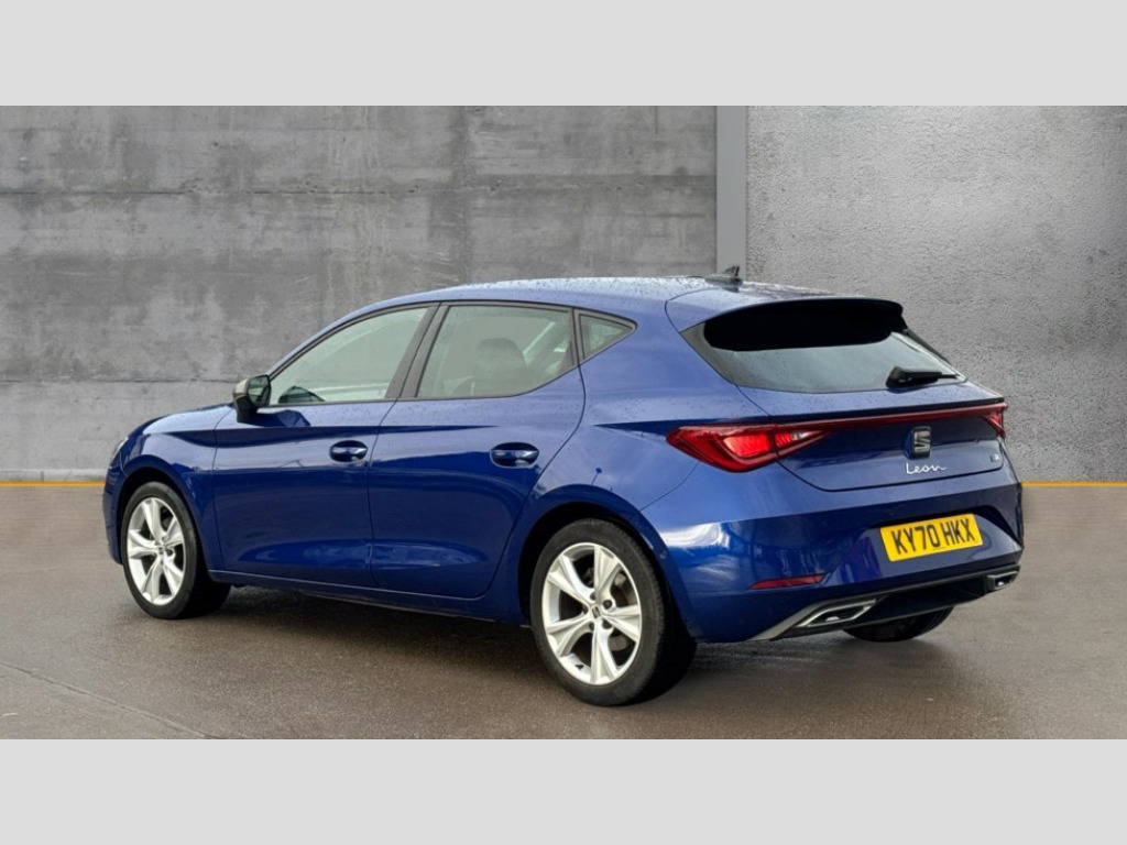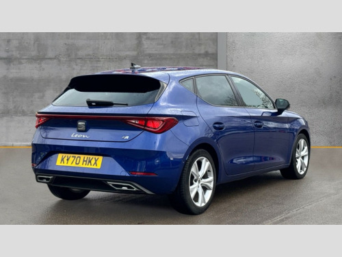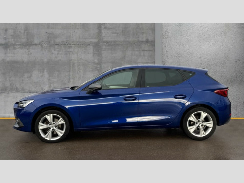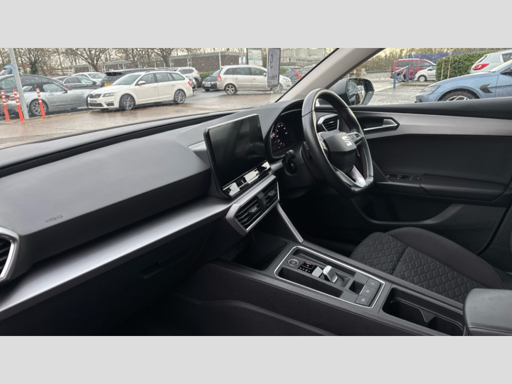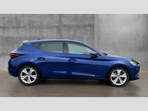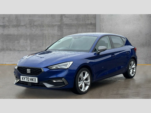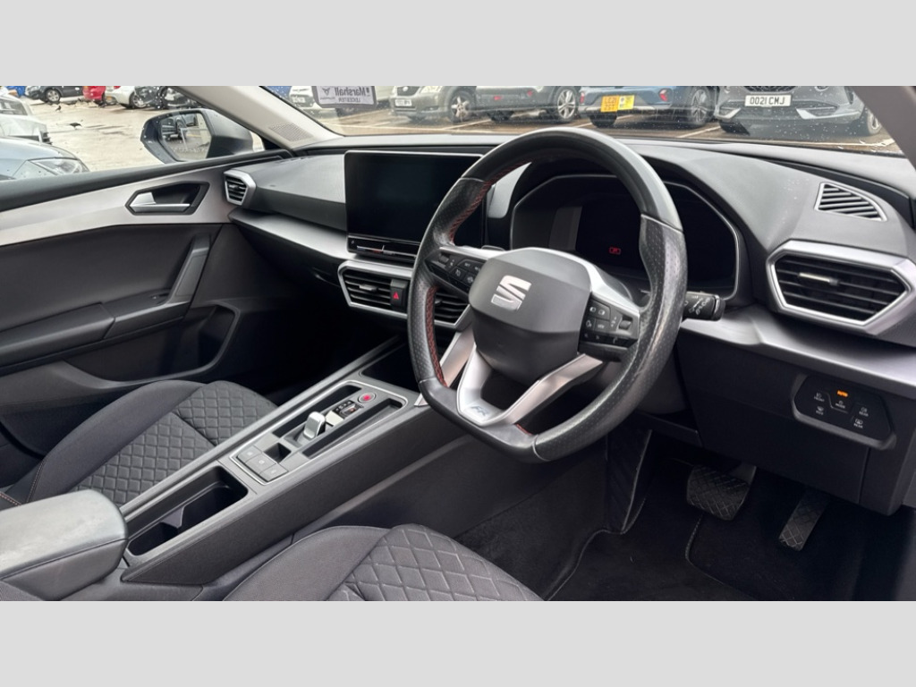 Seat Leon 1.5 eTSI 150 FR 5dr DSG Digital cockpit, Front assist with forward collision warning braking reaction to vehicles, pedestrians and cyclists, Full link smartphone integration with Mirror Link, wireless Apple CarPlay and wired Google Android Auto, Lane keeping system, Lockable tailgate, Park assist (inc front/rear parking sensors), Power assisted speed sensitive electro-mechanical steering, RPM, trip computer, outside temp gauge, instrument light brightness, low fuel warning light, lights on reminder, gearshift indicator, SEAT drive profile with 4 modes (Eco/Normal/Sport/Individual), throttle response and gearshift mode, Service interval indicator, Start/stop system with regenerative braking, Sports suspension, XDS electronic differential lock and dynamic traction support, Auxiliary input socket, Auto dimming rear view mirror, Body colour door handles, Body coloured bumpers, Cosmo grey exterior mirrors with integrated LED indicators, Dark tinted rear windows, Electric front/rear windows, Electrically adjustable, heated and folding door mirrors, FR sports bumper, Illuminated front door sill, LED front fog lamps with cornering function, LED headlights and tail lights with dynamic turn signals, welcome light silhouette from exterior mirrors and dynamic headlight range control, LED rear fog lamp, Rain sensing wipers, Rear wash/wipe, Separate daytime running light with automatic headlight control and coming home feature, 12v power point in centre console, 60/40 split rear bench seat with armrest, Ambient lighting in door trim, Cloth upholstery, Driver/passenger manual seat height adjustment, Dust/pollen filter, Folding boot cover, Front and rear height adjustable headrests, Front and rear reading lights X 4, Front centre armrest, Front seatback storage pockets, Height/reach adjust steering wheel, Interior lighting with LED lighting in sunvisor, glovebox and rear headlining, ISOFIX points in outer rear seats with top tether anchorage points, Luggage tie-down hooks, Lumbar adjustment for front seats, Sunvisors with covered illuminated mirror, Three zone climate control, Media system plus with navigation - Leon, 3 point seatbelts on all rear seats, ABS, Brake control system - ESC and brake booster, Child proof door locks, Driver and front passenger airbags with front passenger airbag de-activation, front side and curtain airbags, Electronic parking brake, Extended safety system - seat belt tensioner, window closure and hazard lights, Hill hold control, Rear disc brakes, Seat belt reminder for front and rear seats, Tiredness recognition system, driver alert system, Tyre pressure monitoring system, Anti theft alarm system with interior monitoring in cab, backup horn and towing protection, KESSY Go (Keyless start), Locking wheel bolts, Wireless phone charging, Chrome interior detailing, 17" Dynamic Bi-spoke alloy wheels with 91W tyres, Emergency tyre repair kit, Tool kit