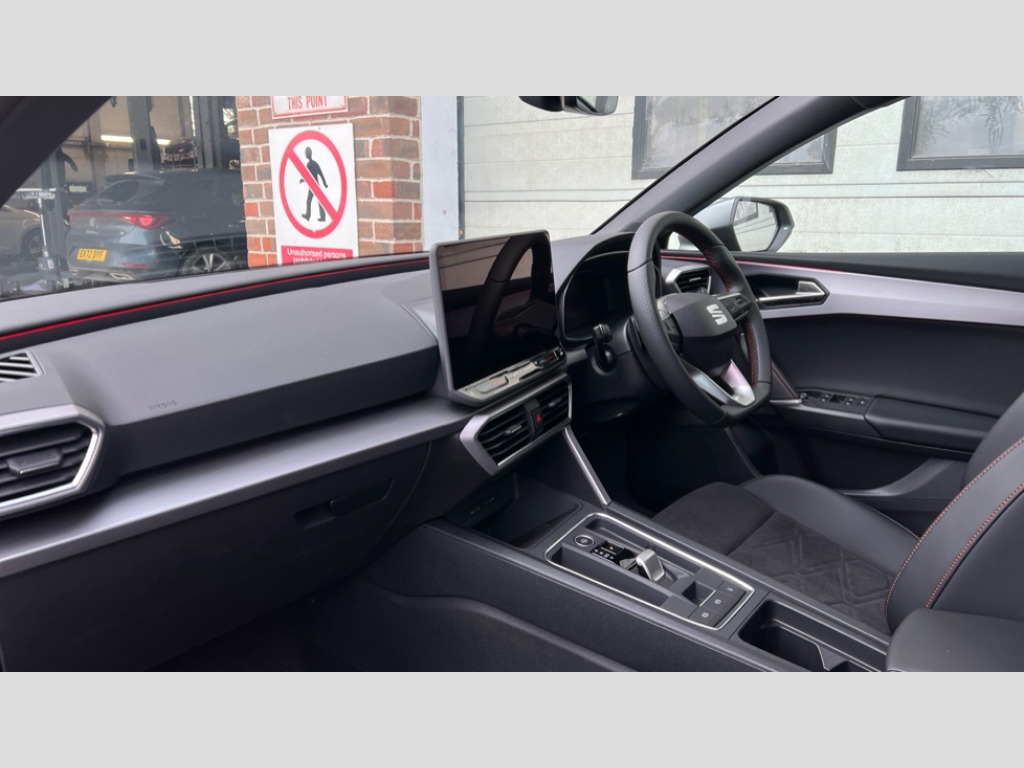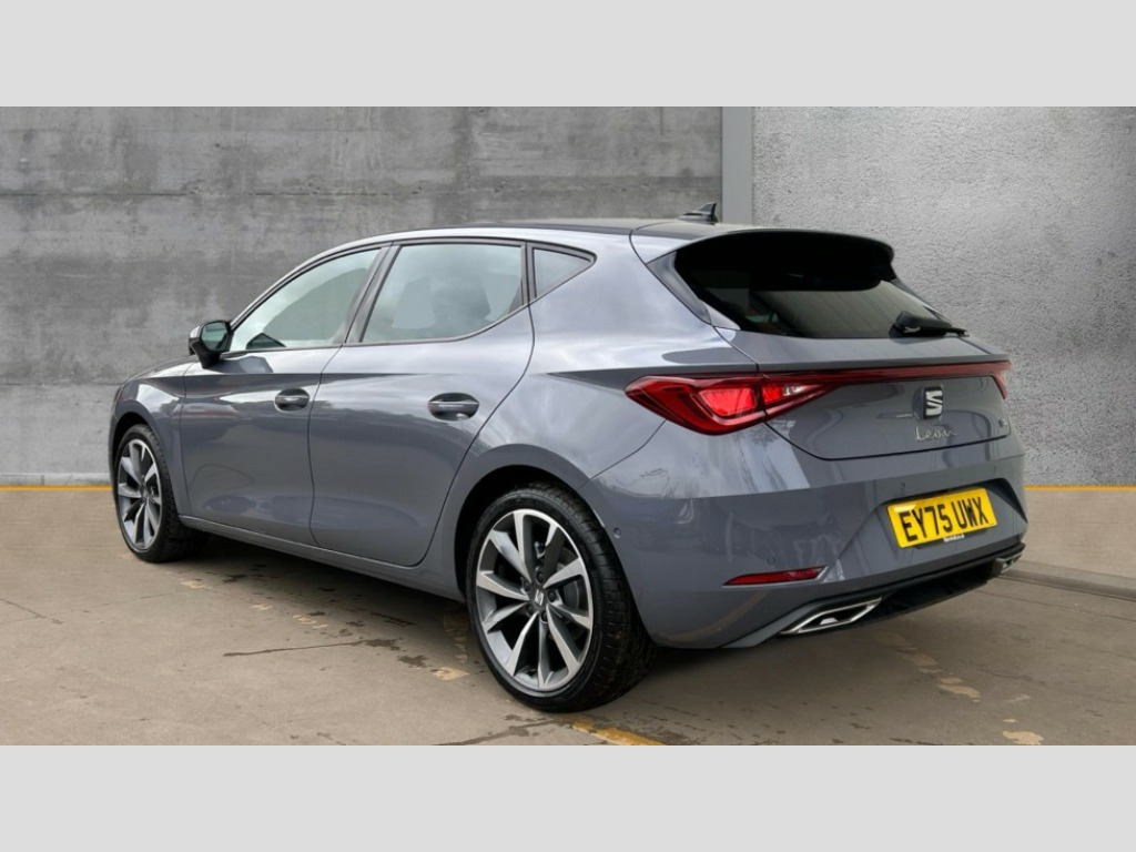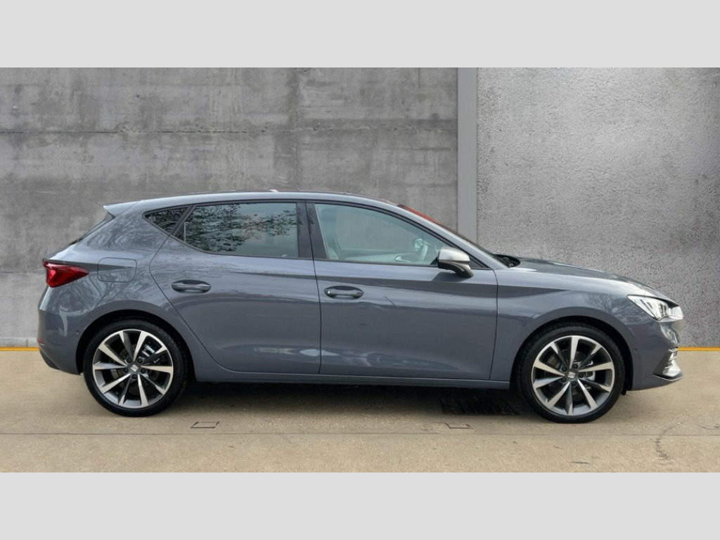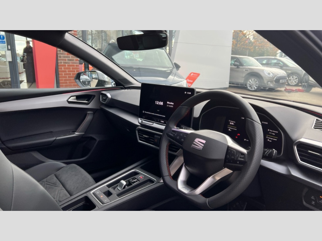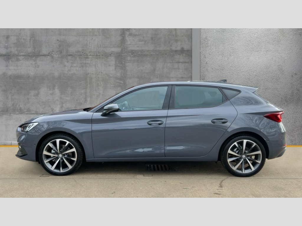Seat Leon 1.5 eTSI 150 FR Sport 5dr DSG Digital cockpit, E-call, Four x USB Type C ports, Front assist with forward collision warning braking reaction to vehicles, pedestrians and cyclists, Full link smartphone integration with Mirror Link, wireless Apple CarPlay and wired Google Android Auto, Lane assist, Lockable tailgate, Park assist (inc front/rear parking sensors), Power assisted speed sensitive electro-mechanical steering, Rear view camera, RPM, trip computer, outside temp gauge, instrument light brightness, low fuel warning light, lights on reminder, gearshift indicator, SEAT drive profile with 4 modes (Eco/Normal/Sport/Individual), throttle response and gearshift mode, Service interval indicator, Start/stop system with regenerative braking, Sports suspension, XDS electronic differential lock and dynamic traction support, 7 speakers, Auxiliary input socket, Auto dimming rear view mirror, Body colour door handles, Body coloured bumpers, Dark tinted rear windows, Door mirror LED indicator lights, Dynamic headlight range control, Electric adjustable/heated/folding door mirrors with memory, Electric front/rear windows, FR sports bumper, Illuminated front door sill, LED front fog lamps, LED Headlights with dynamic turn signals, LED tail lights and rear fog lights with rear coast to coast lighting, Rear side wing doors, Rear wash/wipe, Separate daytime running light with automatic headlight control and coming home feature, Third brake light, Welcome light silhouette from exterior mirrors, Windshield wiper intermittent control with light/rain sensor, 12v power point in centre console, 3 seat bench in 2nd row, 60/40 split rear bench seat with armrest, Ambient lighting with glovebox, footwell and single monocolour, Black headlining, Dust/pollen filter, Folding boot cover, Front and rear height adjustable headrests, Front and rear reading lights X 4, Front centre armrest, Front seatback storage pockets, Heated front seats, Height/reach adjust steering wheel, Interior wraparound lighting (FR), ISOFIX points in outer rear seats with top tether anchorage points, Luggage tie-down hooks, Lumbar adjustment for front seats, Manual driver seat with memory and height adjustable passenger seat, Microsuede cloth upholstery, Single front passenger seat, Sunvisors with covered illuminated mirror, Three zone climate control, Media system plus with navigation - Leon, 3 point seatbelts on all rear seats, ABS, Brake control system - ESC and brake booster, Child proof door locks, Driver and front passenger airbags with front passenger airbag de-activation, front side and curtain airbags, Electronic parking brake, Extended safety system - seat belt tensioner, window closure and hazard lights, Hill hold control, Rear disc brakes, Seat belt reminder for front and rear seats, Tiredness recognition system, driver alert system, Tyre pressure monitoring system, Anti theft alarm system with interior monitoring in cab, backup horn and towing protection, KESSY Go (Keyless start), Locking wheel bolts, Wireless phone charging, Chrome interior detailing, 18" Performance machined alloy wheels with 92Y tyres, Tool kit