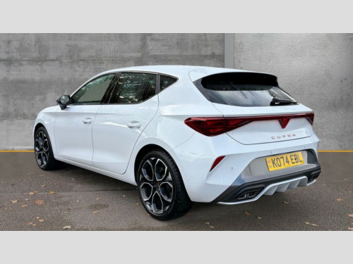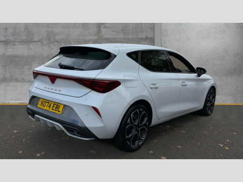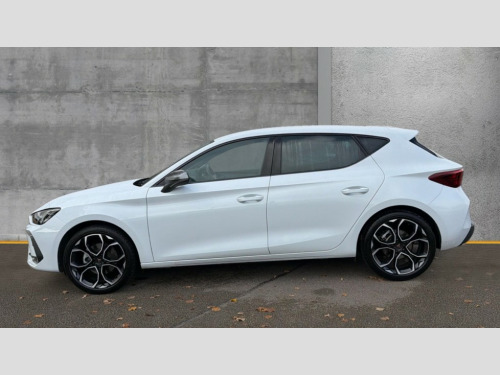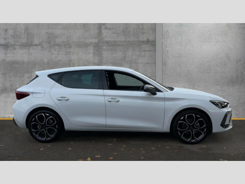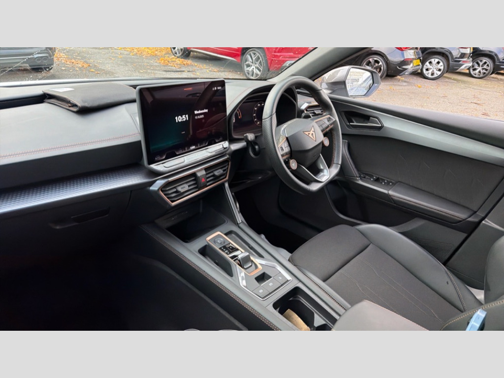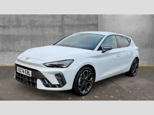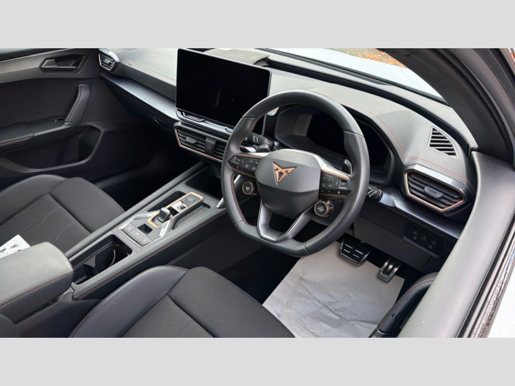 Cupra Leon 1.5 eTSI 150 V1 5dr DSG Adaptive cruise control with follow-to-stop and speed limiter, CUPRA drive profile selection with (Comfort/Sport/Individual), throttle response and gearshift mode, Digital cockpit, Dynamic road sign display, E-call, Four x USB Type C ports (2 in front and 2 in rear), Front and rear parking sensors, Front assist with forward collision warning braking reaction to vehicles, pedestrians and cyclists, Full link smartphone integration with Mirror Link, wireless Apple CarPlay and wired Google Android Auto, Lane assist, Lockable tailgate, PAS, RPM, trip computer, outside temp gauge, instrument light brightness, low fuel warning light, lights on reminder, gearshift indicator, Service interval indicator, Start/stop system with regenerative braking, Wireless phone charger, 7 speakers, Auxiliary input socket, Auto dimming rear view mirror, Body colour door handles, Body coloured bumpers, Cupra sports bumpers, Dark tinted rear windows, Electric front/rear windows, Electrically adjustable, heated and folding door mirrors, High beam assist, LED front fog lamps with cornering function, LED headlights with dynamic turn signals, tail lights, rear fog lights with rear coast to coast lighting, LED rear fog lamp, Rain sensing wipers, Rear side wing doors, Rear wash/wipe, Separate daytime running light with automatic headlight control and coming home feature, Third brake light, Welcome light with logo projector in door mirrors, 12v power supply in centre console, 3 seat bench in 2nd row, 5 headrests, 60/40 split rear bench seat with armrest, Ambient lighting with glovebox, footwell and single monocolour, Black headlining, Cloth/PVC upholstery, Cupra sports pedals, CUPRA Supersports, heated steering wheel with satellite buttons, Driver and passenger seat with manual height and lumbar adjustment, Folding boot cover, Front and rear reading lights X 4, Front centre armrest, Height/reach adjust steering wheel, Illuminated interior front door sills, ISOFIX points in outer rear seats with top tether anchorage points, Single front passenger seat, Storage pockets on rear of front seats, Sunvisors with illuminated mirror, Three zone climate control, Media system plus with 12.9" display + navigation pack - Leon Cupra, 3 point seatbelts on all rear seats, ABS, Brake control system - ESC and brake booster, Child proof door locks, Cupra black brake calipers, Driver and front passenger airbags with front passenger airbag de-activation, front side and curtain airbags, Electronic parking brake, Hill hold control, Rear disc brakes, Seat belt reminder for front and rear seats, Tiredness recognition system, Tyre pressure monitoring system, Anti theft alarm system with interior monitoring in cab, backup horn and towing protection, Central locking system Keyless Go, Locking wheel bolts, Chrome and copper interior detailing, 18" Windstorm machined sport black matt and silver alloy wheel with 92Y XL tyres, Tool kit