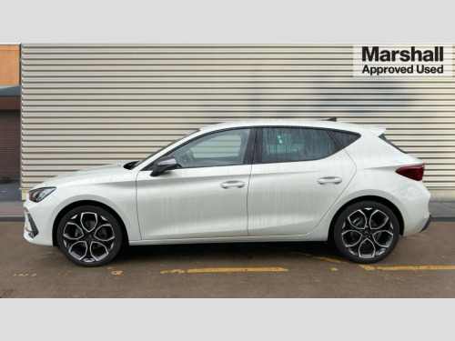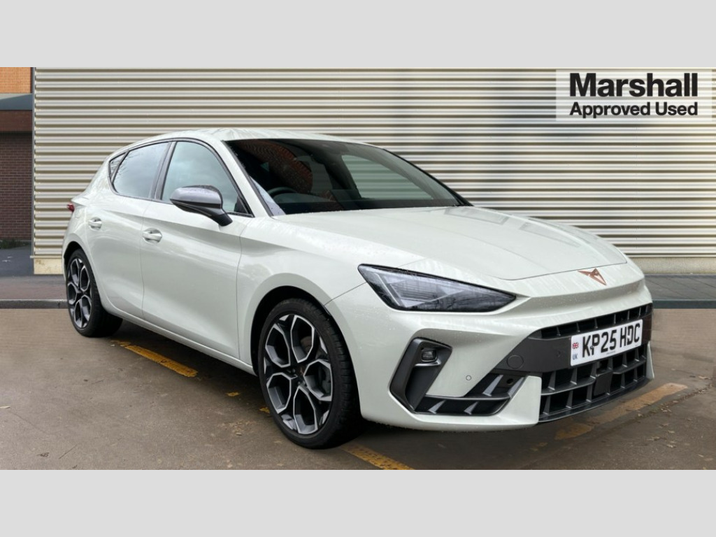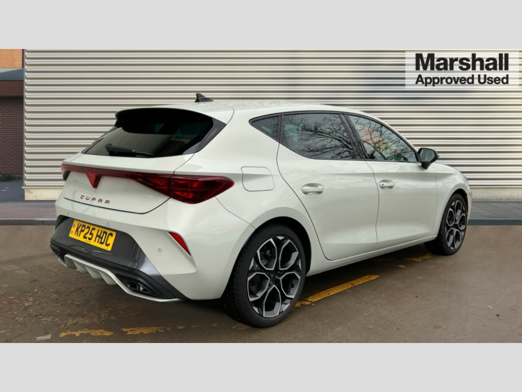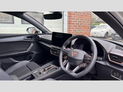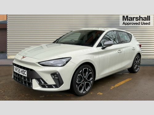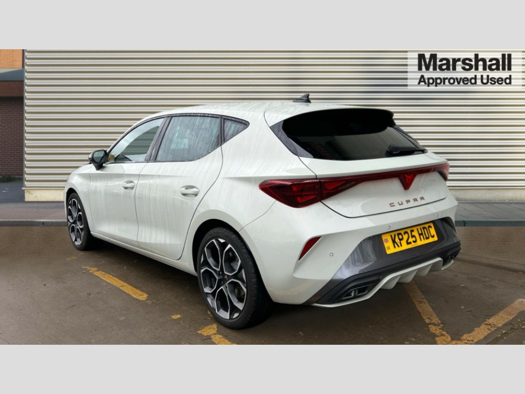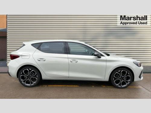 Cupra Leon 1.5 eTSI 150 V1 5dr DSG Adaptive cruise control with follow-to-stop and speed limiter, CUPRA drive profile selection with (Comfort/Sport/Individual), throttle response and gearshift mode, Digital cockpit, Dynamic road sign display, E-call, Four x USB Type C ports (2 in front and 2 in rear), Front and rear parking sensors, Front assist with forward collision warning braking reaction to vehicles, pedestrians and cyclists, Full link smartphone integration with Mirror Link, wireless Apple CarPlay and wired Google Android Auto, Lane assist, Lockable tailgate, PAS, RPM, trip computer, outside temp gauge, instrument light brightness, low fuel warning light, lights on reminder, gearshift indicator, Service interval indicator, Start/stop system with regenerative braking, Wireless phone charger, 7 speakers, Auxiliary input socket, Auto dimming rear view mirror, Body colour door handles, Body coloured bumpers, Cupra sports bumpers, Dark tinted rear windows, Electric front/rear windows, Electrically adjustable, heated and folding door mirrors, High beam assist, LED front fog lamps with cornering function, LED headlights with dynamic turn signals, tail lights, rear fog lights with rear coast to coast lighting, LED rear fog lamp, Rain sensing wipers, Rear side wing doors, Rear wash/wipe, Separate daytime running light with automatic headlight control and coming home feature, Third brake light, Welcome light with logo projector in door mirrors, 12v power supply in centre console, 3 seat bench in 2nd row, 5 headrests, 60/40 split rear bench seat with armrest, Ambient lighting with glovebox, footwell and single monocolour, Black headlining, Cloth/PVC upholstery, Cupra sports pedals, CUPRA Supersports, heated steering wheel with satellite buttons, Driver and passenger seat with manual height and lumbar adjustment, Folding boot cover, Front and rear reading lights X 4, Front centre armrest, Height/reach adjust steering wheel, Illuminated interior front door sills, ISOFIX points in outer rear seats with top tether anchorage points, Single front passenger seat, Storage pockets on rear of front seats, Sunvisors with illuminated mirror, Three zone climate control, Media system plus with 12.9" display + navigation pack - Leon Cupra, 3 point seatbelts on all rear seats, ABS, Brake control system - ESC and brake booster, Child proof door locks, Cupra black brake calipers, Driver and front passenger airbags with front passenger airbag de-activation, front side and curtain airbags, Electronic parking brake, Hill hold control, Rear disc brakes, Seat belt reminder for front and rear seats, Tiredness recognition system, Tyre pressure monitoring system, Anti theft alarm system with interior monitoring in cab, backup horn and towing protection, Central locking system Keyless Go, Locking wheel bolts, Chrome and copper interior detailing, 18" Windstorm machined sport black matt and silver alloy wheel with 92Y XL tyres, Tool kit