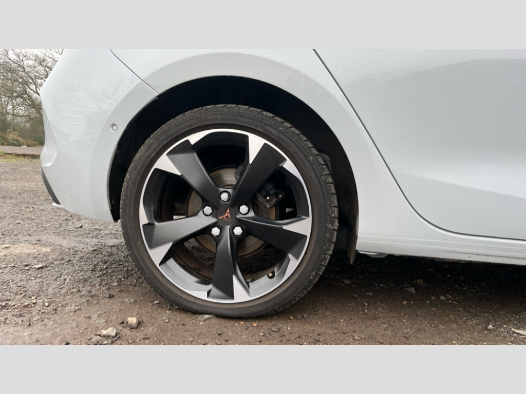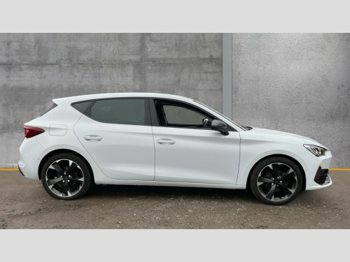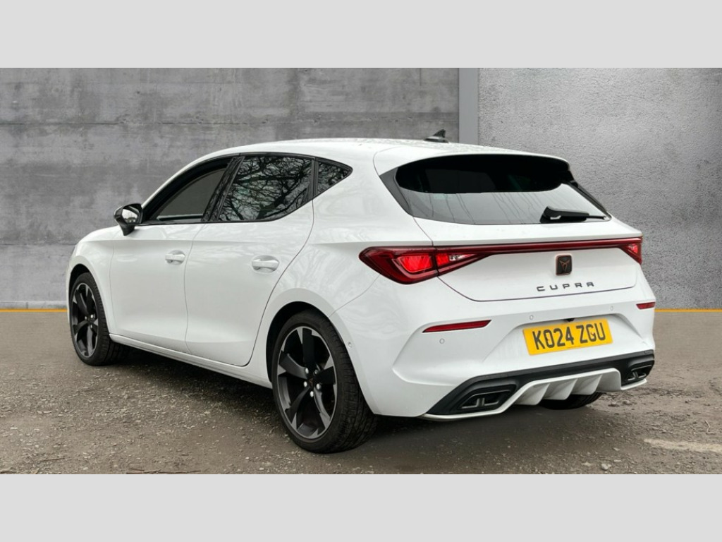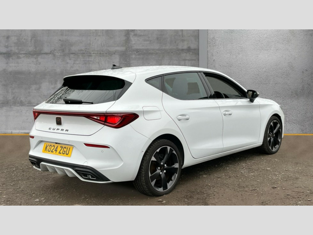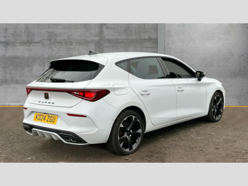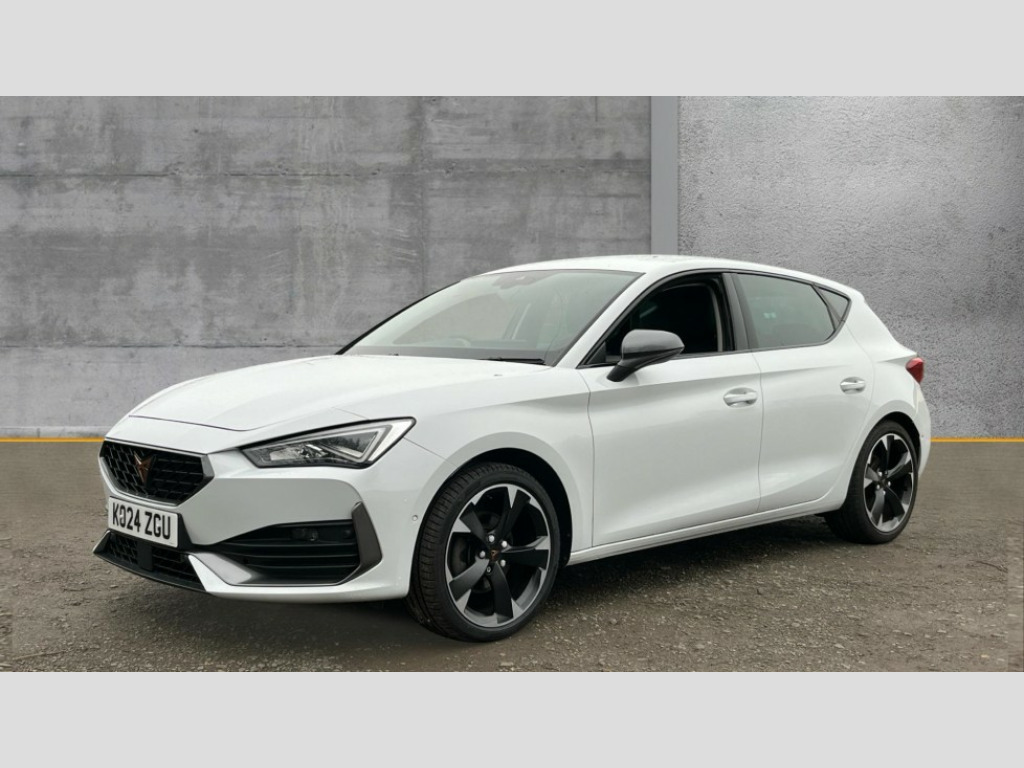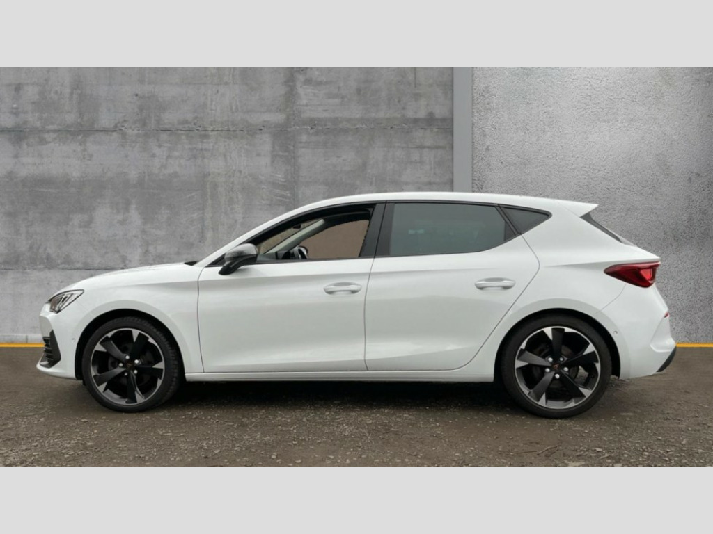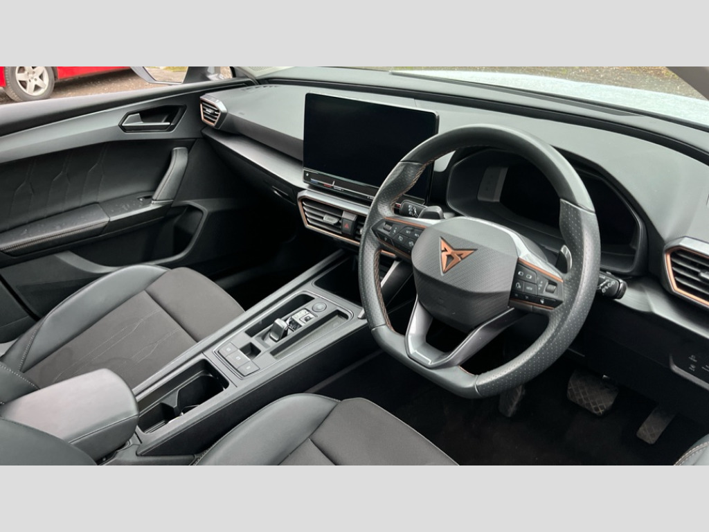 Cupra Leon 1.5 eTSI V1 5dr DSG CUPRA drive profile selection with (Comfort/Sport/Individual), throttle response and gearshift mode, Digital cockpit, E-call, Electro mechanical speed sensitive power steering, Front assist with forward collision warning braking reaction to vehicles, pedestrians and cyclists, Full link smartphone integration with Mirror Link, wireless Apple CarPlay and wired Google Android Auto, Lane assist, Lockable tailgate, Park assist (inc front/rear parking sensors), Rear view camera, RPM, trip computer, outside temp gauge, instrument light brightness, low fuel warning light, lights on reminder, gearshift indicator, Service interval indicator, Start/stop system with regenerative braking, Wireless phone charger, Sports suspension, Auxiliary input socket, Auto dimming rear view mirror, Body colour door handles, Body coloured bumpers, Cupra sports bumpers, Dark tinted rear windows, Electric front/rear windows, Electrically adjustable, heated and folding door mirrors, LED front fog lamps with cornering function, LED headlights with dynamic turn signals, tail lights, rear fog lights with rear coast to coast lighting, Rain sensing wipers, Rear diffuser with twin exhaust pipe on each side, Rear side wing doors, Rear wash/wipe, Separate daytime running light with automatic headlight control and coming home feature, Third brake light, 12v power supply in centre console, 3 seat bench in 2nd row, 5 headrests, 60/40 split rear bench seat with armrest, Ambient lighting with glovebox, footwell and single monocolour, CUPRA Leather flat bottomed, heated, perforated steering and gearshift paddles, Driver/passenger manual seat height adjustment, Folding boot cover, Four x USB Type C ports (2 in front and 2 in rear), Front and rear reading lights X 4, Front centre armrest, Front seats manual lumbar adjustment, Grey headlining, Height/reach adjust steering wheel, Illuminated interior front door sills, ISOFIX points in outer rear seats with top tether anchorage points, Jack and tool kit, PVC/Cloth upholstery with copper stitching, Single front passenger seat, Sports seats, Storage pockets on rear of front seats, Sunvisors with illuminated mirror, Three zone climate control, Media system plus with navigation pack - Leon Cupra, Safety and driving pack (M) - Cupra leon, 3 point seatbelts on all rear seats, ABS, Brake control system - ESC and brake booster, Child proof door locks, Cupra black brake calipers, Driver and front passenger airbags with front passenger airbag de-activation, front side and curtain airbags, Electronic parking brake, Extended safety system - seat belt tensioner, window closure and hazard lights, Hill hold control, Rear disc brakes, Seat belt reminder for front and rear seats, Tiredness recognition system, Tyre pressure monitoring system, Anti theft alarm system with interior monitoring in cab, backup horn and towing protection, KESSY Advanced - Keyless start, keyless entry, Locking wheel bolts, Chrome and copper interior detailing, 18" Machined sport black and silver alloy wheels with 92Y tyres