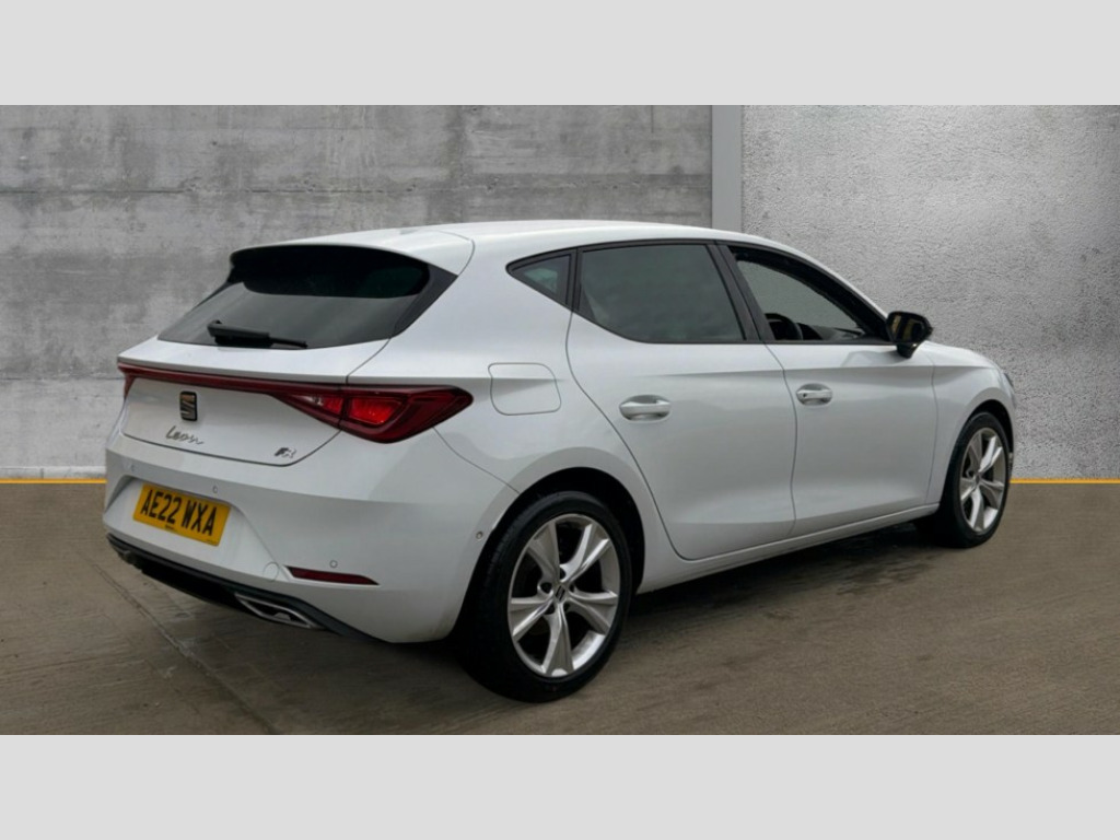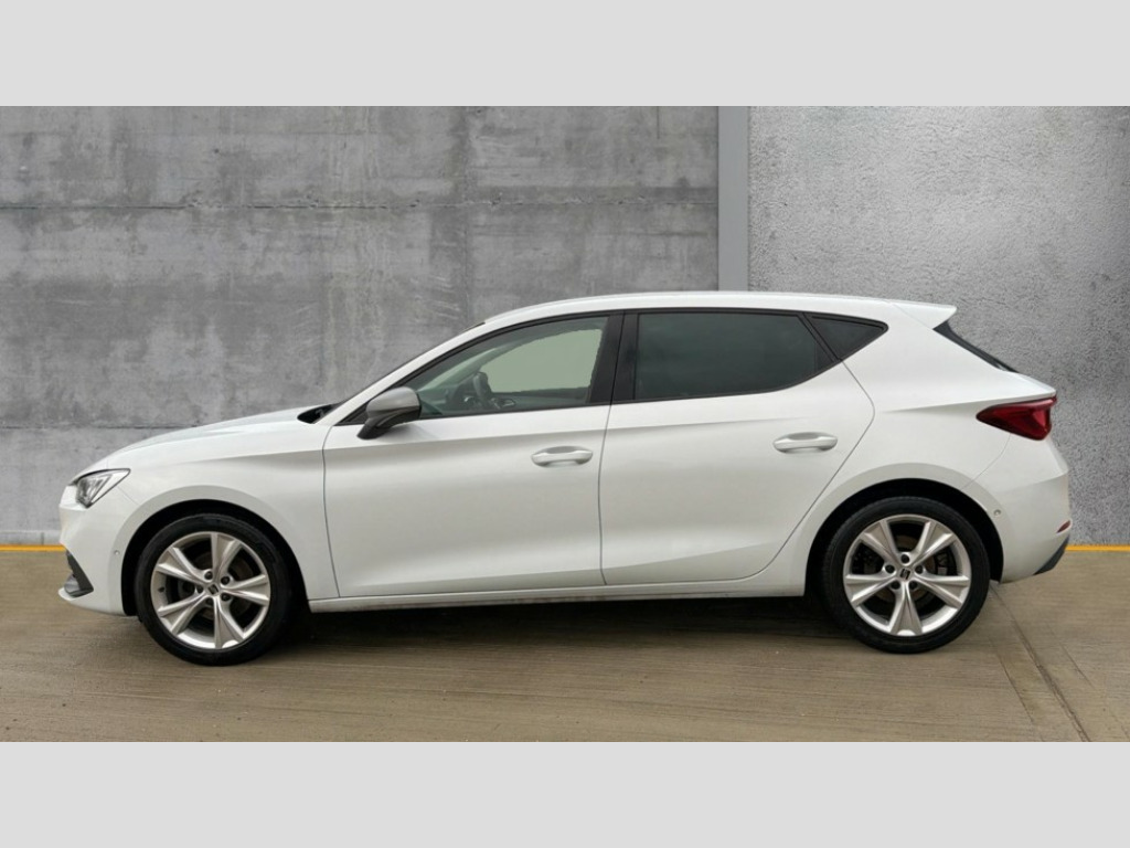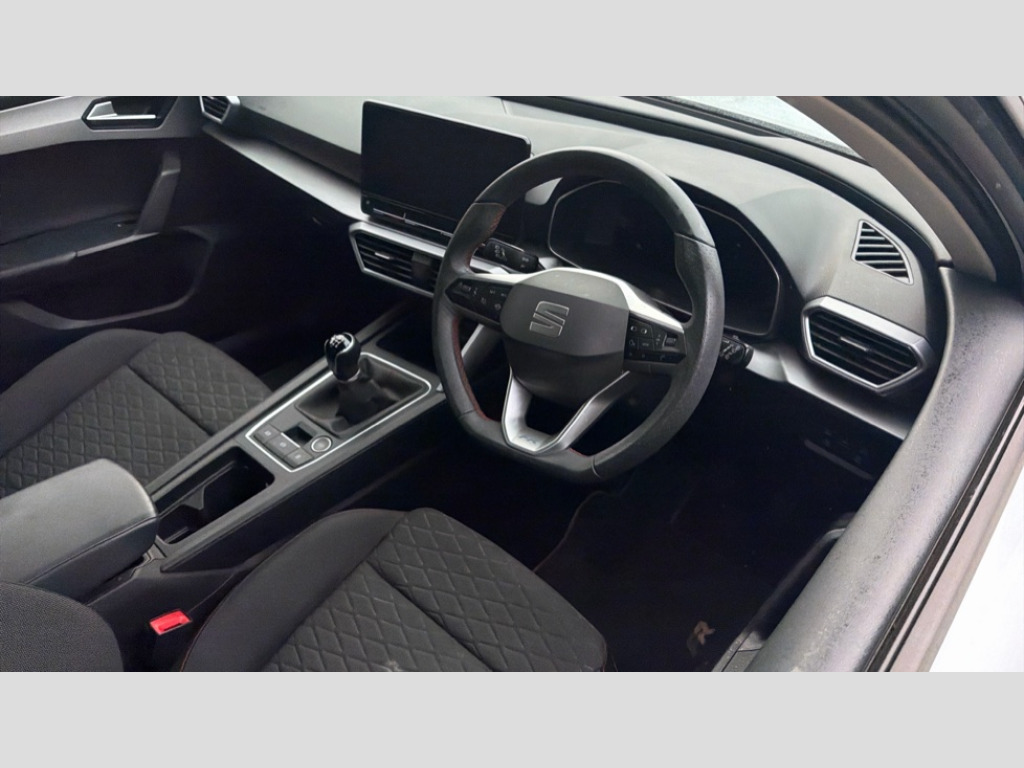 Seat Leon 1.5 TSI EVO FR 5dr Digital cockpit, E-call, Four x USB Type C ports, Front assist with forward collision warning braking reaction to vehicles, pedestrians and cyclists, Full link smartphone integration with Mirror Link, wireless Apple CarPlay and wired Google Android Auto, Lane assist, Lockable tailgate, Park assist (inc front/rear parking sensors), Power assisted speed sensitive electro-mechanical steering, RPM, trip computer, outside temp gauge, instrument light brightness, low fuel warning light, lights on reminder, gearshift indicator, SEAT drive profile with 4 modes (Eco/Normal/Sport/Individual), throttle response, Service interval indicator, Start/stop system with regenerative braking, Sports suspension, XDS electronic differential lock and dynamic traction support, 7 speakers, Auxiliary input socket, Auto dimming rear view mirror, Body colour door handles, Body coloured bumpers, Cosmo grey exterior mirrors with integrated LED indicators, Dark tinted rear windows, Electric front/rear windows, Electrically adjustable, heated and folding door mirrors, FR sports bumper, Illuminated front door sill, LED front fog lamps with cornering function, LED headlights and tail lights with dynamic turn signals, welcome light silhouette from exterior mirrors and dynamic headlight range control, LED rear fog lamp, Rain sensing wipers, Rear side wing doors, Rear wash/wipe, Separate daytime running light with automatic headlight control and coming home feature, Third brake light, 12v power point in centre console, 3 seat bench in 2nd row, 60/40 split rear bench seat with armrest, Ambient lighting with glovebox, footwell and single monocolour, Cloth upholstery, Driver/passenger manual seat height adjustment, Dust/pollen filter, Flat bottomed perforated leather steering wheel with red stitching and FR logo and leather gear stick, Folding boot cover, Front and rear height adjustable headrests, Front and rear reading lights X 4, Front centre armrest, Front seatback storage pockets, Height/reach adjust steering wheel, ISOFIX points in outer rear seats with top tether anchorage points, Luggage tie-down hooks, Lumbar adjustment for front seats, Single front passenger seat, Sunvisors with covered illuminated mirror, Three zone climate control, Media system plus with navigation - Leon, 3 point seatbelts on all rear seats, ABS, Brake control system - ESC and brake booster, Child proof door locks, Driver and front passenger airbags with front passenger airbag de-activation, front side and curtain airbags, Electronic parking brake, Extended safety system - seat belt tensioner, window closure and hazard lights, Hill hold control, Rear disc brakes, Seat belt reminder for front and rear seats, Tiredness recognition system, driver alert system, Tyre pressure monitoring system, Anti theft alarm system with interior monitoring in cab, backup horn and towing protection, KESSY Go (Keyless start), Locking wheel bolts, Wireless phone charging, Chrome interior detailing, 17" Dynamic Bi-spoke alloy wheels with 91W tyres, Tool kit