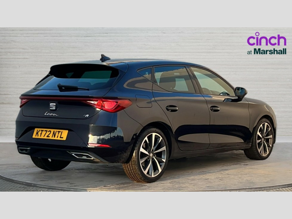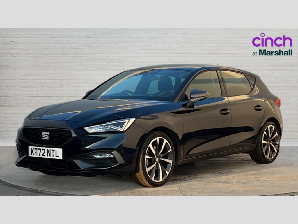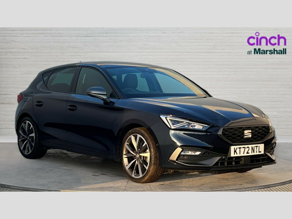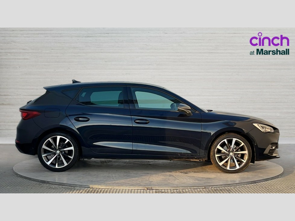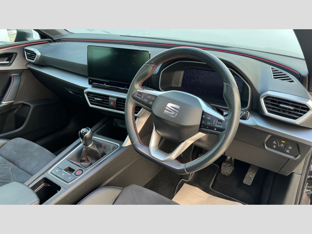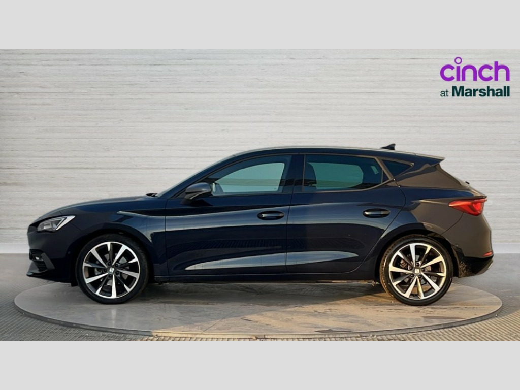 Seat Leon 1.5 TSI EVO FR Sport 5dr Digital cockpit, E-call, Four x USB Type C ports, Front assist with forward collision warning braking reaction to vehicles, pedestrians and cyclists, Full link smartphone integration with Mirror Link, wireless Apple CarPlay and wired Google Android Auto, Lane assist, Lockable tailgate, Park assist (inc front/rear parking sensors), Power assisted speed sensitive electro-mechanical steering, RPM, trip computer, outside temp gauge, instrument light brightness, low fuel warning light, lights on reminder, gearshift indicator, SEAT drive profile with 4 modes (Eco/Normal/Sport/Individual), throttle response, Service interval indicator, Start/stop system with regenerative braking, Sports suspension, XDS electronic differential lock and dynamic traction support, 7 speakers, Auxiliary input socket, Auto dimming rear view mirror, Body colour door handles, Body coloured bumpers, Dark tinted rear windows, Door mirror LED indicator lights, Electric adjustable/heated/folding door mirrors with memory, Electric front/rear windows, FR sports bumper, Illuminated front door sill, LED front fog lamps with cornering function, LED headlights and tail lights with dynamic turn signals, welcome light silhouette from exterior mirrors and dynamic headlight range control, LED rear fog lamp, Rain sensing wipers, Rear side wing doors, Rear wash/wipe, Separate daytime running light with automatic headlight control and coming home feature, Third brake light, 12v power point in centre console, 3 seat bench in 2nd row, 60/40 split rear bench seat with armrest, Ambient lighting with glovebox, footwell and single monocolour, Black headlining, Dust/pollen filter, Electric driver lumbar support + passenger manual lumbar support, Folding boot cover, Front and rear height adjustable headrests, Front and rear reading lights X 4, Front centre armrest, Front seatback storage pockets, Heated front seats, Heated leather steering wheel with leather gearstick, Height/reach adjust steering wheel, ISOFIX points in outer rear seats with top tether anchorage points, Luggage tie-down hooks, Microsuede cloth upholstery, Power driver seat with memory and manual height adjustable passenger seat, Single front passenger seat, Sunvisors with covered illuminated mirror, Three zone climate control, Wraparound lighting, Media system plus with navigation - Leon, 3 point seatbelts on all rear seats, ABS, Brake control system - ESC and brake booster, Child proof door locks, Driver and front passenger airbags with front passenger airbag de-activation, front side and curtain airbags, Electronic parking brake, Extended safety system - seat belt tensioner, window closure and hazard lights, Hill hold control, Rear disc brakes, Seat belt reminder for front and rear seats, Tiredness recognition system, driver alert system, Tyre pressure monitoring system, Anti theft alarm system with interior monitoring in cab, backup horn and towing protection, KESSY Go (Keyless start), Locking wheel bolts, Wireless phone charging, Chrome interior detailing, 18" Performance machined alloy wheels with 92Y tyres, Tool kit