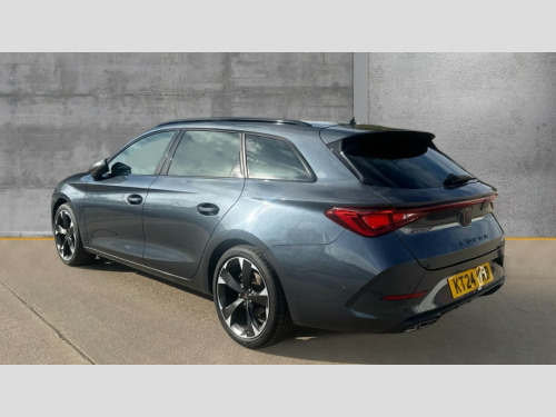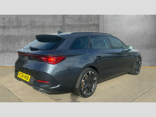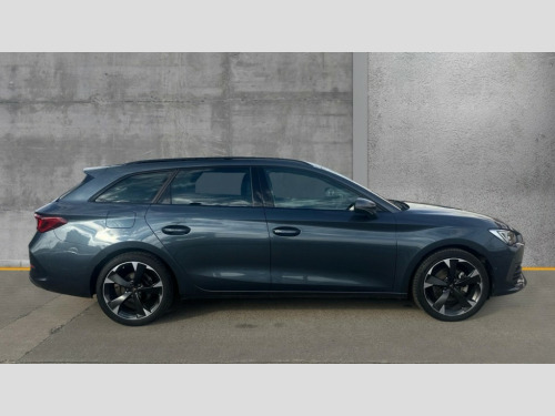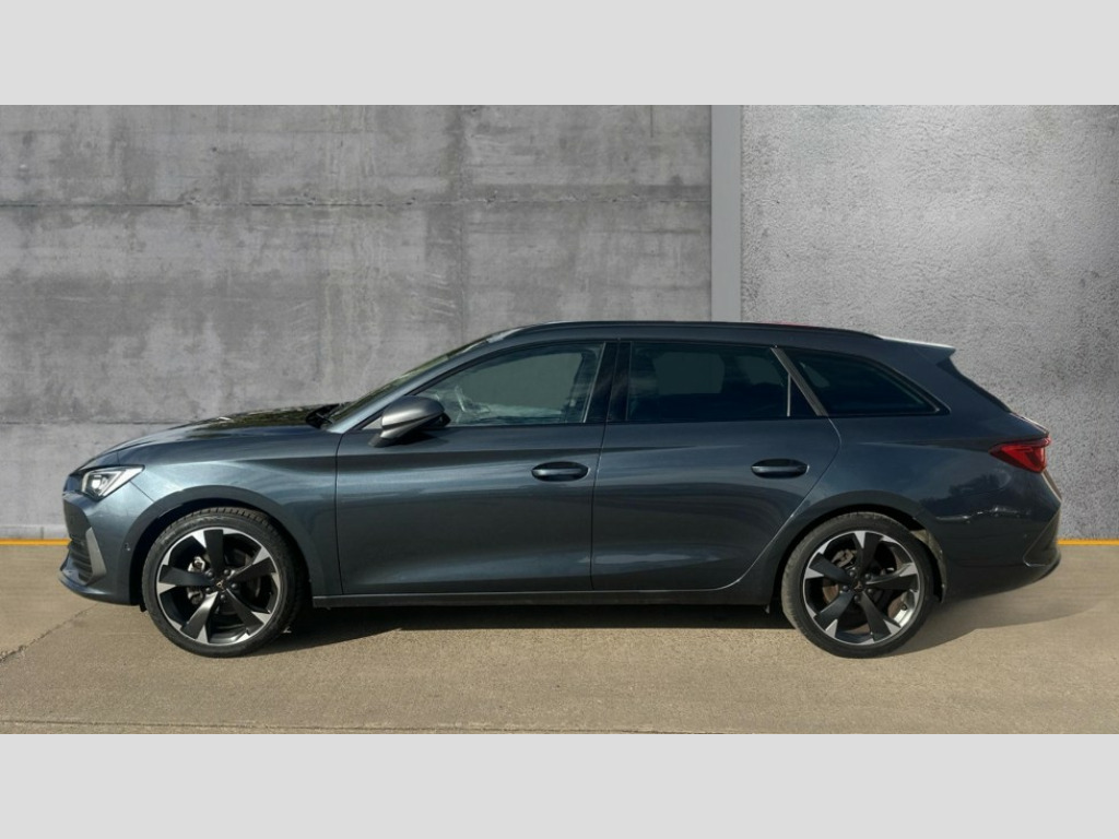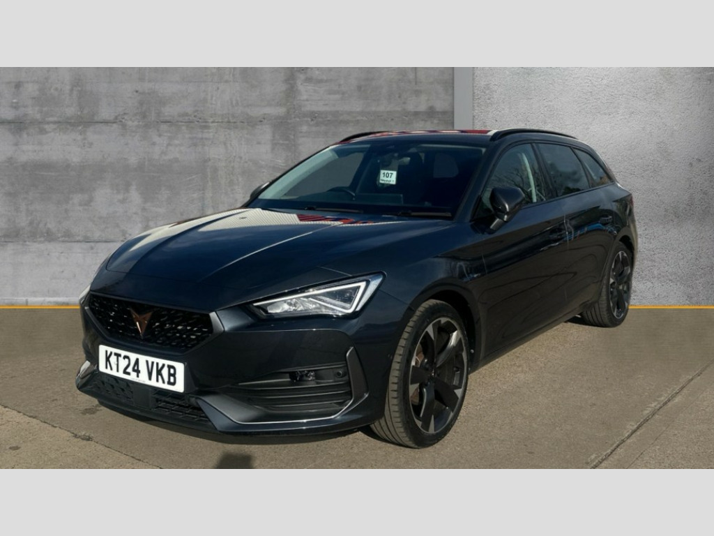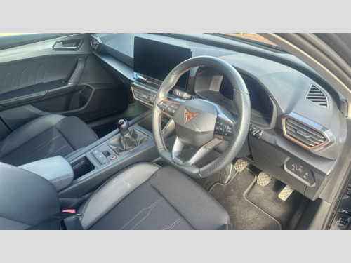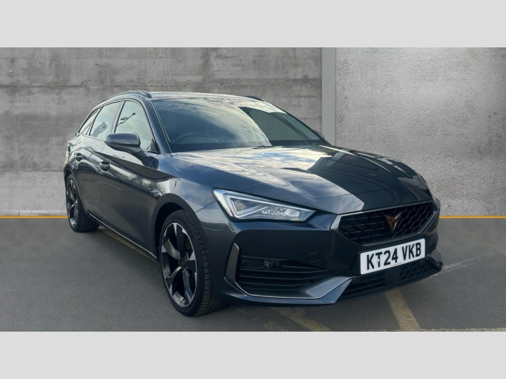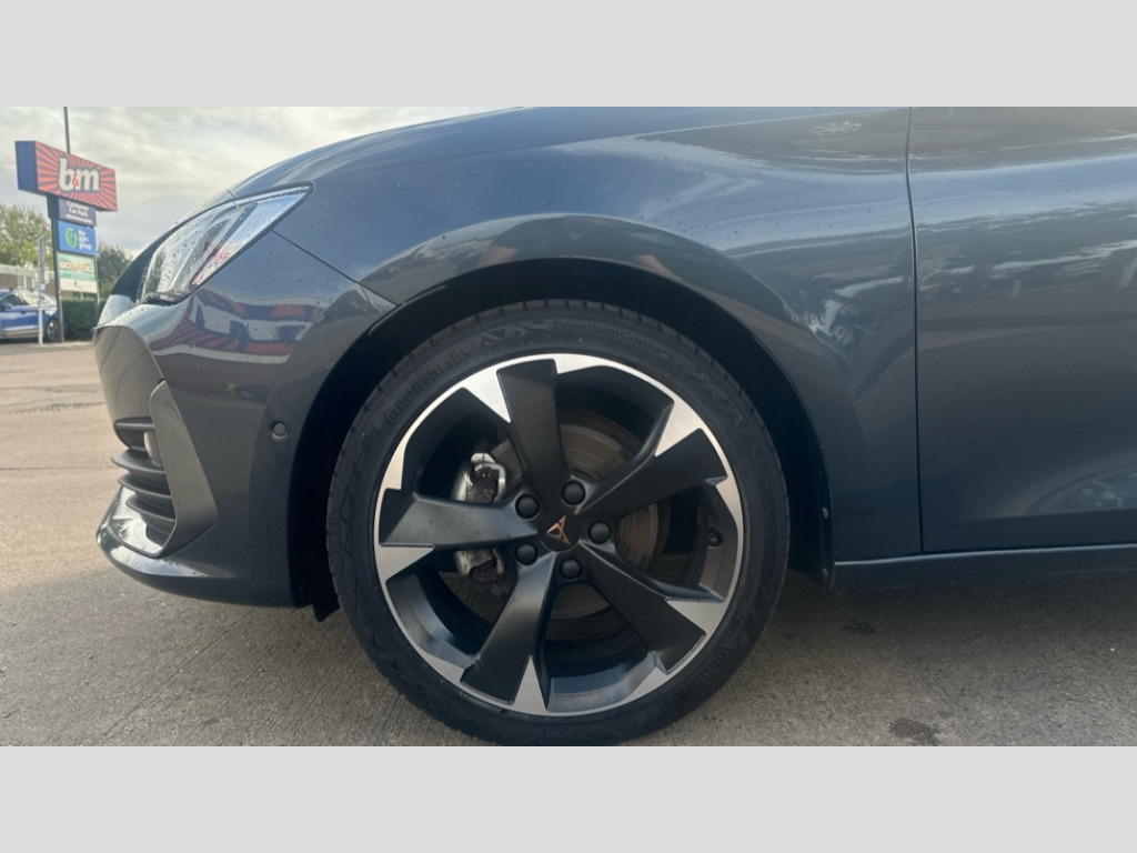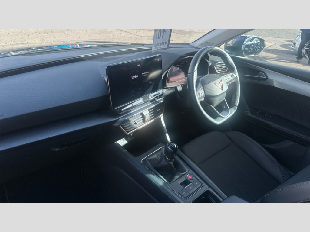 Cupra Leon 1.5 TSI V1 5dr CUPRA drive profile selection with (Comfort/Sport/Individual), throttle response and gearshift mode, Digital cockpit, E-call, Electro mechanical speed sensitive power steering, Four x USB Type C ports (2 in front and 2 in rear), Front assist with forward collision warning braking reaction to vehicles, pedestrians and cyclists, Full link smartphone integration with Mirror Link, wireless Apple CarPlay and wired Google Android Auto, Lane assist, Lockable tailgate, Park assist (inc front/rear parking sensors), Rear view camera, RPM, trip computer, outside temp gauge, instrument light brightness, low fuel warning light, lights on reminder, gearshift indicator, Service interval indicator, Start/stop system with regenerative braking, Wireless phone charger, Sports suspension, Auxiliary input socket, Auto dimming rear view mirror, Body colour door handles, Body coloured bumpers, Cupra sports bumpers, Dark tinted rear windows, Electric front/rear windows, Electrically adjustable, heated and folding door mirrors, Gloss black roof rails, LED front fog lamps with cornering function, LED headlights with dynamic turn signals, tail lights, rear fog lights with rear coast to coast lighting, Rain sensing wipers, Rear diffuser with twin exhaust pipe on each side, Rear side wing doors, Rear wash/wipe, Separate daytime running light with automatic headlight control and coming home feature, Third brake light, 12v power supply in centre console, 12v socket in loadspace, 3 seat bench in 2nd row, 5 headrests, 60/40 split rear bench seat with armrest, Ambient lighting with glovebox, footwell and single monocolour, Cupra Leather flat bottomed, perforated steering wheel, Driver/passenger manual seat height adjustment, Front and rear reading lights X 4, Front centre armrest, Front seats manual lumbar adjustment, Grey headlining, Height/reach adjust steering wheel, Illuminated interior front door sills, ISOFIX points in outer rear seats with top tether anchorage points, Jack and tool kit, PVC/Cloth upholstery with copper stitching, Single front passenger seat, Sliding boot cover, Sports seats, Sunvisors with illuminated mirror, Three zone climate control, Media system plus with navigation pack - Leon Cupra, Safety and driving pack (M) - Cupra leon, 3 point seatbelts on all rear seats, ABS, Brake control system - ESC and brake booster, Child proof door locks, Cupra black brake calipers, Driver and front passenger airbags with front passenger airbag de-activation, front side and curtain airbags, Electronic parking brake, Extended safety system - seat belt tensioner, window closure and hazard lights, Hill hold control, Rear disc brakes, Seat belt reminder for front and rear seats, Tiredness recognition system, Tyre pressure monitoring system, Anti theft alarm system with interior monitoring in cab, backup horn and towing protection, KESSY Advanced - Keyless start, keyless entry, Locking wheel bolts, Chrome and copper interior detailing, 18" Machined sport black and silver alloy wheels with 92Y tyres