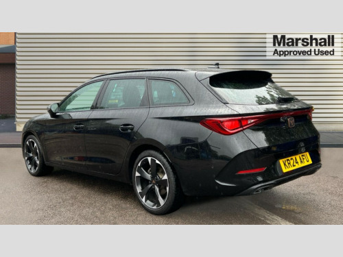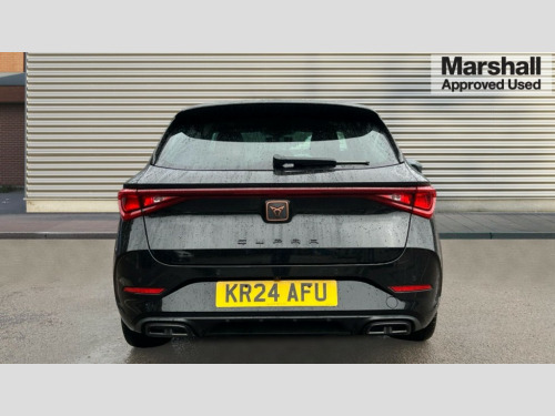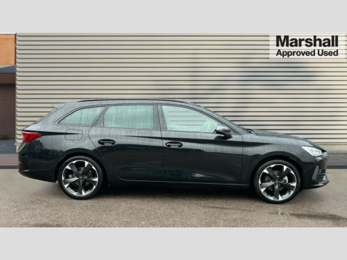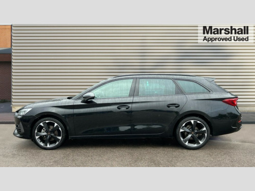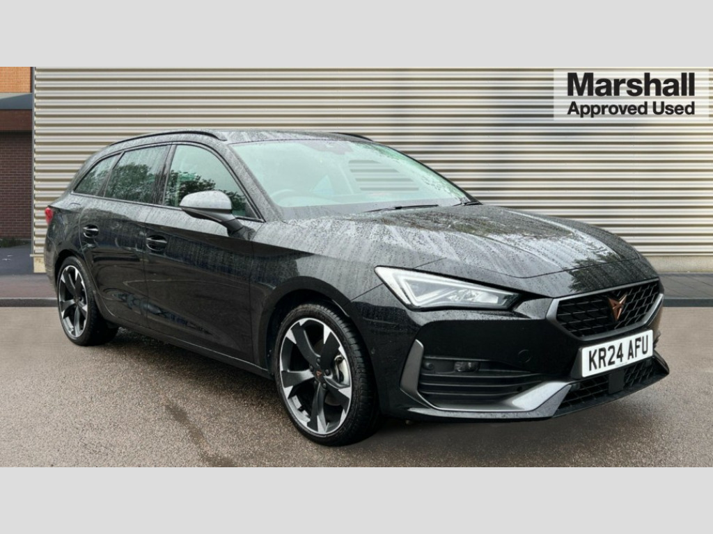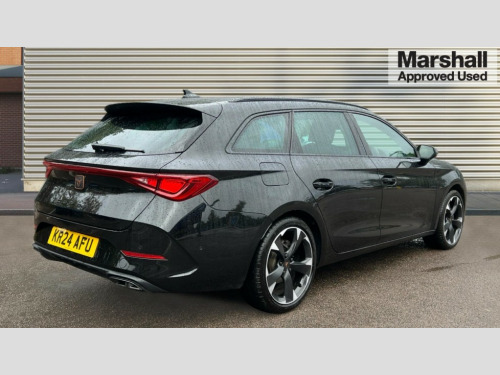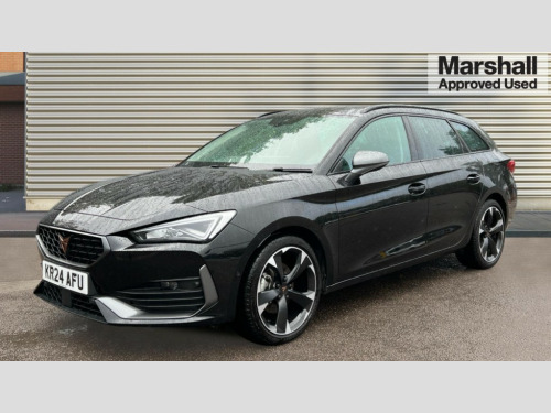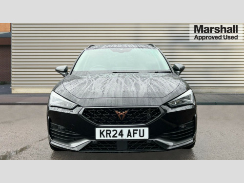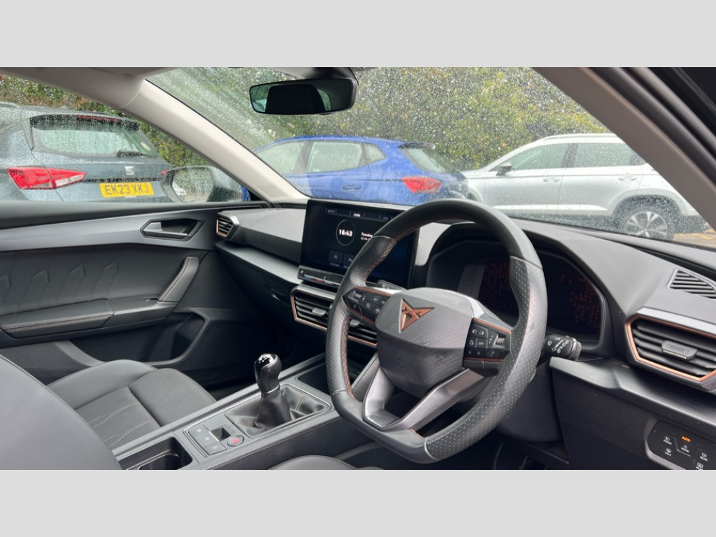 Cupra Leon 1.5 TSI V1 5dr CUPRA drive profile selection with (Comfort/Sport/Individual), throttle response and gearshift mode, Digital cockpit, E-call, Electro mechanical speed sensitive power steering, Four x USB Type C ports (2 in front and 2 in rear), Front assist with forward collision warning braking reaction to vehicles, pedestrians and cyclists, Full link smartphone integration with Mirror Link, wireless Apple CarPlay and wired Google Android Auto, Lane assist, Lockable tailgate, Park assist (inc front/rear parking sensors), Rear view camera, RPM, trip computer, outside temp gauge, instrument light brightness, low fuel warning light, lights on reminder, gearshift indicator, Service interval indicator, Start/stop system with regenerative braking, Wireless phone charger, Sports suspension, Auxiliary input socket, Auto dimming rear view mirror, Body colour door handles, Body coloured bumpers, Cupra sports bumpers, Dark tinted rear windows, Electric front/rear windows, Electrically adjustable, heated and folding door mirrors, Gloss black roof rails, LED front fog lamps with cornering function, LED headlights with dynamic turn signals, tail lights, rear fog lights with rear coast to coast lighting, Rain sensing wipers, Rear diffuser with twin exhaust pipe on each side, Rear side wing doors, Rear wash/wipe, Separate daytime running light with automatic headlight control and coming home feature, Third brake light, 12v power supply in centre console, 12v socket in loadspace, 3 seat bench in 2nd row, 5 headrests, 60/40 split rear bench seat with armrest, Ambient lighting with glovebox, footwell and single monocolour, Cupra Leather flat bottomed, perforated steering wheel, Driver/passenger manual seat height adjustment, Front and rear reading lights X 4, Front centre armrest, Front seats manual lumbar adjustment, Grey headlining, Height/reach adjust steering wheel, Illuminated interior front door sills, ISOFIX points in outer rear seats with top tether anchorage points, Jack and tool kit, PVC/Cloth upholstery with copper stitching, Single front passenger seat, Sliding boot cover, Sports seats, Sunvisors with illuminated mirror, Three zone climate control, Media system plus with navigation pack - Leon Cupra, Safety and driving pack (M) - Cupra leon, 3 point seatbelts on all rear seats, ABS, Brake control system - ESC and brake booster, Child proof door locks, Cupra black brake calipers, Driver and front passenger airbags with front passenger airbag de-activation, front side and curtain airbags, Electronic parking brake, Extended safety system - seat belt tensioner, window closure and hazard lights, Hill hold control, Rear disc brakes, Seat belt reminder for front and rear seats, Tiredness recognition system, Tyre pressure monitoring system, Anti theft alarm system with interior monitoring in cab, backup horn and towing protection, KESSY Advanced - Keyless start, keyless entry, Locking wheel bolts, Chrome and copper interior detailing, 18" Machined sport black and silver alloy wheels with 92Y tyres