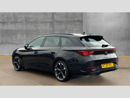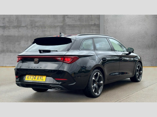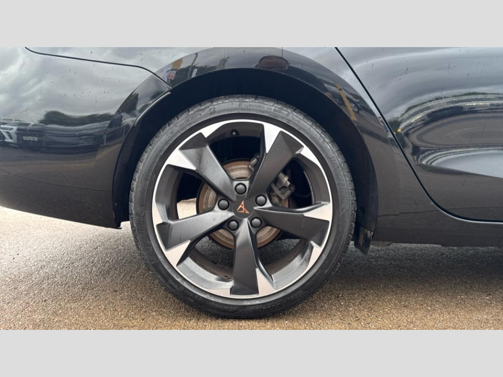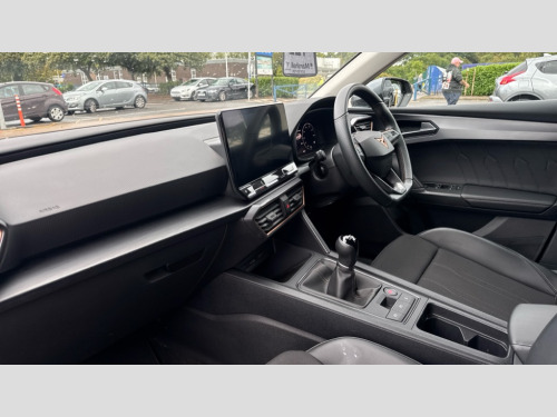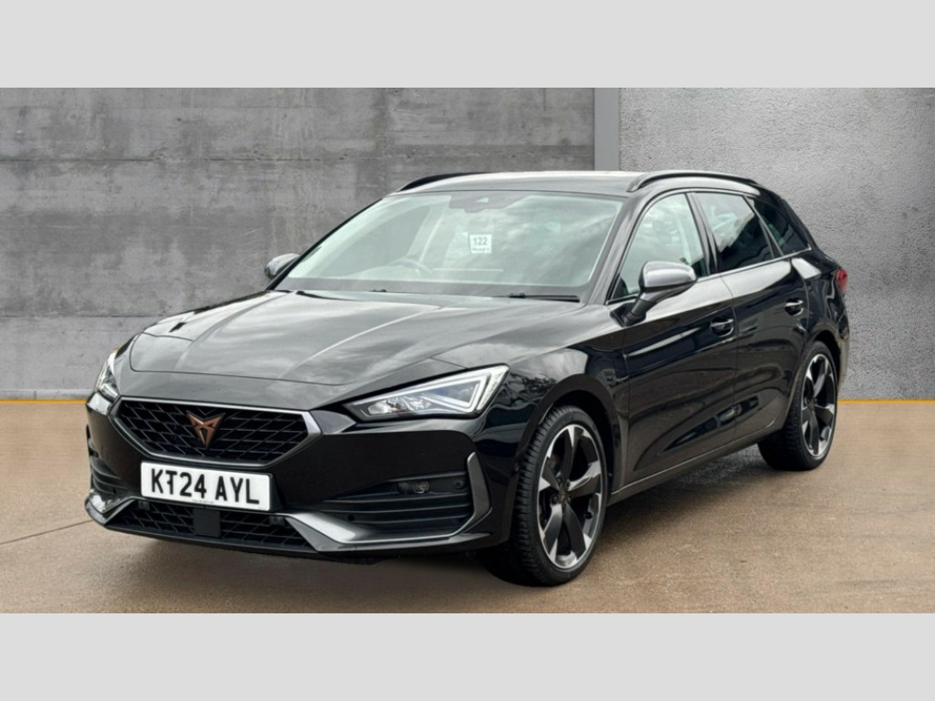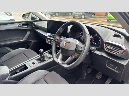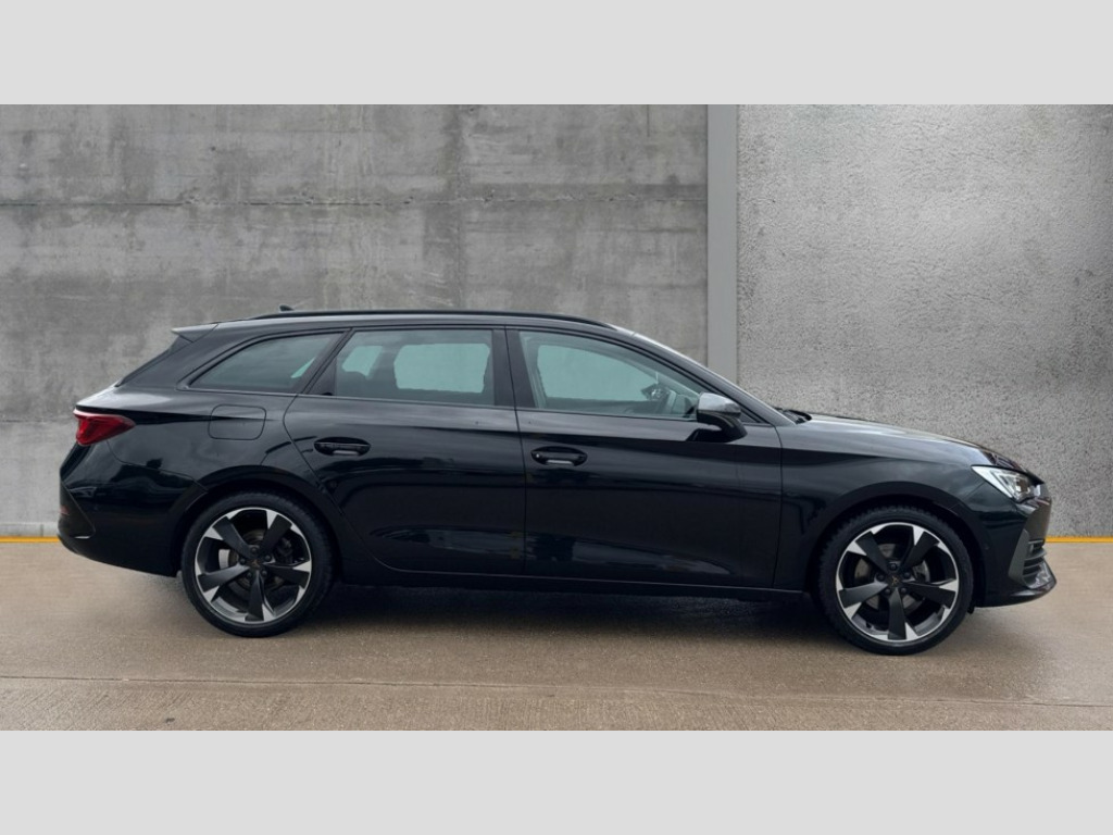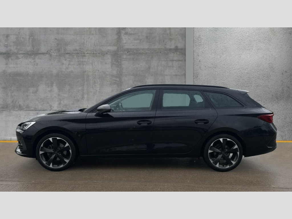 Cupra Leon 1.5 TSI V1 5dr CUPRA drive profile selection with (Comfort/Sport/Individual), throttle response and gearshift mode, Digital cockpit, E-call, Electro mechanical speed sensitive power steering, Four x USB Type C ports (2 in front and 2 in rear), Front assist with forward collision warning braking reaction to vehicles, pedestrians and cyclists, Full link smartphone integration with Mirror Link, wireless Apple CarPlay and wired Google Android Auto, Lane assist, Lockable tailgate, Park assist (inc front/rear parking sensors), Rear view camera, RPM, trip computer, outside temp gauge, instrument light brightness, low fuel warning light, lights on reminder, gearshift indicator, Service interval indicator, Start/stop system with regenerative braking, Wireless phone charger, Sports suspension, Auxiliary input socket, Auto dimming rear view mirror, Body colour door handles, Body coloured bumpers, Cupra sports bumpers, Dark tinted rear windows, Electric front/rear windows, Electrically adjustable, heated and folding door mirrors, Gloss black roof rails, LED front fog lamps with cornering function, LED headlights with dynamic turn signals, tail lights, rear fog lights with rear coast to coast lighting, Rain sensing wipers, Rear diffuser with twin exhaust pipe on each side, Rear side wing doors, Rear wash/wipe, Separate daytime running light with automatic headlight control and coming home feature, Third brake light, 12v power supply in centre console, 12v socket in loadspace, 3 seat bench in 2nd row, 5 headrests, 60/40 split rear bench seat with armrest, Ambient lighting with glovebox, footwell and single monocolour, Cupra Leather flat bottomed, perforated steering wheel, Driver/passenger manual seat height adjustment, Front and rear reading lights X 4, Front centre armrest, Front seats manual lumbar adjustment, Grey headlining, Height/reach adjust steering wheel, Illuminated interior front door sills, ISOFIX points in outer rear seats with top tether anchorage points, Jack and tool kit, PVC/Cloth upholstery with copper stitching, Single front passenger seat, Sliding boot cover, Sports seats, Sunvisors with illuminated mirror, Three zone climate control, Media system plus with navigation pack - Leon Cupra, Safety and driving pack (M) - Cupra leon, 3 point seatbelts on all rear seats, ABS, Brake control system - ESC and brake booster, Child proof door locks, Cupra black brake calipers, Driver and front passenger airbags with front passenger airbag de-activation, front side and curtain airbags, Electronic parking brake, Extended safety system - seat belt tensioner, window closure and hazard lights, Hill hold control, Rear disc brakes, Seat belt reminder for front and rear seats, Tiredness recognition system, Tyre pressure monitoring system, Anti theft alarm system with interior monitoring in cab, backup horn and towing protection, KESSY Advanced - Keyless start, keyless entry, Locking wheel bolts, Chrome and copper interior detailing, 18" Machined sport black and silver alloy wheels with 92Y tyres