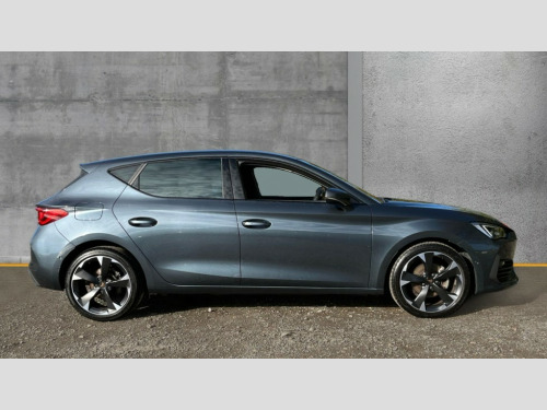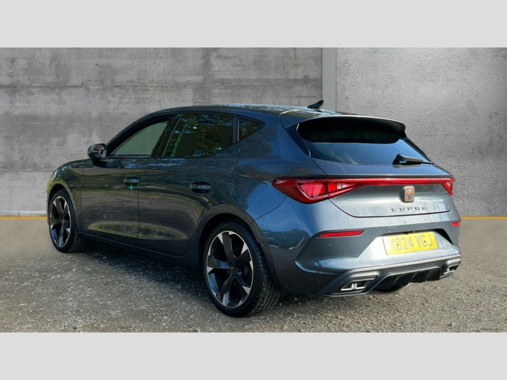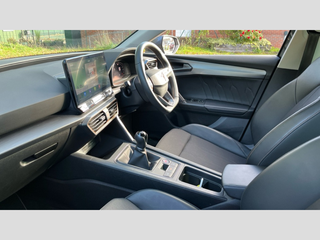 Cupra Leon 1.5 TSI V1 5dr CUPRA drive profile selection with (Comfort/Sport/Individual), throttle response and gearshift mode, Digital cockpit, E-call, Electro mechanical speed sensitive power steering, Four x USB Type C ports (2 in front and 2 in rear), Front assist with forward collision warning braking reaction to vehicles, pedestrians and cyclists, Full link smartphone integration with Mirror Link, wireless Apple CarPlay and wired Google Android Auto, Lane assist, Lockable tailgate, Park assist (inc front/rear parking sensors), Rear view camera, RPM, trip computer, outside temp gauge, instrument light brightness, low fuel warning light, lights on reminder, gearshift indicator, Service interval indicator, Start/stop system with regenerative braking, Wireless phone charger, Sports suspension, Auxiliary input socket, Auto dimming rear view mirror, Body colour door handles, Body coloured bumpers, Cupra sports bumpers, Dark tinted rear windows, Electric front/rear windows, Electrically adjustable, heated and folding door mirrors, LED front fog lamps with cornering function, LED headlights with dynamic turn signals, tail lights, rear fog lights with rear coast to coast lighting, Rain sensing wipers, Rear diffuser with twin exhaust pipe on each side, Rear side wing doors, Rear wash/wipe, Separate daytime running light with automatic headlight control and coming home feature, Third brake light, 12v power supply in centre console, 3 seat bench in 2nd row, 5 headrests, 60/40 split rear bench seat with armrest, Ambient lighting with glovebox, footwell and single monocolour, Cupra Leather flat bottomed, perforated steering wheel, Driver/passenger manual seat height adjustment, Folding boot cover, Front and rear reading lights X 4, Front centre armrest, Front seats manual lumbar adjustment, Grey headlining, Height/reach adjust steering wheel, Illuminated interior front door sills, ISOFIX points in outer rear seats with top tether anchorage points, Jack and tool kit, PVC/Cloth upholstery with copper stitching, Single front passenger seat, Sports seats, Sunvisors with illuminated mirror, Three zone climate control, Media system plus with navigation pack - Leon Cupra, Safety and driving pack (M) - Cupra leon, 3 point seatbelts on all rear seats, ABS, Brake control system - ESC and brake booster, Child proof door locks, Cupra black brake calipers, Driver and front passenger airbags with front passenger airbag de-activation, front side and curtain airbags, Electronic parking brake, Extended safety system - seat belt tensioner, window closure and hazard lights, Hill hold control, Rear disc brakes, Seat belt reminder for front and rear seats, Tiredness recognition system, Tyre pressure monitoring system, Anti theft alarm system with interior monitoring in cab, backup horn and towing protection, KESSY Advanced - Keyless start, keyless entry, Locking wheel bolts, Chrome and copper interior detailing, 18" Machined sport black and silver alloy wheels with 92Y tyres