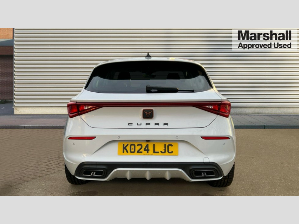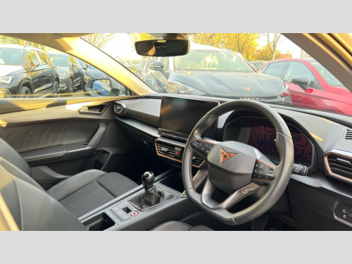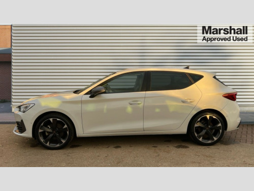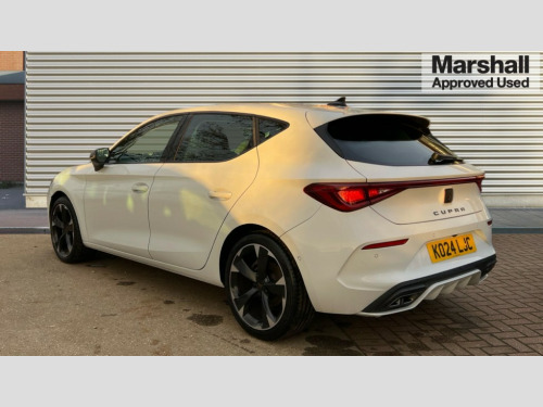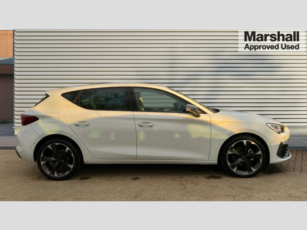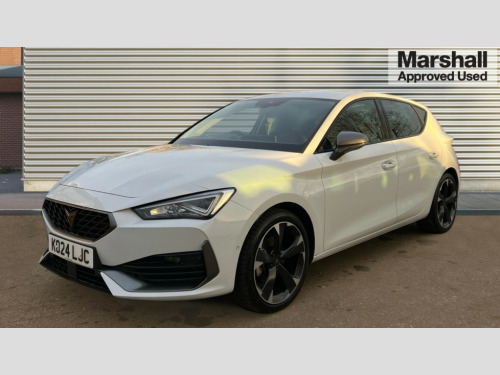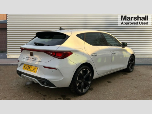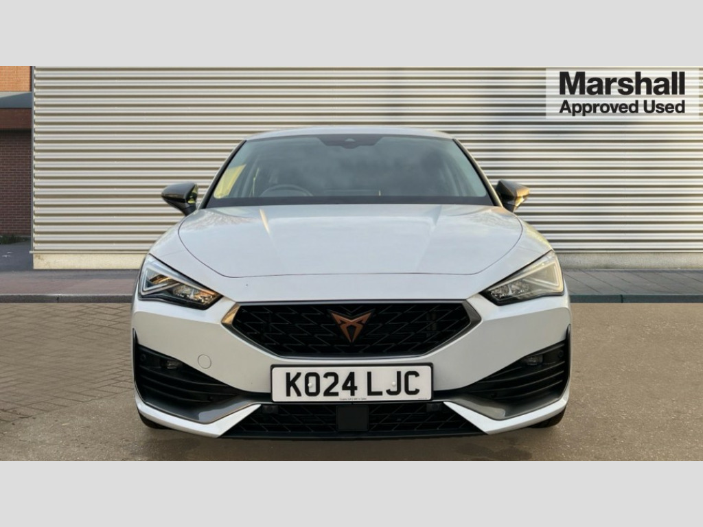 Cupra Leon 1.5 TSI V1 5dr CUPRA drive profile selection with (Comfort/Sport/Individual), throttle response and gearshift mode, Digital cockpit, E-call, Electro mechanical speed sensitive power steering, Four x USB Type C ports (2 in front and 2 in rear), Front assist with forward collision warning braking reaction to vehicles, pedestrians and cyclists, Full link smartphone integration with Mirror Link, wireless Apple CarPlay and wired Google Android Auto, Lane assist, Lockable tailgate, Park assist (inc front/rear parking sensors), Rear view camera, RPM, trip computer, outside temp gauge, instrument light brightness, low fuel warning light, lights on reminder, gearshift indicator, Service interval indicator, Start/stop system with regenerative braking, Wireless phone charger, Sports suspension, Auxiliary input socket, Auto dimming rear view mirror, Body colour door handles, Body coloured bumpers, Cupra sports bumpers, Dark tinted rear windows, Electric front/rear windows, Electrically adjustable, heated and folding door mirrors, LED front fog lamps with cornering function, LED headlights with dynamic turn signals, tail lights, rear fog lights with rear coast to coast lighting, Rain sensing wipers, Rear diffuser with twin exhaust pipe on each side, Rear side wing doors, Rear wash/wipe, Separate daytime running light with automatic headlight control and coming home feature, Third brake light, 12v power supply in centre console, 3 seat bench in 2nd row, 5 headrests, 60/40 split rear bench seat with armrest, Ambient lighting with glovebox, footwell and single monocolour, Cupra Leather flat bottomed, perforated steering wheel, Driver/passenger manual seat height adjustment, Folding boot cover, Front and rear reading lights X 4, Front centre armrest, Front seats manual lumbar adjustment, Grey headlining, Height/reach adjust steering wheel, Illuminated interior front door sills, ISOFIX points in outer rear seats with top tether anchorage points, Jack and tool kit, PVC/Cloth upholstery with copper stitching, Single front passenger seat, Sports seats, Sunvisors with illuminated mirror, Three zone climate control, Media system plus with navigation pack - Leon Cupra, Safety and driving pack (M) - Cupra leon, 3 point seatbelts on all rear seats, ABS, Brake control system - ESC and brake booster, Child proof door locks, Cupra black brake calipers, Driver and front passenger airbags with front passenger airbag de-activation, front side and curtain airbags, Electronic parking brake, Extended safety system - seat belt tensioner, window closure and hazard lights, Hill hold control, Rear disc brakes, Seat belt reminder for front and rear seats, Tiredness recognition system, Tyre pressure monitoring system, Anti theft alarm system with interior monitoring in cab, backup horn and towing protection, KESSY Advanced - Keyless start, keyless entry, Locking wheel bolts, Chrome and copper interior detailing, 18" Machined sport black and silver alloy wheels with 92Y tyres