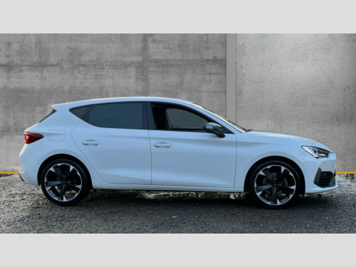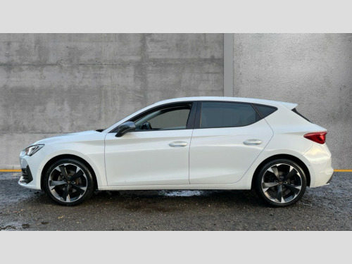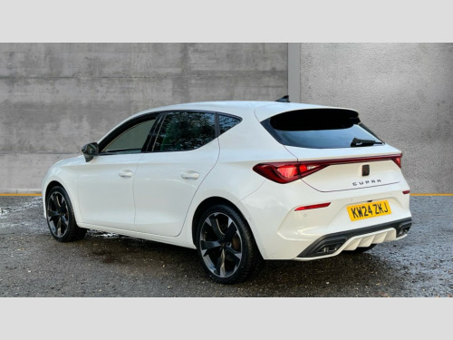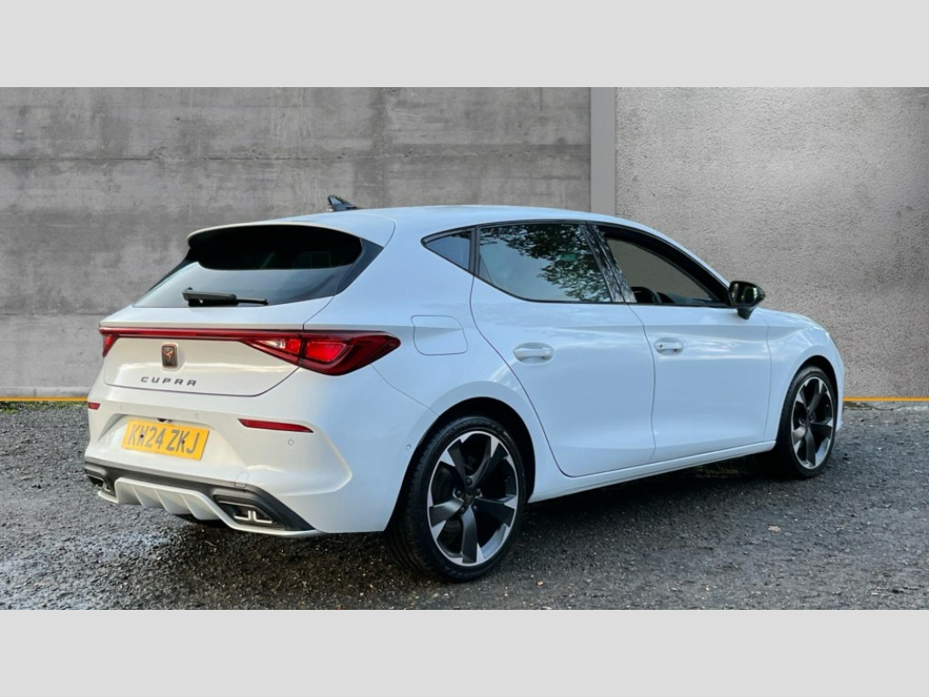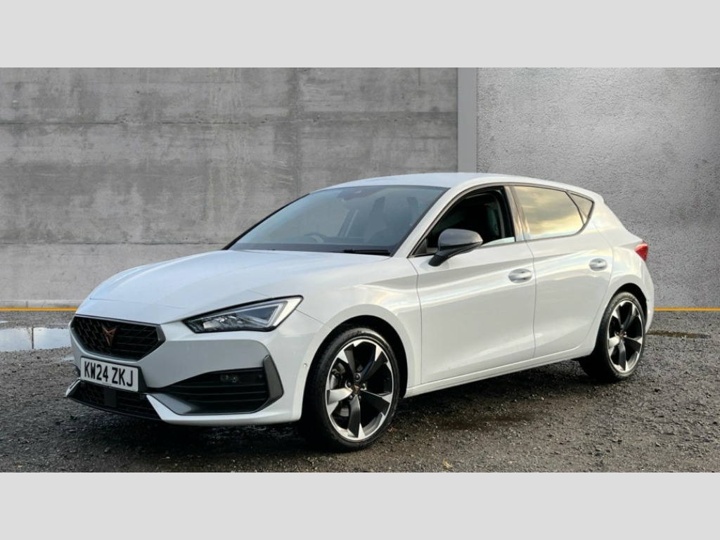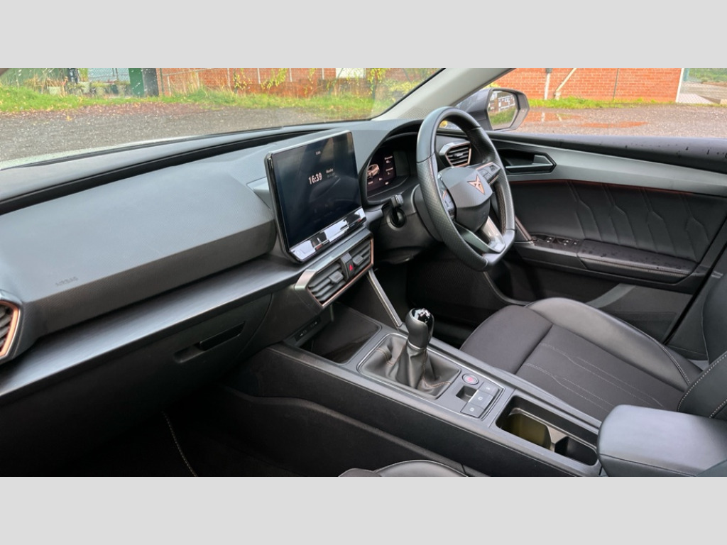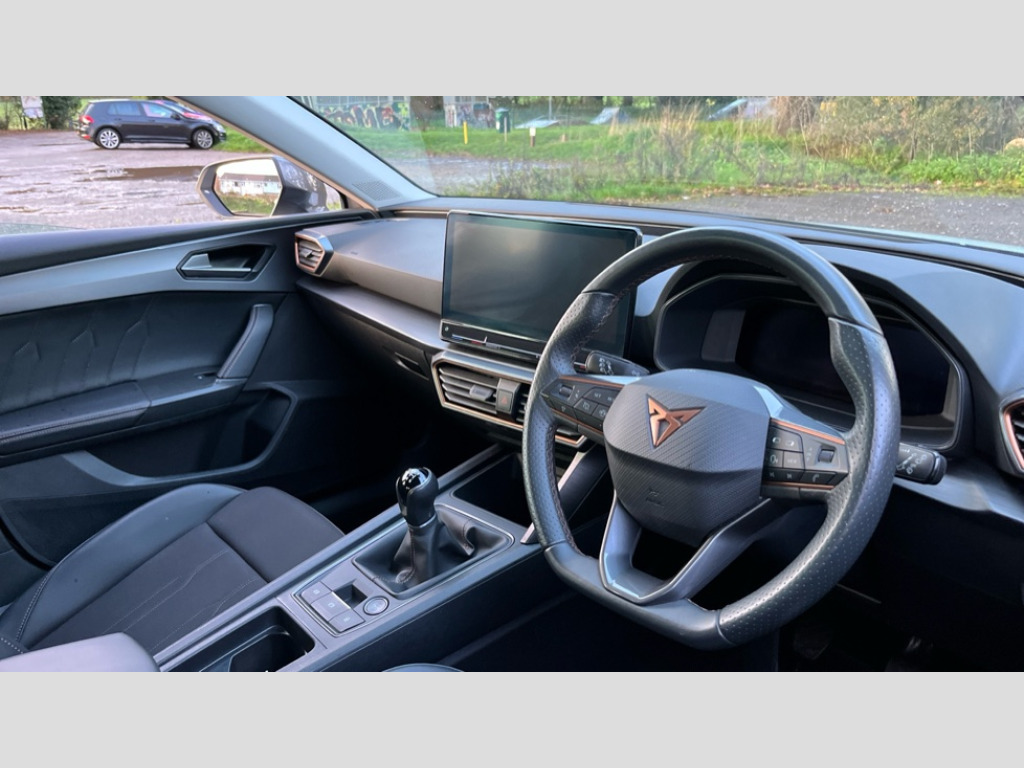 Cupra Leon 1.5 TSI V1 5dr CUPRA drive profile selection with (Comfort/Sport/Individual), throttle response and gearshift mode, Digital cockpit, E-call, Electro mechanical speed sensitive power steering, Four x USB Type C ports (2 in front and 2 in rear), Front assist with forward collision warning braking reaction to vehicles, pedestrians and cyclists, Full link smartphone integration with Mirror Link, wireless Apple CarPlay and wired Google Android Auto, Lane assist, Lockable tailgate, Park assist (inc front/rear parking sensors), Rear view camera, RPM, trip computer, outside temp gauge, instrument light brightness, low fuel warning light, lights on reminder, gearshift indicator, Service interval indicator, Start/stop system with regenerative braking, Wireless phone charger, Sports suspension, Auxiliary input socket, Auto dimming rear view mirror, Body colour door handles, Body coloured bumpers, Cupra sports bumpers, Dark tinted rear windows, Electric front/rear windows, Electrically adjustable, heated and folding door mirrors, LED front fog lamps with cornering function, LED headlights with dynamic turn signals, tail lights, rear fog lights with rear coast to coast lighting, Rain sensing wipers, Rear diffuser with twin exhaust pipe on each side, Rear side wing doors, Rear wash/wipe, Separate daytime running light with automatic headlight control and coming home feature, Third brake light, 12v power supply in centre console, 3 seat bench in 2nd row, 5 headrests, 60/40 split rear bench seat with armrest, Ambient lighting with glovebox, footwell and single monocolour, Cupra Leather flat bottomed, perforated steering wheel, Driver/passenger manual seat height adjustment, Folding boot cover, Front and rear reading lights X 4, Front centre armrest, Front seats manual lumbar adjustment, Grey headlining, Height/reach adjust steering wheel, Illuminated interior front door sills, ISOFIX points in outer rear seats with top tether anchorage points, Jack and tool kit, PVC/Cloth upholstery with copper stitching, Single front passenger seat, Sports seats, Sunvisors with illuminated mirror, Three zone climate control, Media system plus with navigation pack - Leon Cupra, Safety and driving pack (M) - Cupra leon, 3 point seatbelts on all rear seats, ABS, Brake control system - ESC and brake booster, Child proof door locks, Cupra black brake calipers, Driver and front passenger airbags with front passenger airbag de-activation, front side and curtain airbags, Electronic parking brake, Extended safety system - seat belt tensioner, window closure and hazard lights, Hill hold control, Rear disc brakes, Seat belt reminder for front and rear seats, Tiredness recognition system, Tyre pressure monitoring system, Anti theft alarm system with interior monitoring in cab, backup horn and towing protection, KESSY Advanced - Keyless start, keyless entry, Locking wheel bolts, Chrome and copper interior detailing, 18" Machined sport black and silver alloy wheels with 92Y tyres