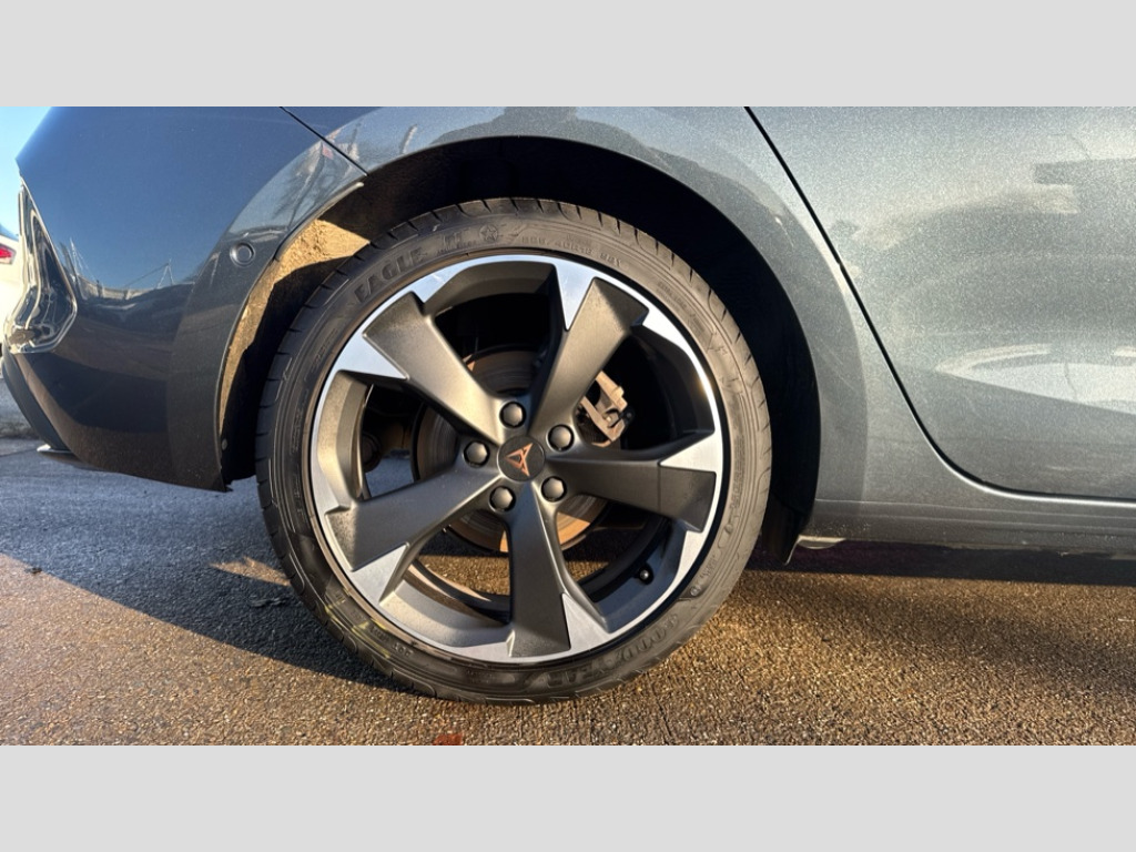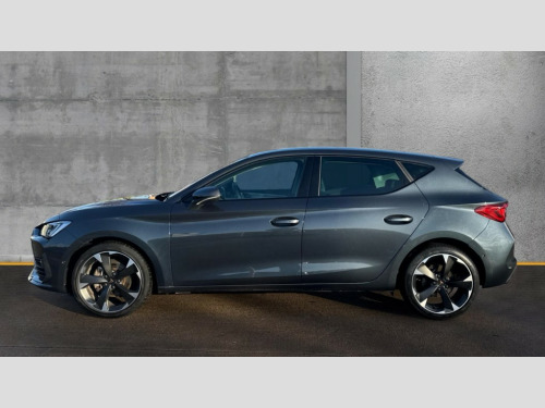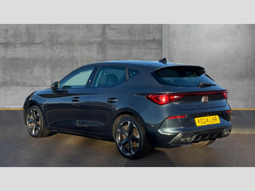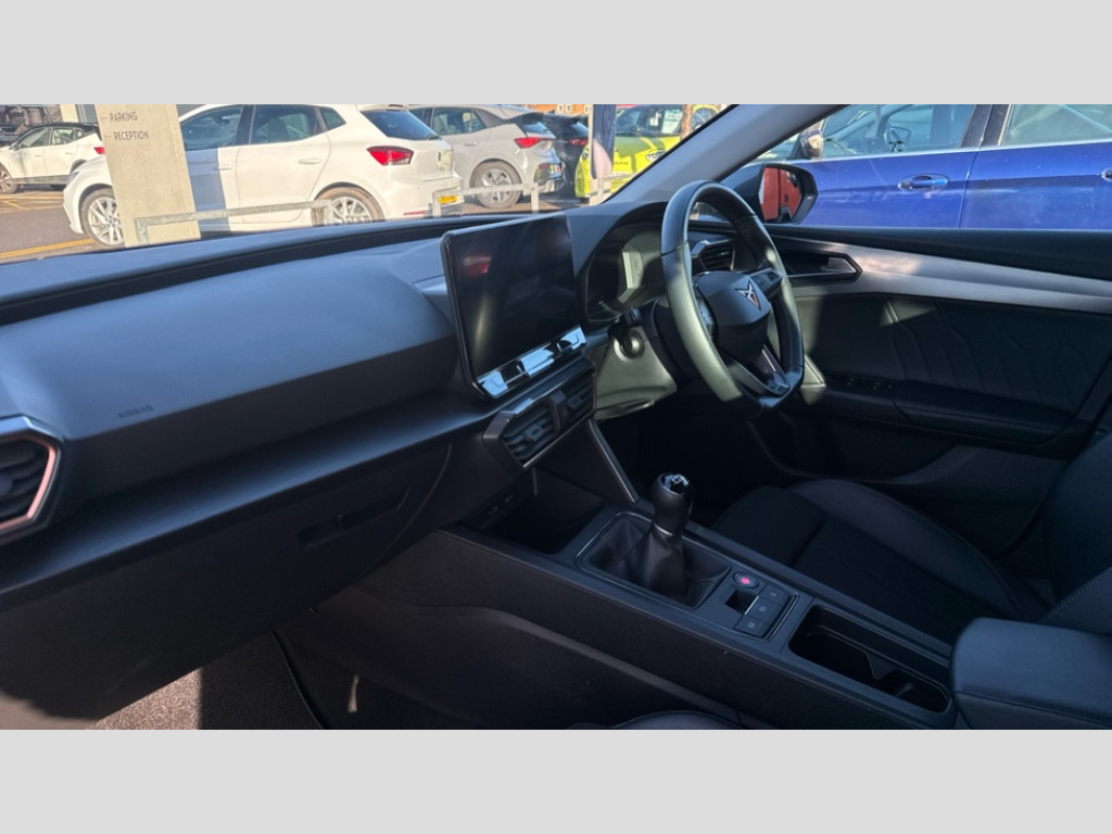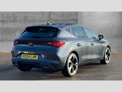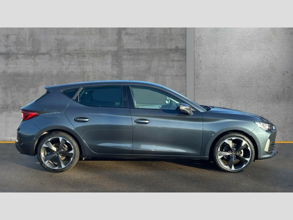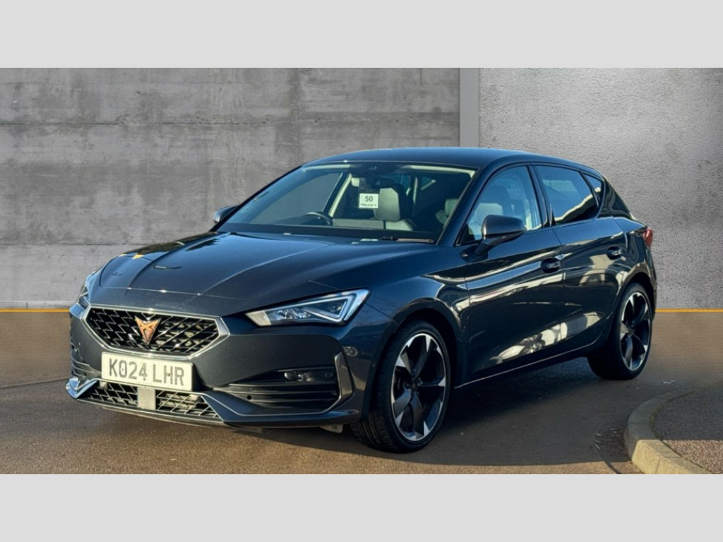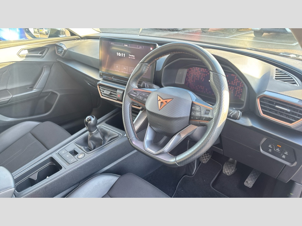 Cupra Leon 1.5 TSI V1 5dr CUPRA drive profile selection with (Comfort/Sport/Individual), throttle response and gearshift mode, Digital cockpit, E-call, Electro mechanical speed sensitive power steering, Four x USB Type C ports (2 in front and 2 in rear), Front assist with forward collision warning braking reaction to vehicles, pedestrians and cyclists, Full link smartphone integration with Mirror Link, wireless Apple CarPlay and wired Google Android Auto, Lane assist, Lockable tailgate, Park assist (inc front/rear parking sensors), Rear view camera, RPM, trip computer, outside temp gauge, instrument light brightness, low fuel warning light, lights on reminder, gearshift indicator, Service interval indicator, Start/stop system with regenerative braking, Wireless phone charger, Sports suspension, Auxiliary input socket, Auto dimming rear view mirror, Body colour door handles, Body coloured bumpers, Cupra sports bumpers, Dark tinted rear windows, Electric front/rear windows, Electrically adjustable, heated and folding door mirrors, LED front fog lamps with cornering function, LED headlights with dynamic turn signals, tail lights, rear fog lights with rear coast to coast lighting, Rain sensing wipers, Rear diffuser with twin exhaust pipe on each side, Rear side wing doors, Rear wash/wipe, Separate daytime running light with automatic headlight control and coming home feature, Third brake light, 12v power supply in centre console, 3 seat bench in 2nd row, 5 headrests, 60/40 split rear bench seat with armrest, Ambient lighting with glovebox, footwell and single monocolour, Cupra Leather flat bottomed, perforated steering wheel, Driver/passenger manual seat height adjustment, Folding boot cover, Front and rear reading lights X 4, Front centre armrest, Front seats manual lumbar adjustment, Grey headlining, Height/reach adjust steering wheel, Illuminated interior front door sills, ISOFIX points in outer rear seats with top tether anchorage points, Jack and tool kit, PVC/Cloth upholstery with copper stitching, Single front passenger seat, Sports seats, Sunvisors with illuminated mirror, Three zone climate control, Media system plus with navigation pack - Leon Cupra, Safety and driving pack (M) - Cupra leon, 3 point seatbelts on all rear seats, ABS, Brake control system - ESC and brake booster, Child proof door locks, Cupra black brake calipers, Driver and front passenger airbags with front passenger airbag de-activation, front side and curtain airbags, Electronic parking brake, Extended safety system - seat belt tensioner, window closure and hazard lights, Hill hold control, Rear disc brakes, Seat belt reminder for front and rear seats, Tiredness recognition system, Tyre pressure monitoring system, Anti theft alarm system with interior monitoring in cab, backup horn and towing protection, KESSY Advanced - Keyless start, keyless entry, Locking wheel bolts, Chrome and copper interior detailing, 18" Machined sport black and silver alloy wheels with 92Y tyres