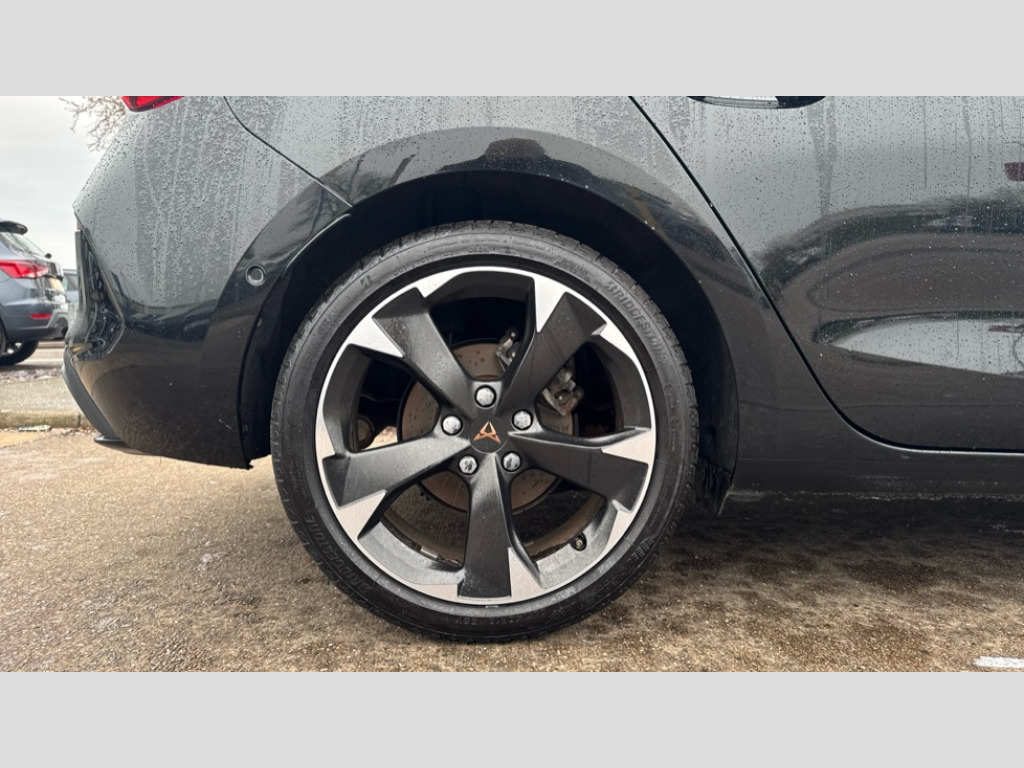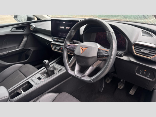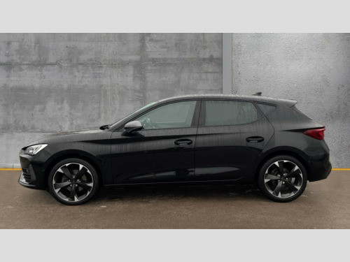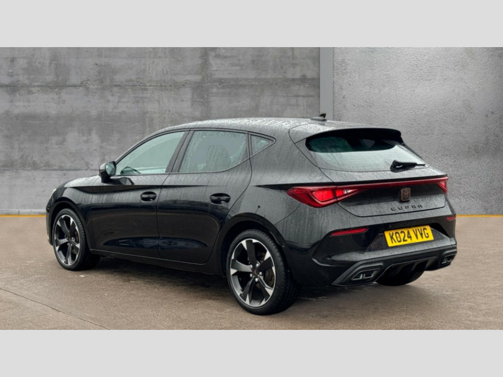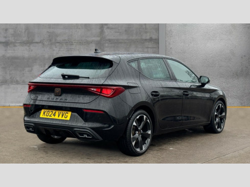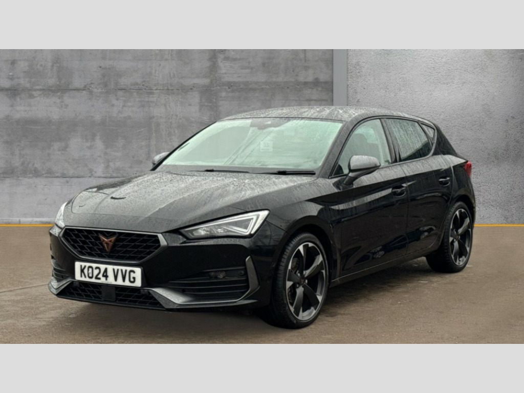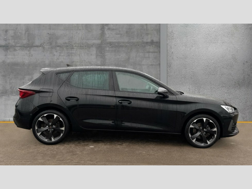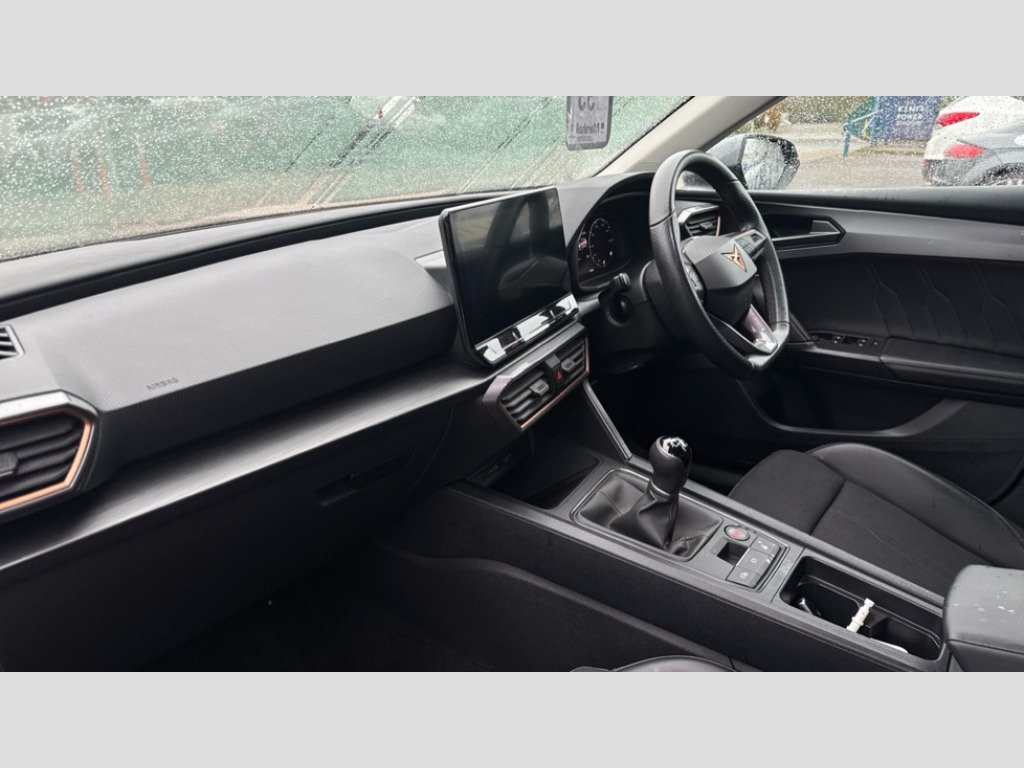 Cupra Leon 1.5 TSI V1 5dr CUPRA drive profile selection with (Comfort/Sport/Individual), throttle response and gearshift mode, Digital cockpit, E-call, Electro mechanical speed sensitive power steering, Four x USB Type C ports (2 in front and 2 in rear), Front assist with forward collision warning braking reaction to vehicles, pedestrians and cyclists, Full link smartphone integration with Mirror Link, wireless Apple CarPlay and wired Google Android Auto, Lane assist, Lockable tailgate, Park assist (inc front/rear parking sensors), Rear view camera, RPM, trip computer, outside temp gauge, instrument light brightness, low fuel warning light, lights on reminder, gearshift indicator, Service interval indicator, Start/stop system with regenerative braking, Wireless phone charger, Sports suspension, Auxiliary input socket, Auto dimming rear view mirror, Body colour door handles, Body coloured bumpers, Cupra sports bumpers, Dark tinted rear windows, Electric front/rear windows, Electrically adjustable, heated and folding door mirrors, LED front fog lamps with cornering function, LED headlights with dynamic turn signals, tail lights, rear fog lights with rear coast to coast lighting, Rain sensing wipers, Rear diffuser with twin exhaust pipe on each side, Rear side wing doors, Rear wash/wipe, Separate daytime running light with automatic headlight control and coming home feature, Third brake light, 12v power supply in centre console, 3 seat bench in 2nd row, 5 headrests, 60/40 split rear bench seat with armrest, Ambient lighting with glovebox, footwell and single monocolour, Cupra Leather flat bottomed, perforated steering wheel, Driver/passenger manual seat height adjustment, Folding boot cover, Front and rear reading lights X 4, Front centre armrest, Front seats manual lumbar adjustment, Grey headlining, Height/reach adjust steering wheel, Illuminated interior front door sills, ISOFIX points in outer rear seats with top tether anchorage points, Jack and tool kit, PVC/Cloth upholstery with copper stitching, Single front passenger seat, Sports seats, Sunvisors with illuminated mirror, Three zone climate control, Media system plus with navigation pack - Leon Cupra, Safety and driving pack (M) - Cupra leon, 3 point seatbelts on all rear seats, ABS, Brake control system - ESC and brake booster, Child proof door locks, Cupra black brake calipers, Driver and front passenger airbags with front passenger airbag de-activation, front side and curtain airbags, Electronic parking brake, Extended safety system - seat belt tensioner, window closure and hazard lights, Hill hold control, Rear disc brakes, Seat belt reminder for front and rear seats, Tiredness recognition system, Tyre pressure monitoring system, Anti theft alarm system with interior monitoring in cab, backup horn and towing protection, KESSY Advanced - Keyless start, keyless entry, Locking wheel bolts, Chrome and copper interior detailing, 18" Machined sport black and silver alloy wheels with 92Y tyres