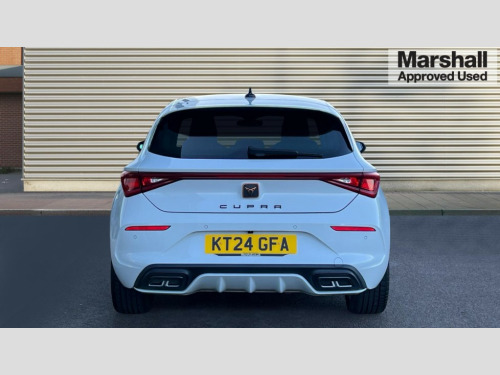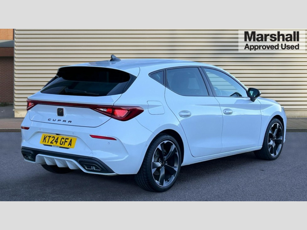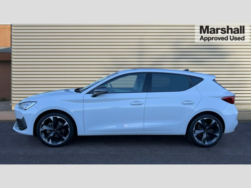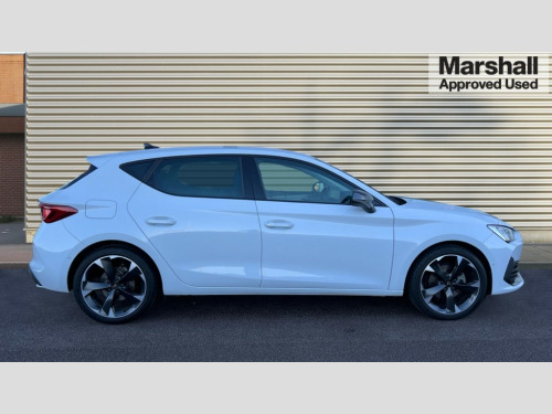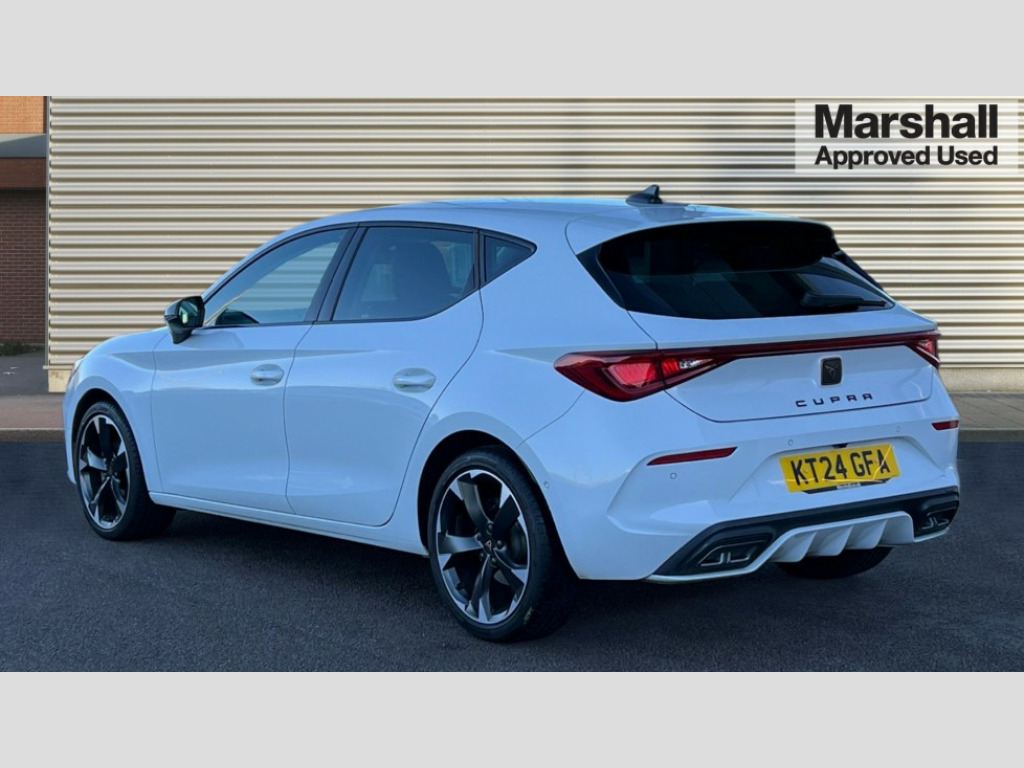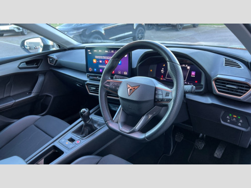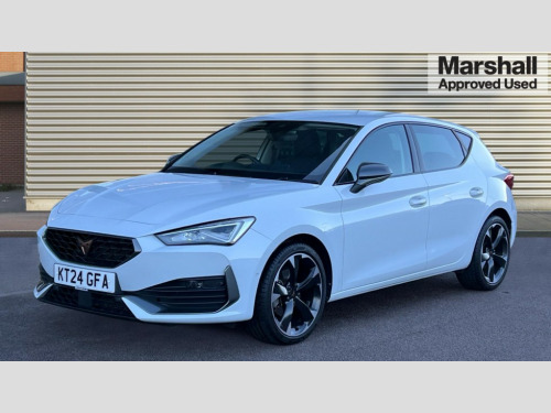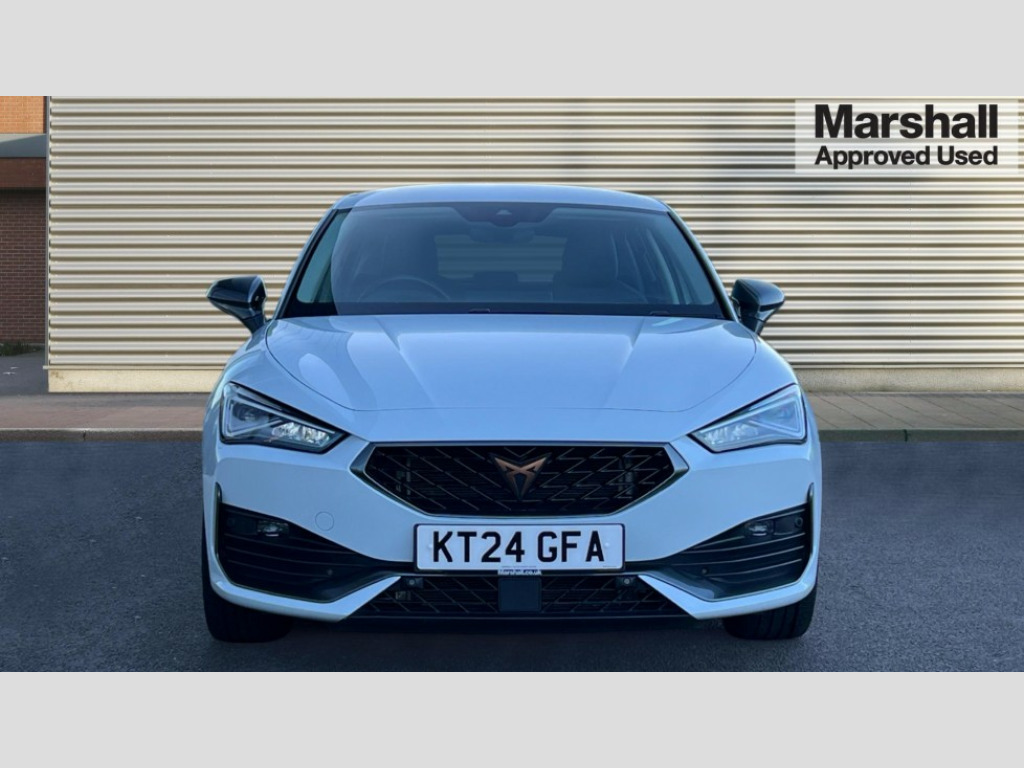 Cupra Leon 1.5 TSI V1 5dr CUPRA drive profile selection with (Comfort/Sport/Individual), throttle response and gearshift mode, Digital cockpit, E-call, Electro mechanical speed sensitive power steering, Front assist with forward collision warning braking reaction to vehicles, pedestrians and cyclists, Full link smartphone integration with Mirror Link, wireless Apple CarPlay and wired Google Android Auto, Lane assist, Lockable tailgate, Park assist (inc front/rear parking sensors), Rear view camera, RPM, trip computer, outside temp gauge, instrument light brightness, low fuel warning light, lights on reminder, gearshift indicator, Service interval indicator, Start/stop system with regenerative braking, Wireless phone charger, Sports suspension, Auxiliary input socket, Auto dimming rear view mirror, Body colour door handles, Body coloured bumpers, Cupra sports bumpers, Dark tinted rear windows, Electric front/rear windows, Electrically adjustable, heated and folding door mirrors, LED front fog lamps with cornering function, LED headlights with dynamic turn signals, tail lights, rear fog lights with rear coast to coast lighting, Rain sensing wipers, Rear diffuser with twin exhaust pipe on each side, Rear side wing doors, Rear wash/wipe, Separate daytime running light with automatic headlight control and coming home feature, Third brake light, 12v power supply in centre console, 3 seat bench in 2nd row, 5 headrests, 60/40 split rear bench seat with armrest, Ambient lighting with glovebox, footwell and single monocolour, Cupra Leather flat bottomed, perforated steering wheel, Driver/passenger manual seat height adjustment, Folding boot cover, Four x USB Type C ports (2 in front and 2 in rear), Front and rear reading lights X 4, Front centre armrest, Front seats manual lumbar adjustment, Grey headlining, Height/reach adjust steering wheel, Illuminated interior front door sills, ISOFIX points in outer rear seats with top tether anchorage points, Jack and tool kit, PVC/Cloth upholstery with copper stitching, Single front passenger seat, Sports seats, Sunvisors with illuminated mirror, Three zone climate control, Media system plus with navigation pack - Leon Cupra, Safety and driving pack (M) - Cupra leon, 3 point seatbelts on all rear seats, ABS, Brake control system - ESC and brake booster, Child proof door locks, Cupra black brake calipers, Driver and front passenger airbags with front passenger airbag de-activation, front side and curtain airbags, Electronic parking brake, Extended safety system - seat belt tensioner, window closure and hazard lights, Hill hold control, Rear disc brakes, Seat belt reminder for front and rear seats, Tiredness recognition system, Tyre pressure monitoring system, Anti theft alarm system with interior monitoring in cab, backup horn and towing protection, KESSY Advanced - Keyless start, keyless entry, Locking wheel bolts, Chrome and copper interior detailing, 18" Machined sport black and silver alloy wheels with 92Y tyres