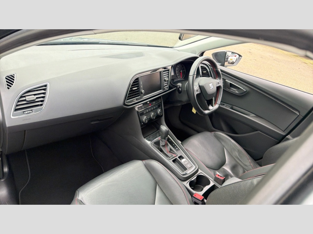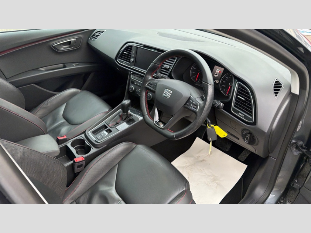 Seat Leon 1.8 TSI FR Technology 5dr DSG 'Lights On' Reminder warning buzzer, 8" touch screen, Bluetooth Handsfree Phone Connection, Low fuel warning light, Outside temperature gauge, Rear parking sensors, Remote fuel flap release, SEAT Drive profile, SEAT logo boot release, Service interval indicator, Touch screen display, Trip computer, Voice control system, XDS electronic differential lock, 2 USB ports, 2 USB sockets in rear, 2x SD card slot, Auxiliary input socket, Bluetooth audio streaming, DAB Digital radio, Radio/CD + MP3, Steering wheel mounted audio/phone controls, Aluminium front door sills, Black grille with chrome surround, Body colour door handles, Body coloured bumpers, Body coloured door mirrors, Dark tinted rear windows, Electric adjustable/heated/folding door mirrors, Electric front/rear windows with one touch/auto up/down, Electric headlamp adjustment, High gloss black finish B and C pillars, LED daytime running lights, LED front fog lights, LED Headlights, LED indicators in door mirrors, LED number plate light, LED tail lights, Rear wash/wipe, Reverse activated kerb-view adjustment on passenger's door mirror, Twin exhaust pipes, 12v power point in centre console, 3 height adjustable rear headrests, 60/40 split folding rear seat, Active head restraints, Additional heating and ventilation outlet in rear of centre console, Boot net, Chrome loading sill, Driver seat lumbar adjustment, Driver/passenger sunvisors with illuminated vanity mirrors, Dual zone climate control, Dust/pollen filter, Front adjustable head restraints, Front armrest with storage box, Front cupholders x 2, Front map reading lights, Front seat and rear pockets, Front sports seats, Front/rear floor mats, Height/reach adjust steering wheel, Illuminated door sills, Illuminated glovebox, Instrument lighting with brightness control, Leather handbrake, Luggage compartment cover, Luggage tie-down hooks, Passenger seat height adjuster, Passenger seat lumbar adjust, Perforated leather steering wheel with red stitching + gear knob, Rear reading lights, Rear top tether child seat ISOFIX attachment, Rear window curtains, Steering wheel gearshift paddles, Storage boxes under front seats, 3 point seatbelts on all rear seats, ABS + traction control, Child proof door locks, Collision mitigation braking system, Curtain airbags, Driver/Front Passenger airbags, Drivers knee airbag, Electronic parking brake with auto hold, ESP+EBA, Front assist including city emergency braking, Front seatbelt pretensioners, Front Seatbelt warning, Front side airbags, Hill hold control, Manual passenger airbag deactivation function, Tyre pressure monitoring system, 2 folding remote keys with window open/close function, Engine immobiliser, Locking wheel bolts, Remote central locking + deadlocks, Volumetric alarm with back up horn, Chrome interior trim