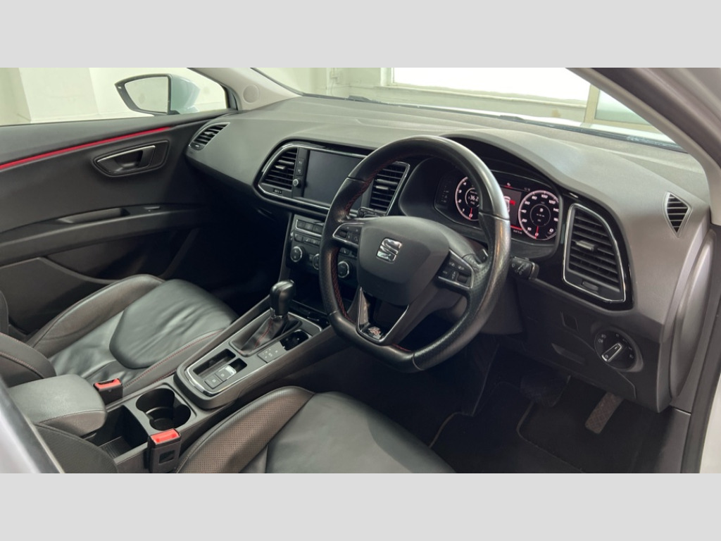 Seat Leon 2.0 TSI 190 FR Sport [EZ] 5dr DSG 'Lights On' Reminder warning buzzer, 3D map display, 8" touch screen, Bluetooth Handsfree Phone Connection, Digital cockpit, Electro-mechanical power steering, Front and rear parking sensors, Front assist with pedestrian protection, Full Link Smartphone Integration with Mirror Link, Apple Car Play, Google Android Auto, Low fuel warning light, Navigation system (incl. media system plus), Outside temperature gauge, RPM counter, SEAT Drive profile, SEAT logo boot release, Service interval indicator, Trip computer, Voice recognition, Dynamic chassis control, Lowered sports suspension, XDS electronic differential lock, 2x SD card slot, 4 USB, 8 Speakers, Auxiliary input socket, Bluetooth audio streaming, CD player, DAB Digital radio, High resolution colour driver display, Media system plus (incl. media system colour), SEAT USB media cable, Steering wheel mounted audio/phone controls, Black radiator grille, Body colour door handles, Body coloured bumpers, Body coloured exterior mirrors with integrated LED indicators, Chrome-plated radiator grille surround, Dark tinted rear windows, Electric front/rear windows, Electrically adjustable door mirrors, Electrically foldable exterior mirrors with parking position and passenger-side mirror with lowering function, Exclusive FR front and rear bumpers, Heated door mirrors, High gloss black finish B and C pillars, Illuminated aluminium front door sill with FR logo, LED front fog lights, LED headlights with LED day time running lights + LED rear lights + LED number plate lights, Rear wash/wipe, Visible twin exhaust tailpipes, 12v power point in centre console, 60/40 split folding rear seat with armrest, Active front headrests and 3 rear headrests, Additional heating and ventilation outlet in rear of centre console, Boot storage net, Cargo rings in boot, Driver and passenger seat height adjust, Driver seat lumbar adjustment, Dual zone climate control, Dust/pollen filter, Flat bottomed perforated leather steering wheel with red stitching and FR logo, Front adjustable head restraints, Front armrest with storage box, Front cupholders x 2, Front seatback storage pockets, Front sport seats in leather, Front/rear floor mats, Gear shift indicator, Height/reach adjust steering wheel, High centre console with integrated box & cup holder, rear air outlet, with armrest in front seats, Illuminated door sills, Instrument lighting with brightness control, Luggage tie-down hooks, Multi-colour ambient interior lighting, Passenger seat lumbar adjust, Rear top tether child seat ISOFIX attachment, Steering wheel gearshift paddles, Storage box under drivers seat, Winter pack - Leon, 3 point seatbelts on all rear seats, 7 airbags - 2 front, 2 front side, 2 curtain, 1 knee, ABS + TCS, Child proof door locks, Electric handbrake, Electronic parking brake with auto hold, ESC with tyre pressure warning indicator, ESP+EBA, Front seatbelt pretensioners, Front seatbelt reminder, Hill hold control, Multi-Collision braking, Passenger airbag deactivation system, 2 folding remote keys with window open/close function and boot opening/door mirror folding function, Central locking fuel filler cap, Engine immobiliser, Locking wheel bolts, Remote central locking + deadlocks, Volumetric alarm with back up horn, Chrome interior detailing, 18" Performance Alloy wheels 30/1