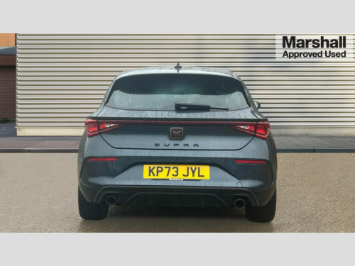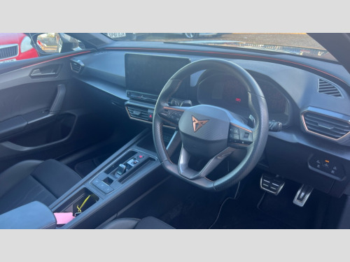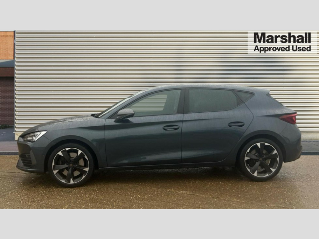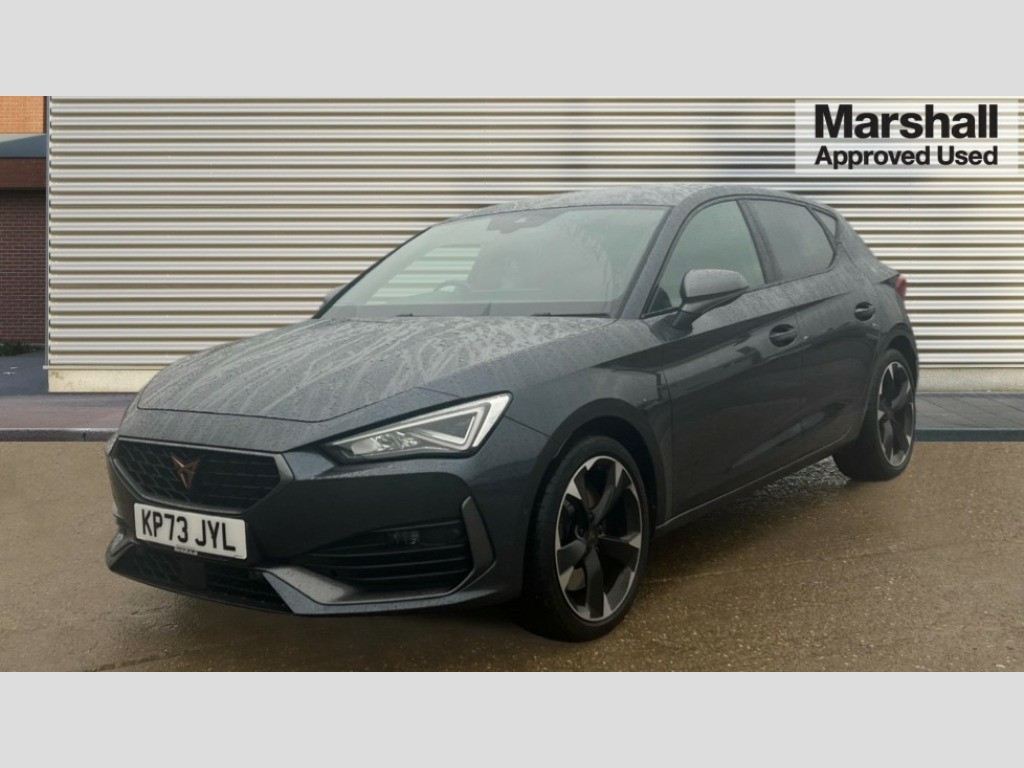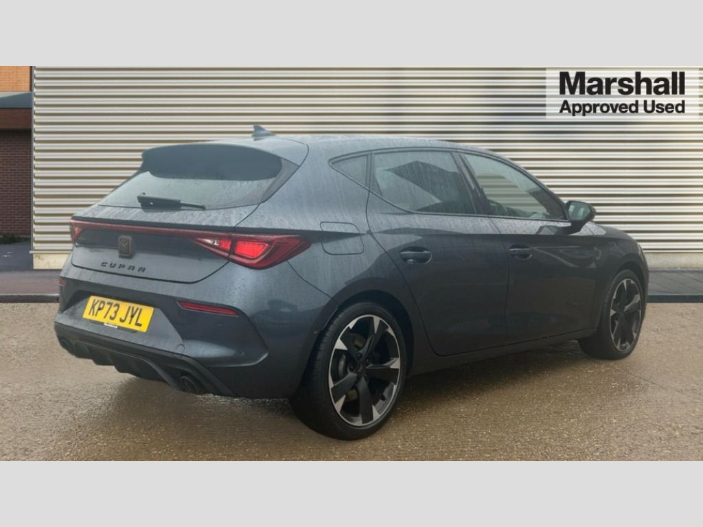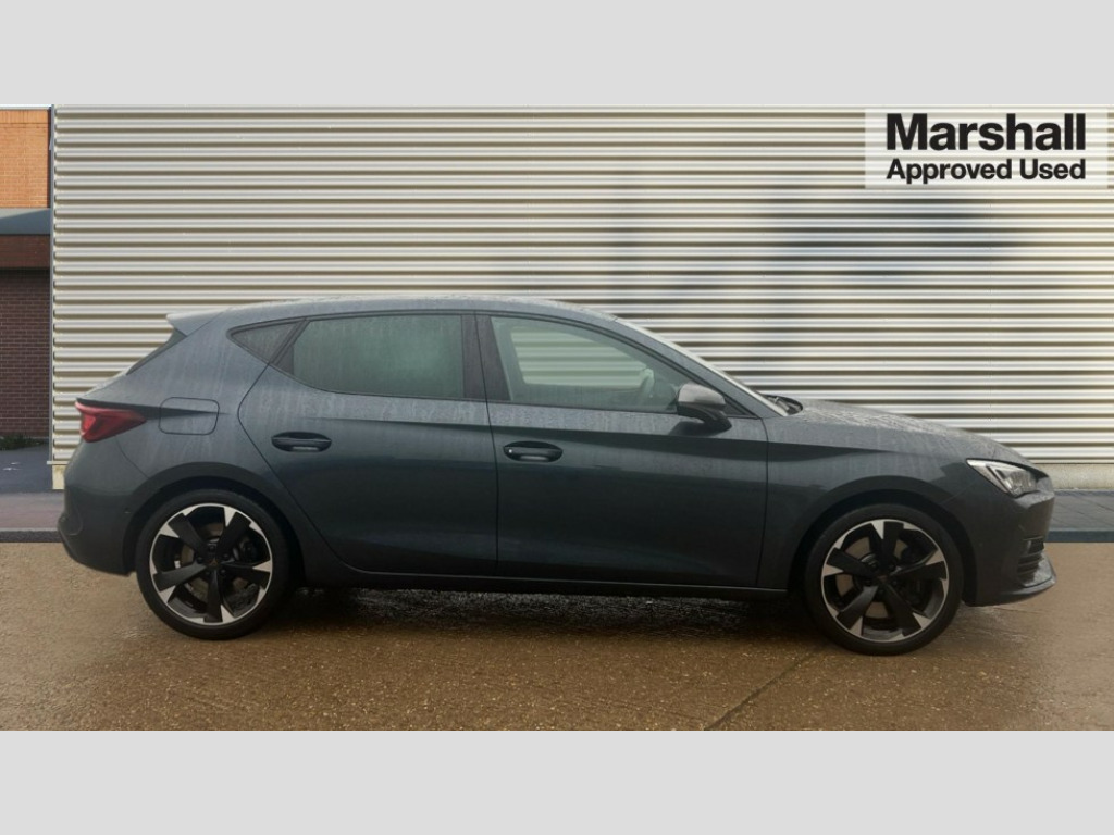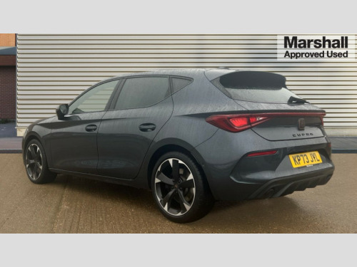 Cupra Leon 2.0 TSI VZ1 5dr DSG CUPRA drive profile selection with 4 modes (Comfort/Cupra/Sport/Individual), throttle response and gearshift mode, Digital cockpit, E-call, Electro mechanical speed sensitive power steering, Four x USB Type C ports, Front assist with forward collision warning braking reaction to vehicles, pedestrians and cyclists, Full link smartphone integration with Mirror Link, wireless Apple CarPlay and wired Google Android Auto, Lane assist, Lockable tailgate, Park assist (inc front/rear parking sensors), Rear view camera, RPM, trip computer, outside temp gauge, instrument light brightness, low fuel warning light, lights on reminder, gearshift indicator, Service interval indicator, Start/stop system with regenerative braking, Sports suspension, XDS electronic differential lock and dynamic traction support, 7 speakers, Auxiliary input socket, Auto dimming rear view mirror, Body colour door handles, Body coloured bumpers, Cupra sports bumpers, Dark tinted rear windows, Electric front/rear windows, Electrically adjustable, heated and folding door mirrors, LED front fog lamps with cornering function, LED headlights with dynamic turn signals, tail lights, rear fog lights with rear coast to coast lighting, Rain sensing wipers, Rear diffuser with twin exhaust pipe on each side, Rear side wing doors, Rear wash/wipe, Separate daytime running light with automatic headlight control and coming home feature, Third brake light, 12v power supply in centre console, 3 seat bench in 2nd row, 5 headrests, 60/40 split rear bench seat with armrest, Ambient lighting (glovebox, footwell, ambient lighting multicoloured), Black headlining, CUPRA Leather flat bottomed, heated, perforated steering and gearshift paddles, Cupra sports pedals, Driver/passenger manual seat height adjustment, Dust/pollen filter, Folding boot cover, Front and rear reading lights X 4, Front centre armrest, Front seats manual lumbar adjustment, Height/reach adjust steering wheel, Illuminated interior front door sills, Interior wraparound lighting, ISOFIX points in outer rear seats with top tether anchorage points, Jack and tool kit, Luggage tie-down hooks, PVC/Cloth upholstery with copper stitching + Cupra embossed logo on headrest, Single front passenger seat, Sports bucket seats, Storage pockets on rear of front seats, Sunvisors with illuminated mirror, Three zone climate control, Media system plus with navigation pack - Leon Cupra, 3 point seatbelts on all rear seats, ABS, Brake control system - ESC and brake booster, Child proof door locks, Cupra black brake calipers, Driver and front passenger airbags with front passenger airbag de-activation, front side and curtain airbags, Electronic parking brake, Extended safety system - seat belt tensioner, window closure and hazard lights, Hill hold control, Rear disc brakes, Seat belt reminder for front and rear seats, Tiredness recognition system, Tyre pressure monitoring system, Anti theft alarm system with interior monitoring in cab, backup horn and towing protection, KESSY Advanced - Keyless start, keyless entry, Locking wheel bolts, Chrome and copper interior detailing, 18" Machined sport black and silver alloy wheels with 92Y tyres, Space saver spare wheel