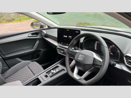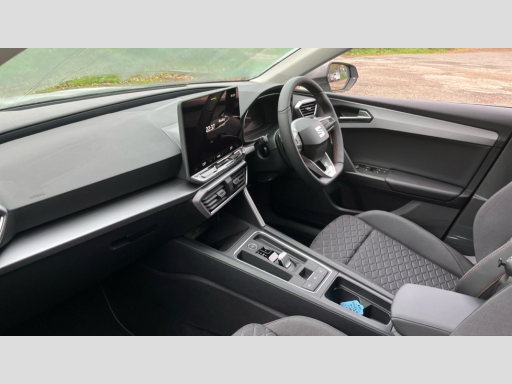 Seat Leon 1.5 eTSI 150 FR 5dr DSG [DAP] Digital cockpit with multifunction display, Driver attention alert with drowsiness warning, E-call, Front assist with forward collision warning braking reaction to vehicles, pedestrians and cyclists, Full link smartphone integration with Mirror Link, wireless Apple CarPlay and wired Google Android Auto, Intelligent speed assist, Lane assist, Lockable tailgate, Park assist (inc front/rear parking sensors), Power assisted speed sensitive electro-mechanical steering, Rear view camera, RPM, trip computer, outside temp gauge, instrument light brightness, low fuel warning light, lights on reminder, gearshift indicator, SEAT drive profile with 4 modes (Eco/Normal/Sport/Individual), throttle response and gearshift mode, Service interval indicator, Start/stop system with regenerative braking, Sports suspension, XDS electronic differential lock and dynamic traction support, 2 front and 2 rear USB-C ports, Auxiliary input socket, Auto dimming rear view mirror, Black roof rails, Body colour door handles, Body coloured bumpers, Cosmo grey exterior mirrors with integrated LED indicators, Dark tinted rear windows, Dynamic headlight range control, Dynamic turn signal lights, Electric front/rear windows, Electrically adjustable, heated and folding door mirrors, FR sports bumper, Illuminated front door sill, LED front fog lamps, LED headlights and LED infinite rear tail lights, LED rear fog lamp with rear coast to coast light, Rear side wing doors, Rear wash/wipe, Separate daytime running light with automatic headlight control and coming home feature, Third brake light, Windshield wiper intermittent control with light/rain sensor, 12v power point in centre console, 3 seat bench in 2nd row, 60/40 split rear bench seat with armrest, Ambient lighting with glovebox, footwell and single monocolour, Driver/passenger manual seat height adjustment, Dust/pollen filter, Front and rear height adjustable headrests, Front and rear reading lights X 4, Front centre armrest, Front seatback storage pockets, Grey headlining, Height/reach adjust steering wheel, ISOFIX points in outer rear seats with top tether anchorage points, Luggage tie-down hooks, Lumbar adjustment for front seats, Single front passenger seat, Sliding boot cover, Sunvisors with covered illuminated mirror, Three zone climate control, Two tone cloth upholstery, Media system plus with navigation - Leon, 3 point seatbelts on all rear seats, ABS, Brake control system - ESC and brake booster, Child proof door locks, Driver and front passenger airbags with front passenger airbag de-activation, front side and curtain airbags, Electronic parking brake, Extended safety system - seat belt tensioner, window closure and hazard lights, Hill hold control, Rear disc brakes, Seat belt reminder for front and rear seats, Tyre pressure monitoring system, Anti theft alarm system with interior monitoring in cab, backup horn and towing protection, KESSY Go (Keyless start), Locking wheel bolts, Wireless phone charging, Chrome interior detailing, 17" Dynamic Bi-spoke alloy wheels with 91W tyres, Tool kit without jack