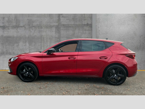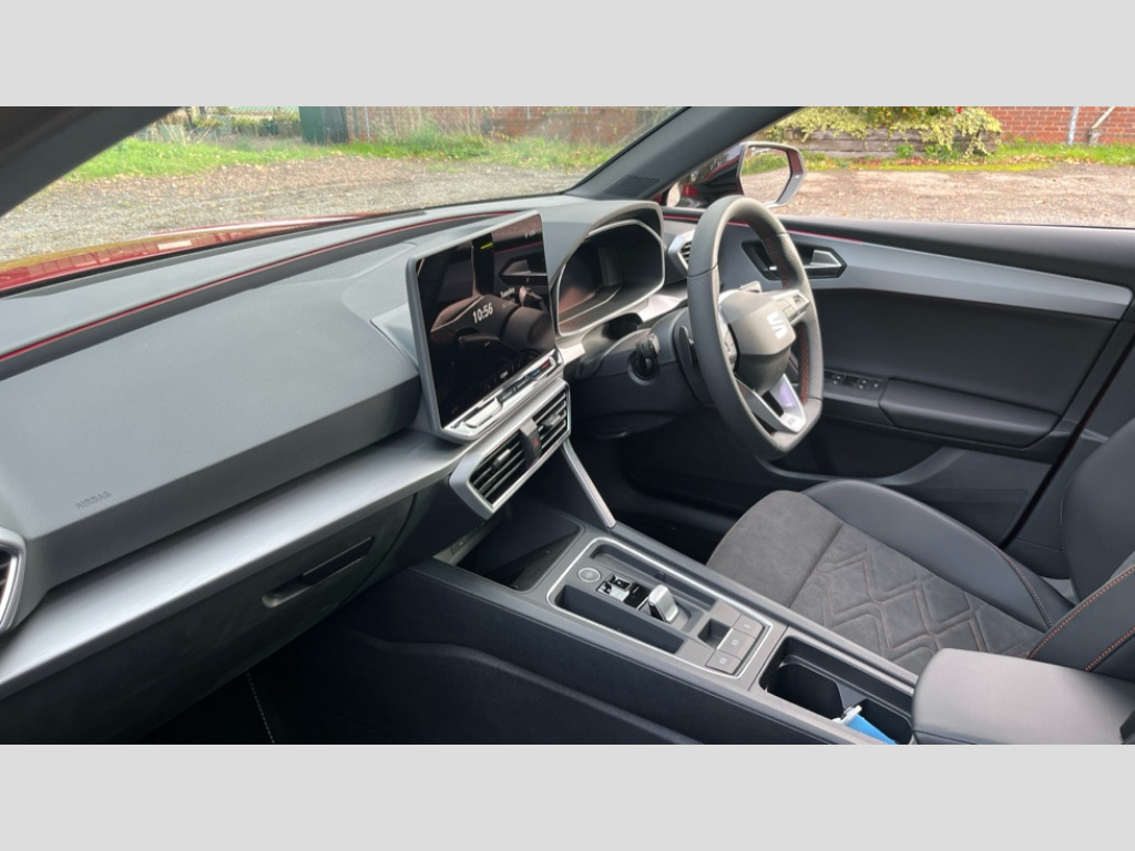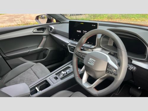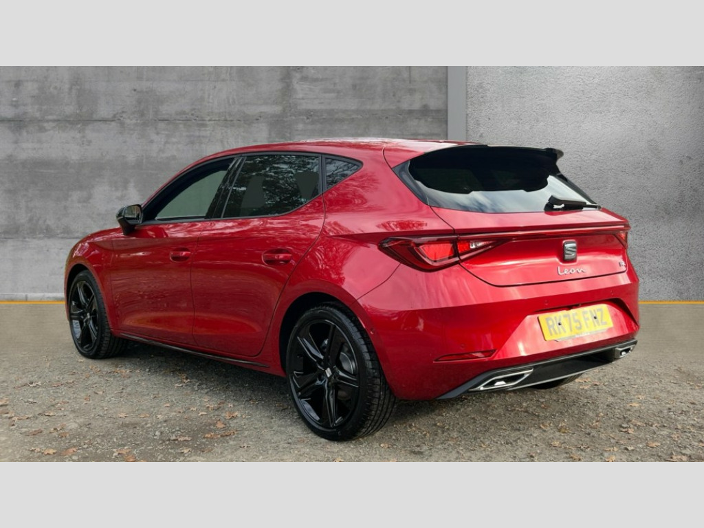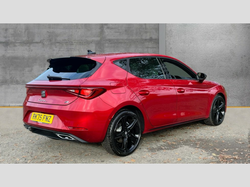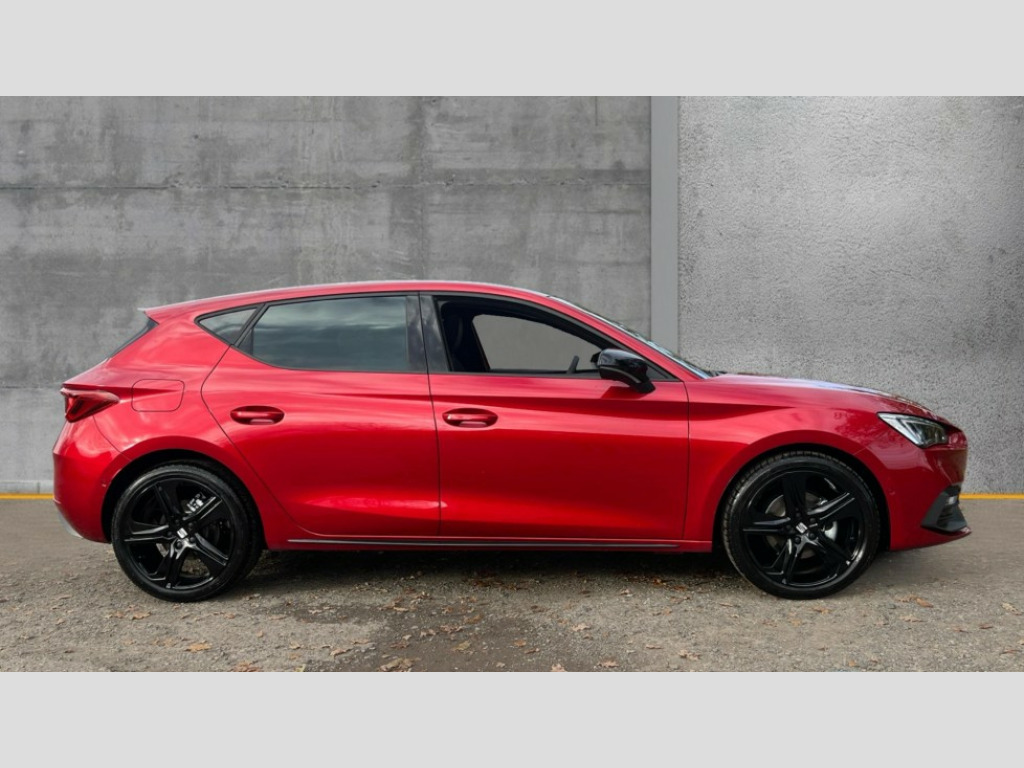 Seat Leon 1.5 eTSI 150 FR Black Edition 5dr DSG [DAP] Digital cockpit with multifunction display, Driver attention alert with drowsiness warning, E-call, Front assist with forward collision warning braking reaction to vehicles, pedestrians and cyclists, Full link smartphone integration with Mirror Link, wireless Apple CarPlay and wired Google Android Auto, Intelligent speed assist, Lane assist, Lockable tailgate, Park assist (inc front/rear parking sensors), Power assisted speed sensitive electro-mechanical steering, Rear view camera, RPM, trip computer, outside temp gauge, instrument light brightness, low fuel warning light, lights on reminder, gearshift indicator, SEAT drive profile with 4 modes (Eco/Normal/Sport/Individual), throttle response and gearshift mode, Service interval indicator, Start/stop system with regenerative braking, Sports suspension, XDS electronic differential lock and dynamic traction support, 2 front and 2 rear USB-C ports, Auxiliary input socket, Auto dimming rear view mirror, Black door mirror housings, Black roof spoiler, Black side skirts, Body colour door handles, Body coloured bumpers, Dark tinted rear windows, Door mirror LED indicator lights, Dynamic headlight range control, Electric front/rear windows, Electrically adjustable, heated and folding door mirrors, FR sports bumper, Illuminated front door sill, LED front fog lamps, LED rear fog lamp with rear coast to coast light, Matrix LED headlights and beams with variable light distribution, LED rear light, Panoramic sunroof, Rear side wing doors, Rear wash/wipe, Separate daytime running light with automatic headlight control and coming home feature, Third brake light, Windshield wiper intermittent control with light/rain sensor, 12v power point in centre console, 3 seat bench in 2nd row, 60/40 split rear bench seat with armrest, Ambient lighting with glovebox, footwell and single monocolour, Black headlining, Dust/pollen filter, Folding boot cover, Front and rear height adjustable headrests, Front and rear reading lights X 4, Front centre armrest, Front seatback storage pockets, Heated front seats, Height/reach adjust steering wheel, Interior wraparound lighting (FR), ISOFIX points in outer rear seats with top tether anchorage points, Luggage tie-down hooks, Lumbar adjustment for front seats, Manual driver seat with memory and height adjustable passenger seat, Microsuede cloth upholstery, Single front passenger seat, Sunvisors with covered illuminated mirror, Three zone climate control, Media system plus with navigation - Leon, 3 point seatbelts on all rear seats, ABS, Brake control system - ESC and brake booster, Child proof door locks, Driver and front passenger airbags with front passenger airbag de-activation, front side and curtain airbags, Electronic parking brake, Extended safety system - seat belt tensioner, window closure and hazard lights, Hill hold control, Rear disc brakes, Seat belt reminder for front and rear seats, Tyre pressure monitoring system, Anti theft alarm system with interior monitoring in cab, backup horn and towing protection, KESSY Advanced - Keyless start, keyless entry, Locking wheel bolts, Wireless phone charging, Chrome interior detailing, 18" Black alloy wheels, Tool kit without jack
