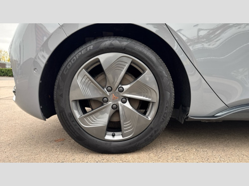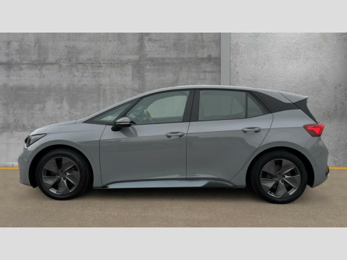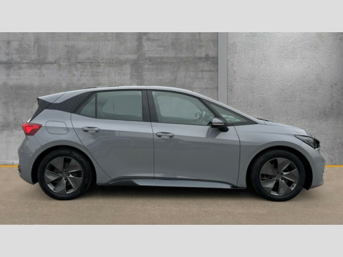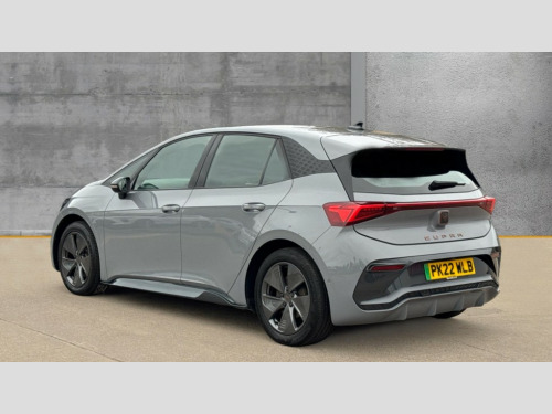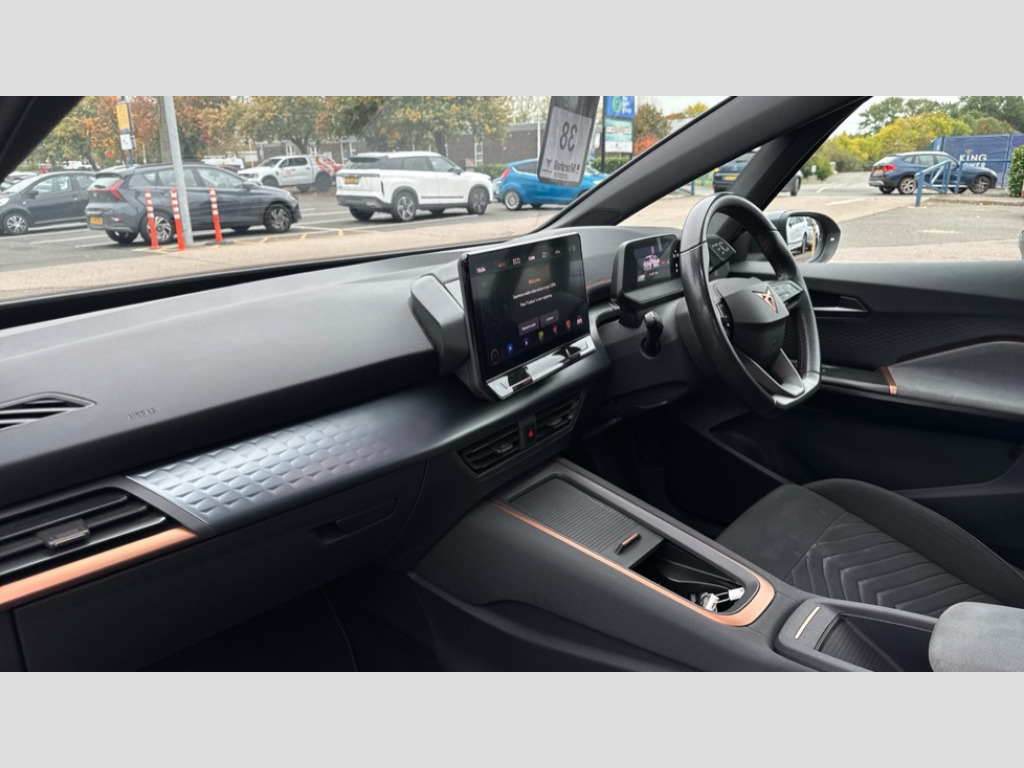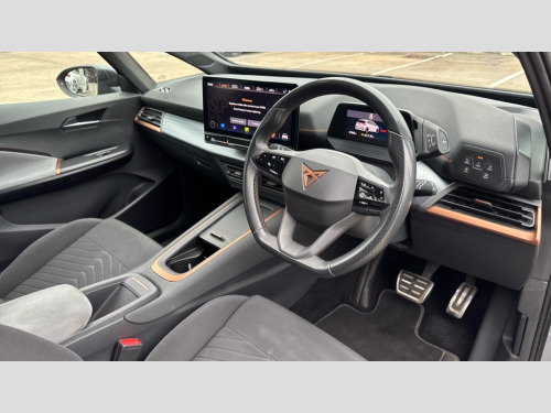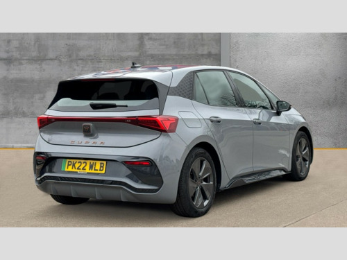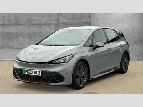 Cupra Born 150kW V1 58kWh 5dr Auto 5.3" digital cockpit with 12" central display infotainment system, Bluetooth without wireless charger, Driving profile selection - Range, Comfort, Performance, Individual, Dynamic steering, e-call service, Emergency steering support with turn assist, Forward collision warning with automatic braking, Front/rear park distance control, Lane assist, Tailgate, Voice assistant, Wireless full link smartphone integration, Shock absorption in front, Sports rear shock absorption, 2x USB sockets in front, 2x USB sockets in rear, charge only, DAB (Digital Audio Broadcasting) and AM/FM radio, Acoustic windshield, Auto dimming rear view mirror, Daytime running lights, Electric adjustable/heated/folding door mirrors, Full LED headlights, Grey exterior mirrors, Heat insulated glass, LED 3rd brake light, LED rear lights, Rear side wing doors, Rear wiper, Transport protection film, Variable intermittent wiper, Welcome home function and adverse weather function, Windshield wiper with light/rain sensor, 3 seat bench in 2nd row, Aluminium pedals, CUPRA emblem on steering wheel, Dual zone climate control, Electric auxiliary air heater, Heated leather wrapped multi function steering wheel, Integrated front head restraints, ISOFIX points in outer rear seats with top tether anchorage points, Manual height adjustable front seats, Multi-colour ambient interior lighting, Rear headrests, SEAQUAL Yarn cloth upholstery, Single front passenger seat, Sunvisors with illuminated mirror, Unsplit rear seat bench, split folding backrest, without centre armrest, Pilot M pack - Born, 3 point seatbelts on all rear seats, Driver and front passenger airbags with front passenger airbag deactivation, side airbag in front with curtain airbag and front interaction airbag, Extended safety system with proactive passenger protection system, Manual child lock in rear doors, Tiredness recognition system, driver alert system, Tyre pressure monitoring system, Visual and acoustic seat belt reminder, Anti theft alarm system with interior monitoring in cab, backup horn and towing protection, Anti theft wheel bolts, Keyless go central locking system, 18" Cyclone alloy wheels, Tool kit, Tyre repair kit