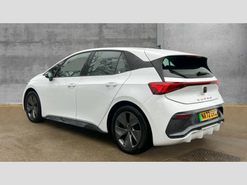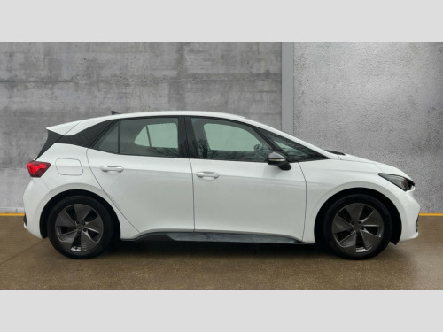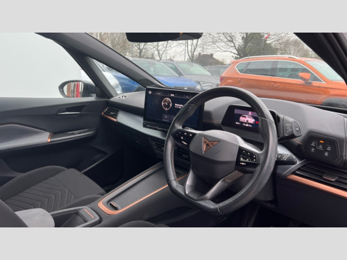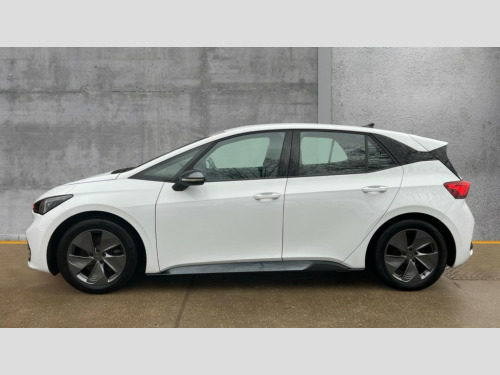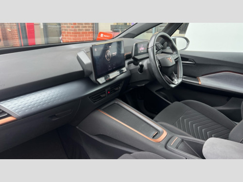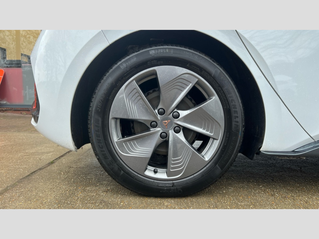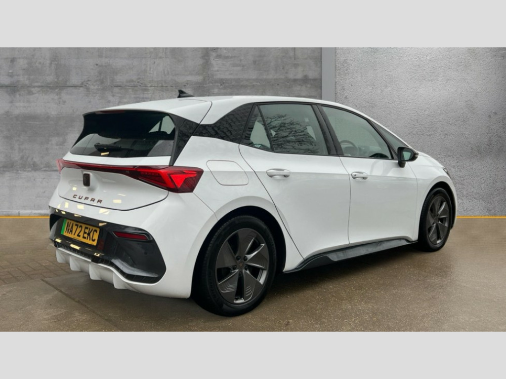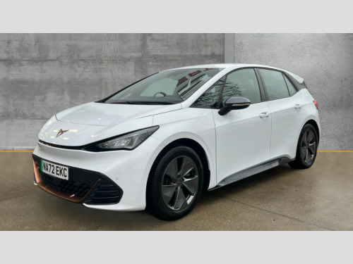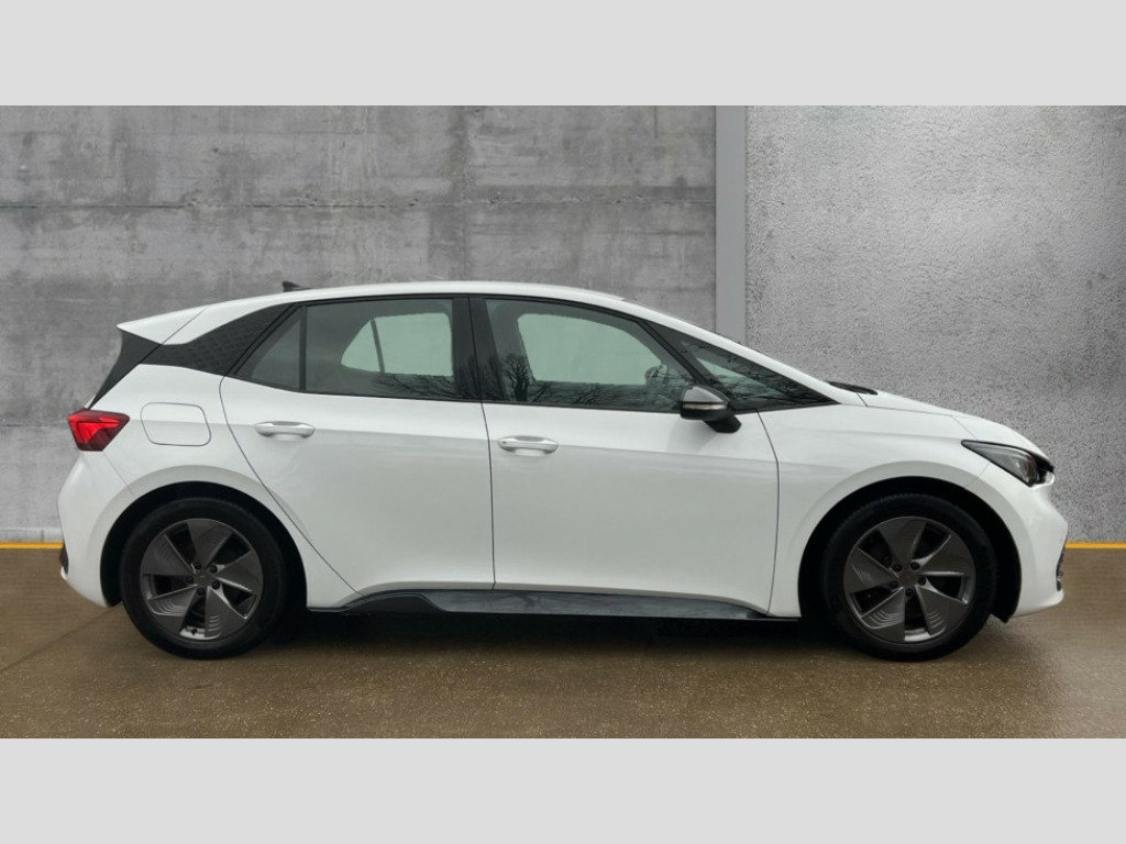 Cupra Born 150kW V1 58kWh 5dr Auto 5.3" digital cockpit with 12" central display infotainment system, Bluetooth without wireless charger, Driving profile selection - Range, Comfort, Performance, Individual, Dynamic steering, e-call service, Emergency steering support with turn assist, Forward collision warning with automatic braking, Front/rear park distance control, Lane assist, PAS, Tailgate, Voice assistant, Wireless full link smartphone integration, 120kW DC charging capacity, Shock absorption in front, Sports rear shock absorption, 2x USB sockets in front, 2x USB sockets in rear, charge only, DAB (Digital Audio Broadcasting) and AM/FM radio, Acoustic windshield, Auto dimming rear view mirror, Daytime running lights, Electric adjustable/heated/folding door mirrors, Full LED headlights, Grey exterior mirrors, Heat insulated glass, LED 3rd brake light, LED rear lights, Rear side wing doors, Rear wiper, Transport protection film, Variable intermittent wiper, Welcome home function and adverse weather function, Windshield wiper with light/rain sensor, 3 seat bench in 2nd row, Aluminium pedals, CUPRA emblem on steering wheel, Dual zone climate control, Electric auxiliary air heater, Heated leather wrapped multi function steering wheel, Integrated front head restraints, ISOFIX points in outer rear seats with top tether anchorage points, Manual height adjustable front seats, Multi-colour ambient interior lighting, Rear headrests, SEAQUAL Yarn cloth upholstery, Single front passenger seat, Sunvisors with illuminated mirror, Unsplit rear seat bench, split folding backrest, without centre armrest, Pilot M pack - Born, 3 point seatbelts on all rear seats, Driver and front passenger airbags with front passenger airbag deactivation, side airbag in front with curtain airbag and front interaction airbag, Extended safety system with proactive passenger protection system, Manual child lock in rear doors, Tiredness recognition system, driver alert system, Tyre pressure monitoring system, Visual and acoustic seat belt reminder, Anti theft alarm system with interior monitoring in cab, backup horn and towing protection, Anti theft wheel bolts, Keyless go central locking system, 18" Cyclone alloy wheels, Tool kit, Tyre repair kit