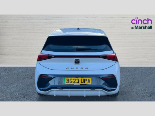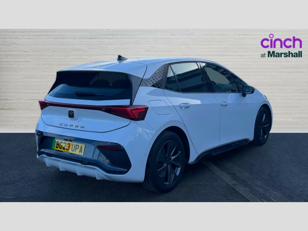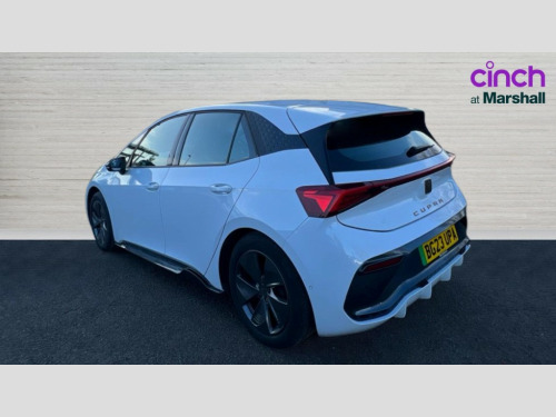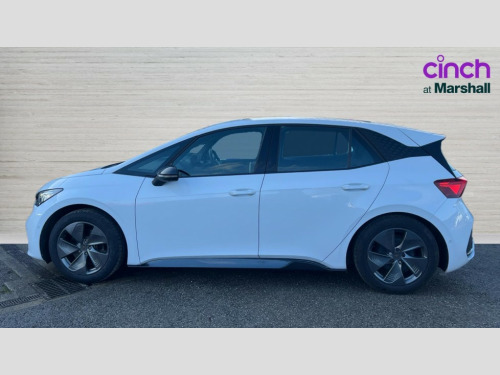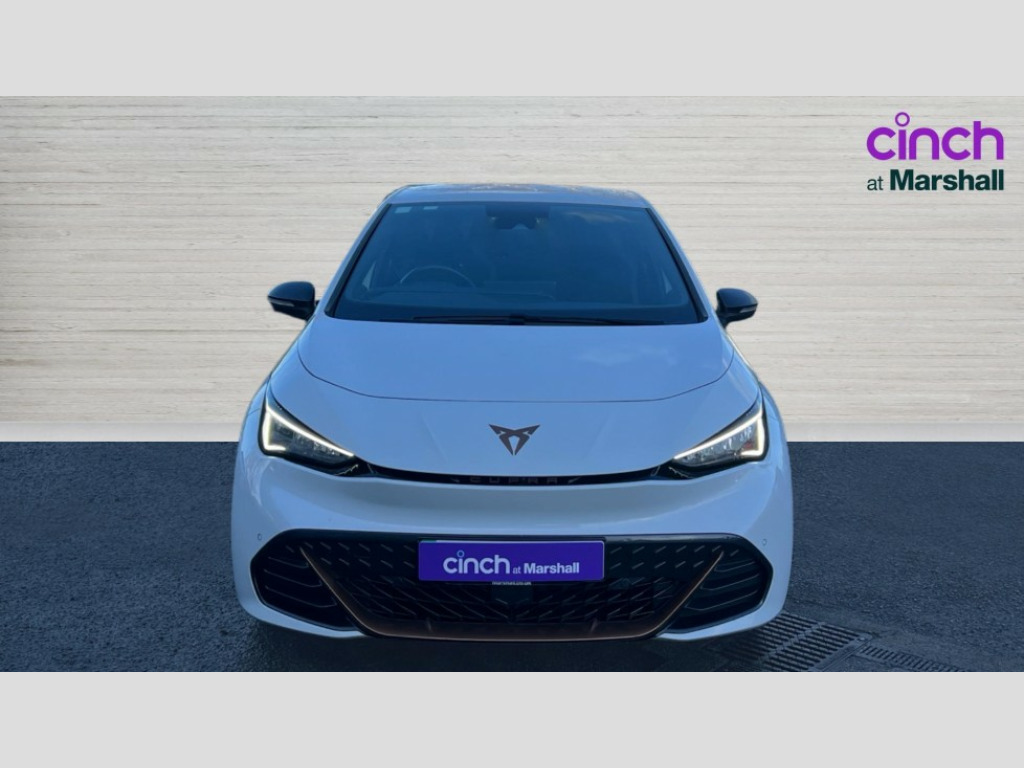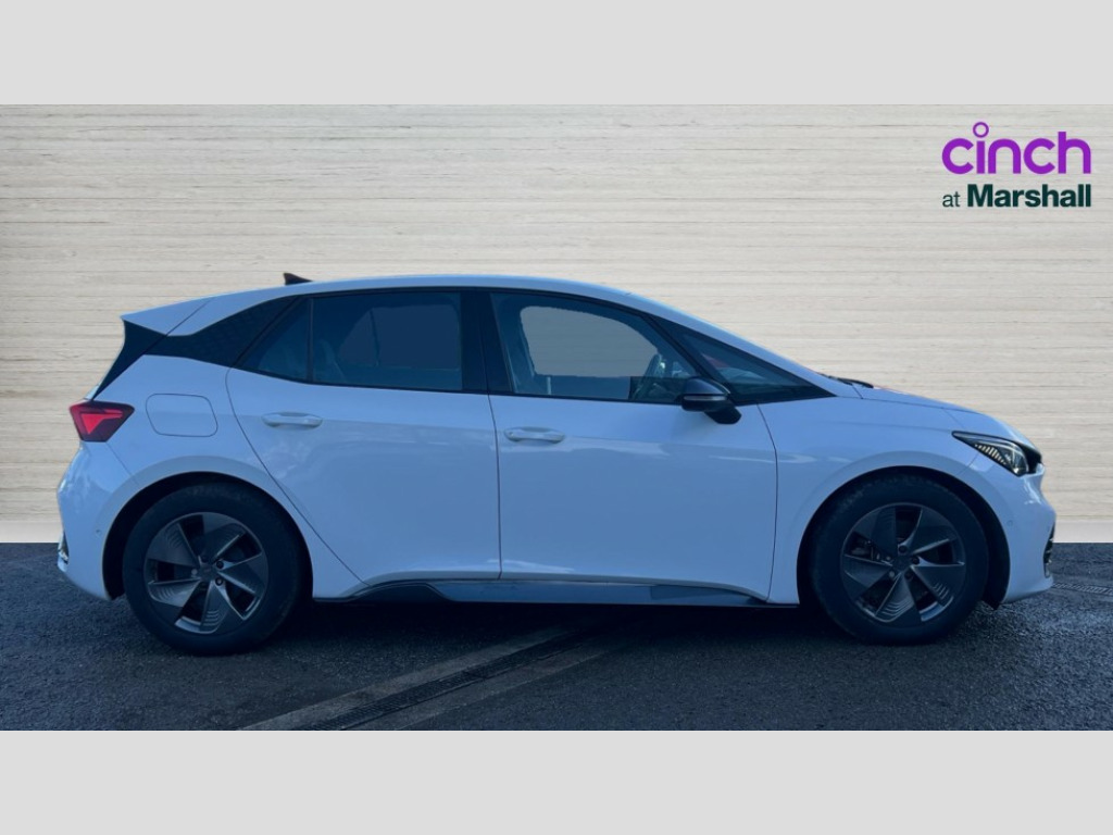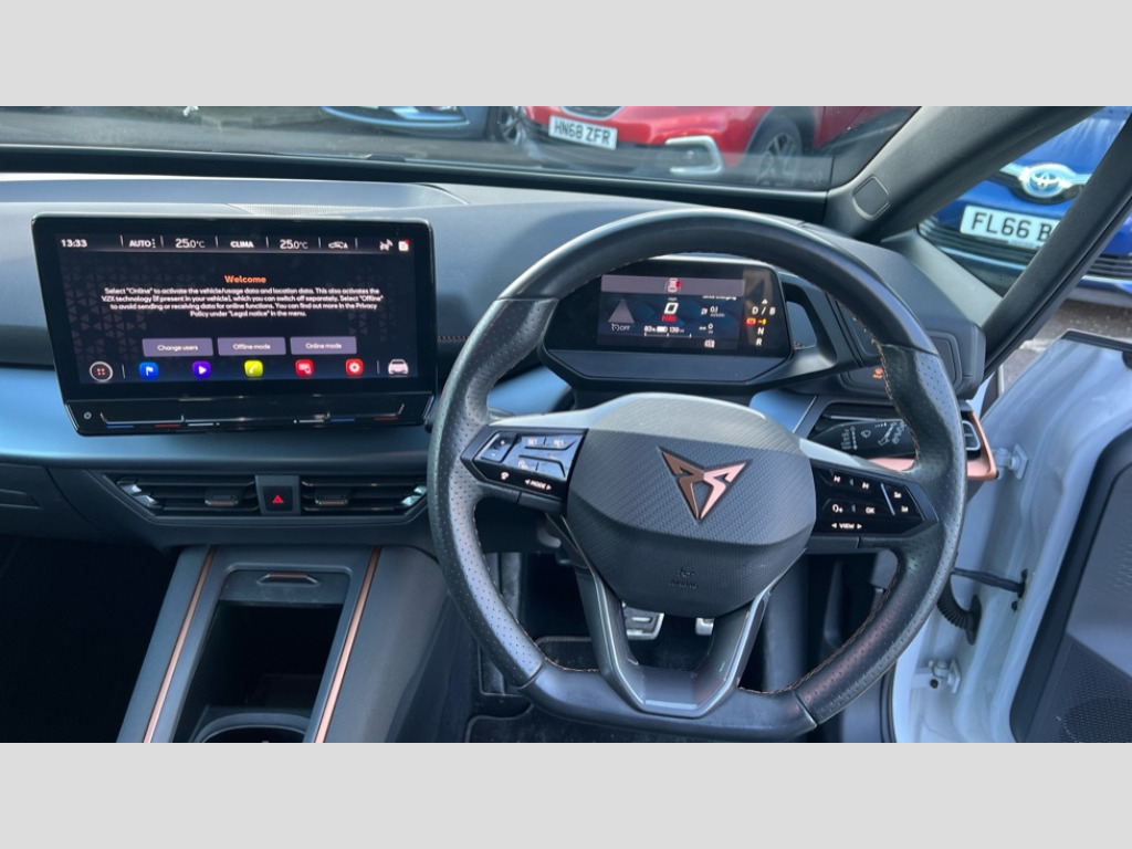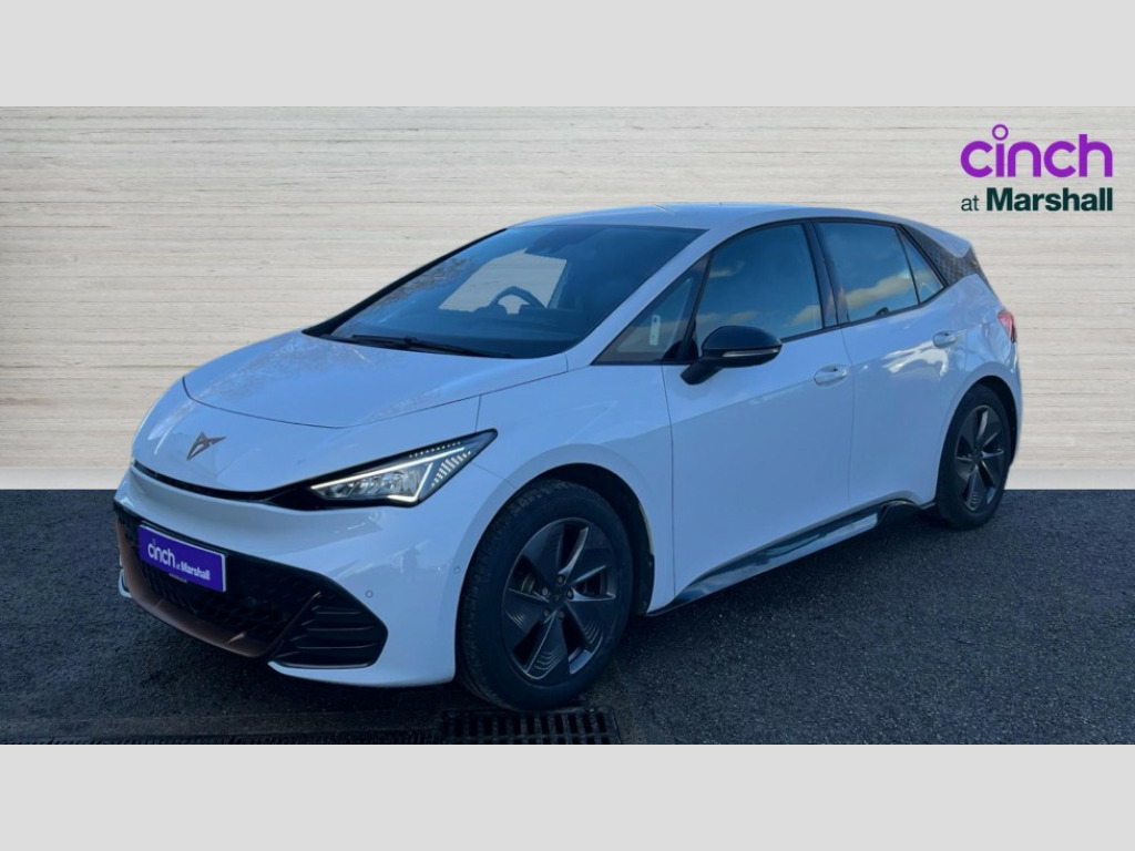 Cupra Born 150kW V1 58kWh 5dr Auto 5.3" digital cockpit with 12" central display infotainment system, Bluetooth without wireless charger, Driving profile selection - Range, Comfort, Performance, Individual, Dynamic steering, Emergency steering support with turn assist, Forward collision warning with automatic braking, Front/rear park distance control, Lane assist, PAS, Tailgate, Voice assistant, Wireless full link smartphone integration, 120kW DC charging capacity, Shock absorption in front, Sports rear shock absorption, 2x USB sockets in front, 2x USB sockets in rear, charge only, DAB (Digital Audio Broadcasting) and AM/FM radio, Acoustic windshield, Auto dimming rear view mirror, Daytime running lights, Electric adjustable/heated/folding door mirrors, Full LED headlights, Grey exterior mirrors, Heat insulated glass, LED 3rd brake light, LED rear lights, Rear side wing doors, Rear wiper, Transport protection film, Variable intermittent wiper, Welcome home function and adverse weather function, Windshield wiper with light/rain sensor, 3 seat bench in 2nd row, Aluminium pedals, CUPRA emblem on steering wheel, Dual zone climate control, Electric auxiliary air heater, Heated leather wrapped multi function steering wheel, Integrated front head restraints, ISOFIX points in outer rear seats with top tether anchorage points, Manual height adjustable front seats, Multi-colour ambient interior lighting, Rear headrests, SEAQUAL Yarn cloth upholstery, Single front passenger seat, Sunvisors with illuminated mirror, Unsplit rear seat bench, split folding backrest, without centre armrest, 3 point seatbelts on all rear seats, Driver and front passenger airbags with front passenger airbag deactivation, side airbag in front with curtain airbag and front interaction airbag, Extended safety system with proactive passenger protection system, Manual child lock in rear doors, Public e-call, Tiredness recognition system, driver alert system, Tyre pressure monitoring system, Visual and acoustic seat belt reminder, Anti theft alarm system with interior monitoring in cab, backup horn and towing protection, Anti theft wheel bolts, Keyless go central locking system, 18" Cyclone alloy wheels, Tool kit, Tyre repair kit