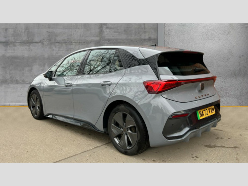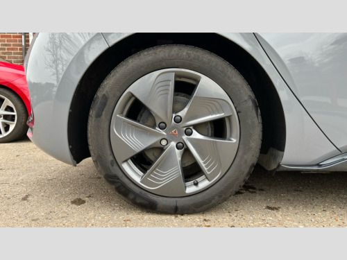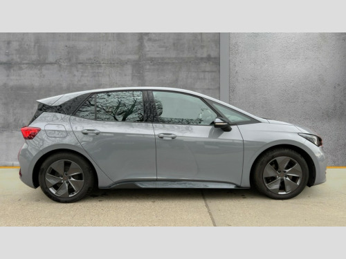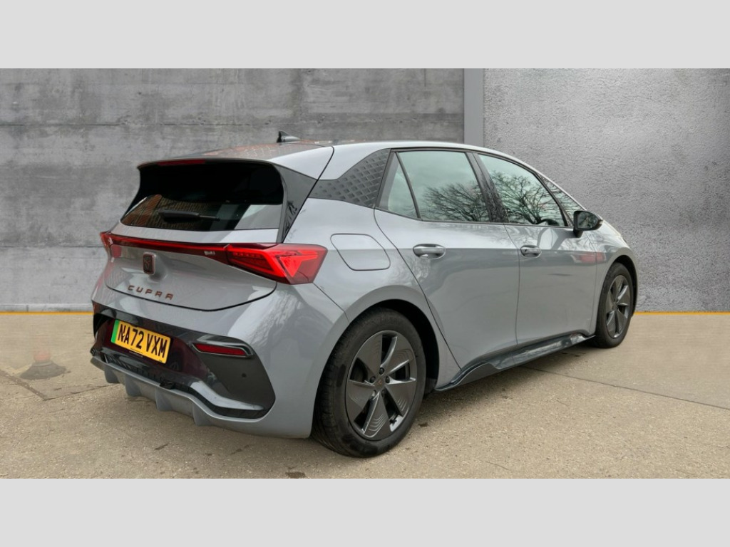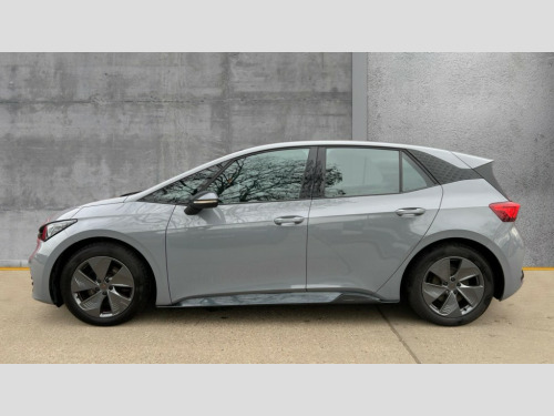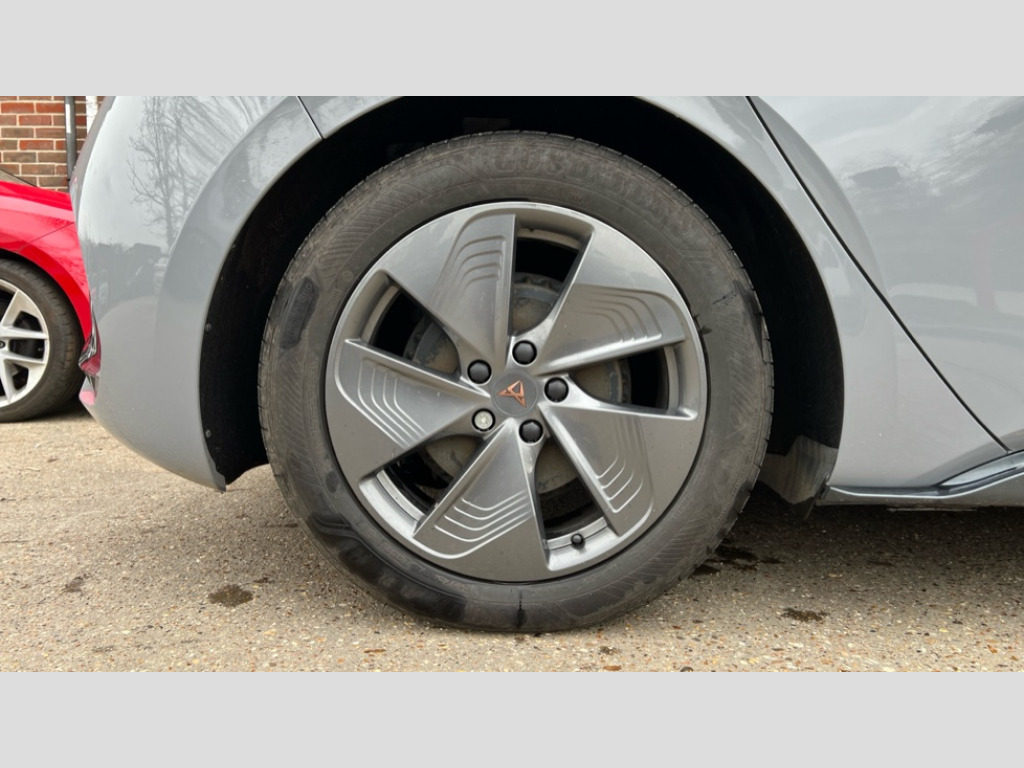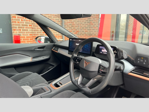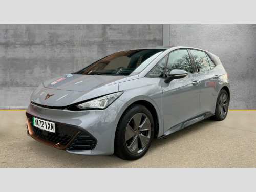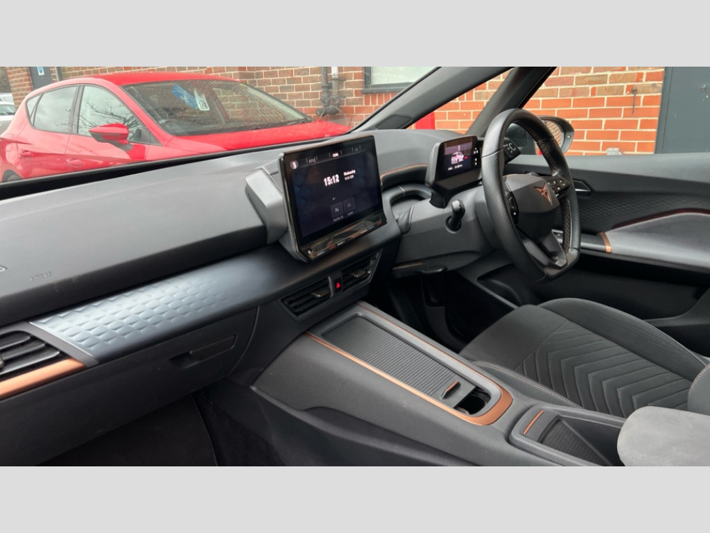 Cupra Born 150kW V1 58kWh 5dr Auto 5.3" digital cockpit with 12" central display infotainment system, Bluetooth without wireless charger, Driving profile selection - Range, Comfort, Performance, Individual, Dynamic steering, e-call service, Emergency steering support with turn assist, Forward collision warning with automatic braking, Front/rear park distance control, Lane assist, PAS, Tailgate, Voice assistant, Wireless full link smartphone integration, 120kW DC charging capacity, Shock absorption in front, Sports rear shock absorption, 2x USB sockets in front, 2x USB sockets in rear, charge only, DAB (Digital Audio Broadcasting) and AM/FM radio, Acoustic windshield, Auto dimming rear view mirror, Daytime running lights, Electric adjustable/heated/folding door mirrors, Full LED headlights, Grey exterior mirrors, Heat insulated glass, LED 3rd brake light, LED rear lights, Rear side wing doors, Rear wiper, Transport protection film, Variable intermittent wiper, Welcome home function and adverse weather function, Windshield wiper with light/rain sensor, 3 seat bench in 2nd row, Aluminium pedals, CUPRA emblem on steering wheel, Dual zone climate control, Electric auxiliary air heater, Heated leather wrapped multi function steering wheel, Integrated front head restraints, ISOFIX points in outer rear seats with top tether anchorage points, Manual height adjustable front seats, Multi-colour ambient interior lighting, Rear headrests, SEAQUAL Yarn cloth upholstery, Single front passenger seat, Sunvisors with illuminated mirror, Unsplit rear seat bench, split folding backrest, without centre armrest, Pilot M pack - Born, 3 point seatbelts on all rear seats, Driver and front passenger airbags with front passenger airbag deactivation, side airbag in front with curtain airbag and front interaction airbag, Extended safety system with proactive passenger protection system, Manual child lock in rear doors, Tiredness recognition system, driver alert system, Tyre pressure monitoring system, Visual and acoustic seat belt reminder, Anti theft alarm system with interior monitoring in cab, backup horn and towing protection, Anti theft wheel bolts, Keyless go central locking system, 18" Cyclone alloy wheels, Tool kit, Tyre repair kit