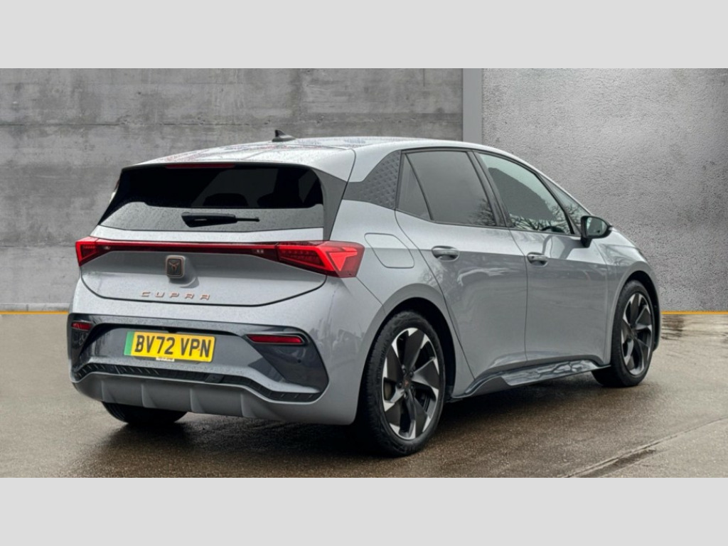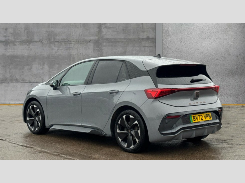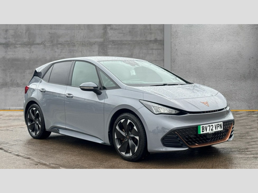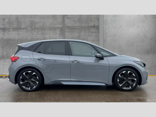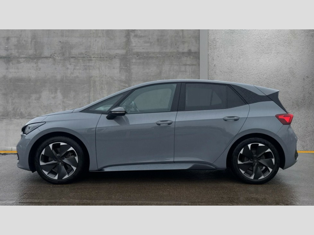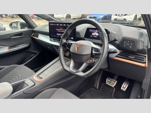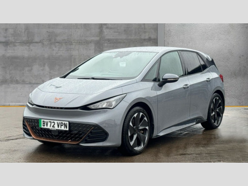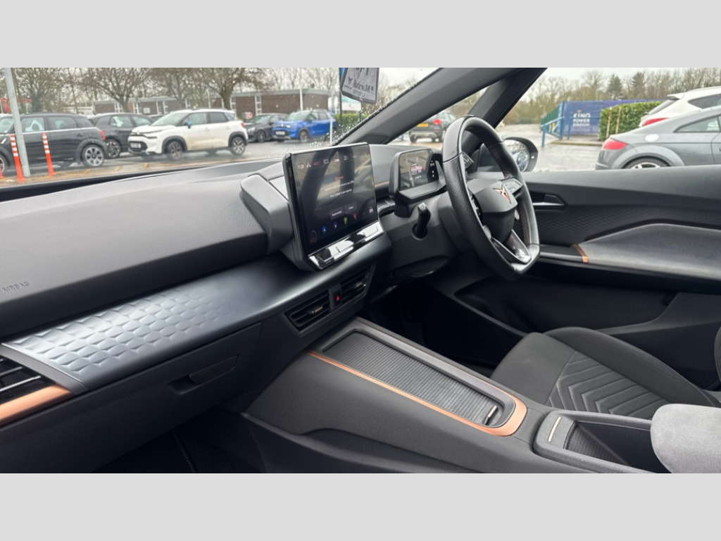 Cupra Born 169kW e-Boost V2 58kWh 5dr Auto 5.3" digital cockpit with 12" central display infotainment system, Augmented reality head up display, Bluetooth without wireless charger, Driving profile selection - Range, Comfort, Performance, Individual, Dynamic steering, Emergency steering support with turn assist, Forward collision warning with automatic braking, Front/rear park distance control, Lane assist, PAS, Tailgate, Voice assistant, Wireless full link smartphone integration, 120kW DC charging capacity, Shock absorption in front, Sports rear shock absorption, 2x USB sockets in front, 2x USB sockets in rear, charge only, DAB (Digital Audio Broadcasting) and AM/FM radio, Acoustic windshield, Auto dimming rear view mirror, Dark tinted rear windows, Daytime running lights, Electric adjustable/heated/folding door mirrors, Full LED headlights, Grey exterior mirrors, Heat insulated glass, Heated washer nozzles, LED 3rd brake light, LED rear lights, Rear side wing doors, Rear wiper, Transport protection film, Variable intermittent wiper, Welcome home function and adverse weather function, Windshield wiper with light/rain sensor, 3 seat bench in 2nd row, Aluminium pedals, CUPRA emblem on steering wheel, Dual zone climate control, Electric auxiliary air heater, Heated front seats, Heated leather wrapped multi function steering wheel with satellite buttons, Integrated front head restraints, ISOFIX points in outer rear seats with top tether anchorage points, Manual height adjustable front seats, Multi-colour ambient interior lighting, Rear headrests, SEAQUAL Yarn cloth upholstery, Single front passenger seat, Sunvisors with illuminated mirror, Unsplit rear seat bench, split folding backrest, without centre armrest, 3 point seatbelts on all rear seats, Driver and front passenger airbags with front passenger airbag deactivation, side airbag in front with curtain airbag and front interaction airbag, Extended safety system with proactive passenger protection system, Manual child lock in rear doors, Public e-call, Tiredness recognition system, driver alert system, Tyre pressure monitoring system, Visual and acoustic seat belt reminder, Anti theft alarm system with interior monitoring in cab, backup horn and towing protection, Anti theft wheel bolts, Keyless go central locking system, Tool kit, Tyre repair kit
