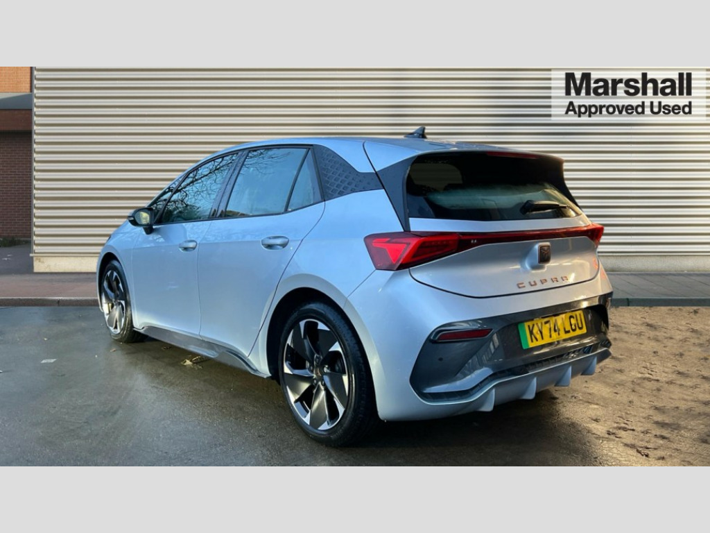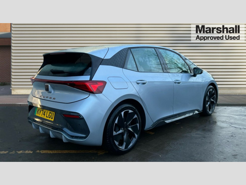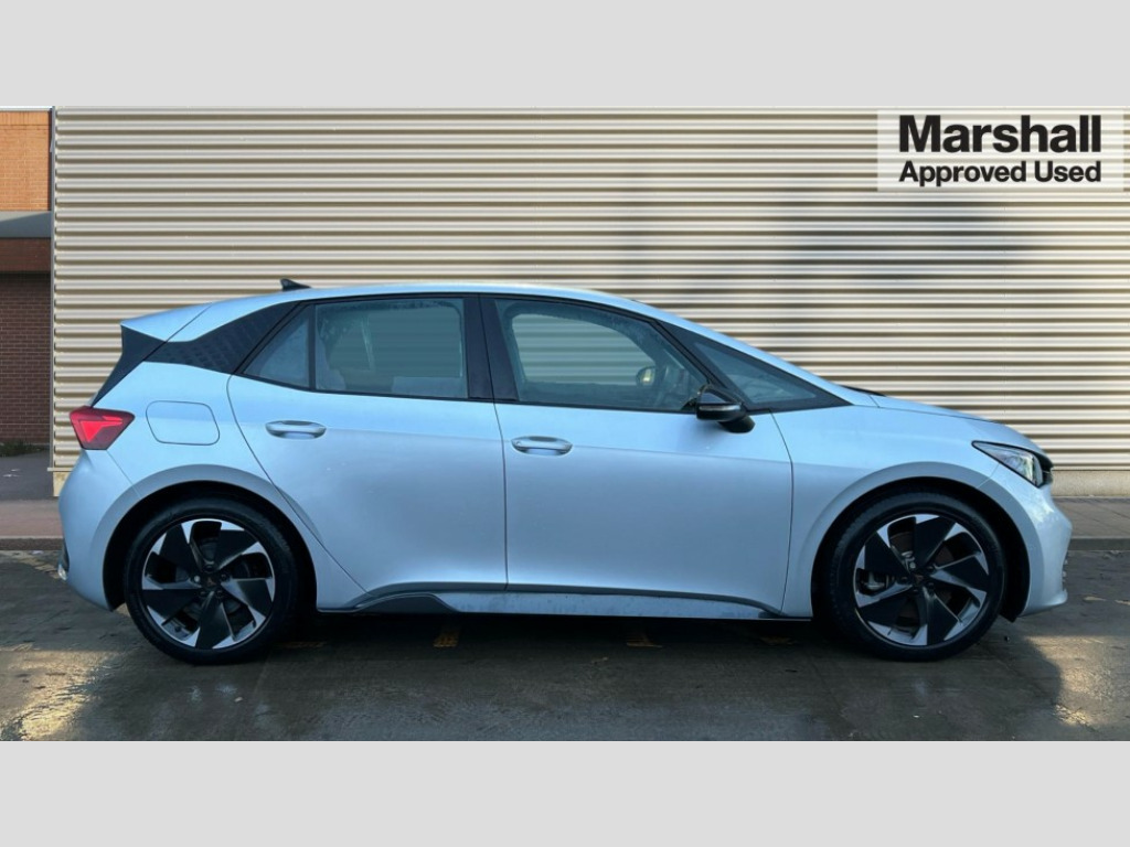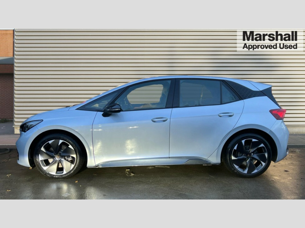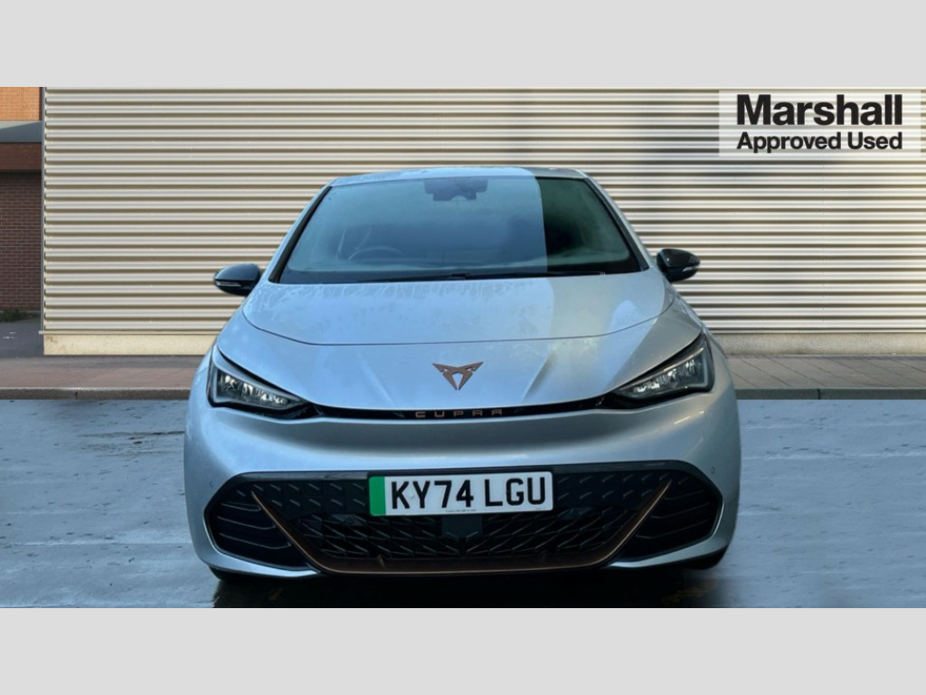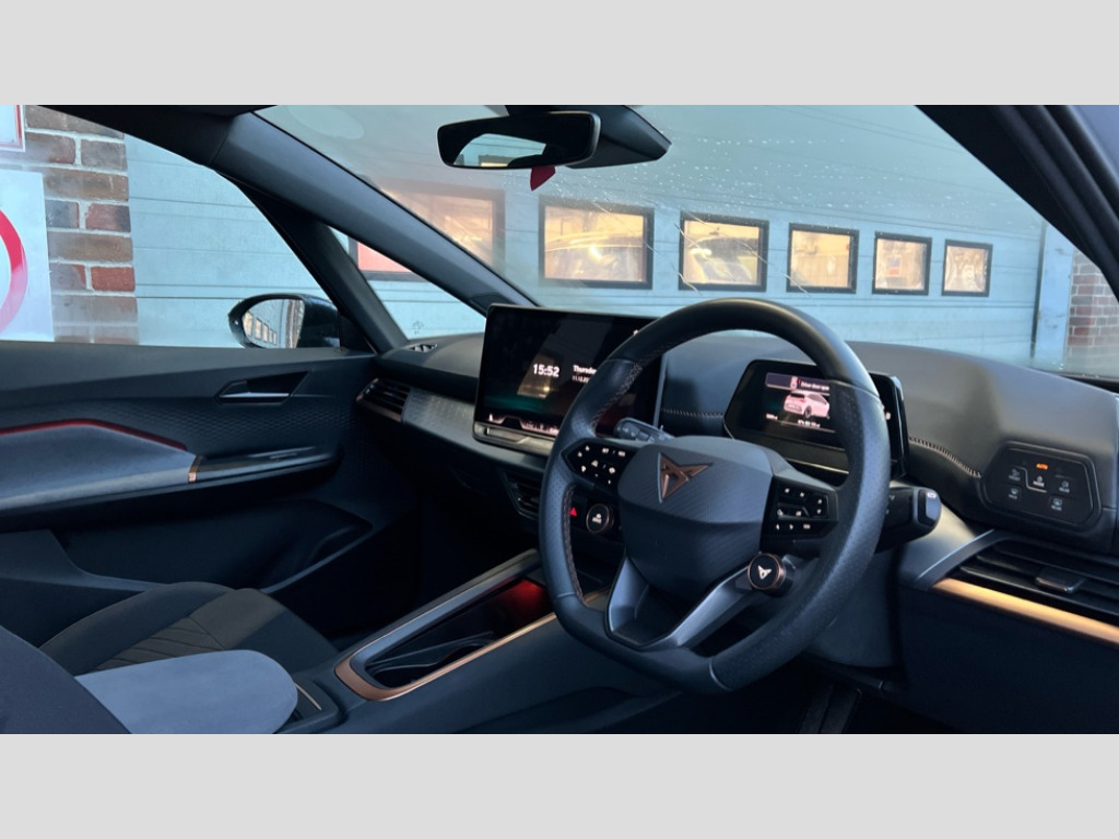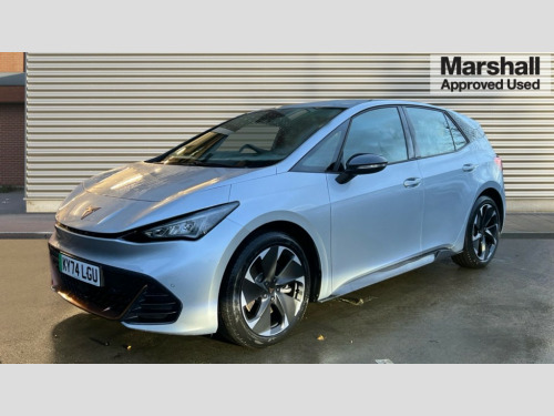 Cupra Born 170kW e-Boost V1 59kWh 5dr Auto 5.3" digital cockpit with 12.9" central display infotainment system, Bluetooth, Driving profile selection - Range, Comfort, Performance, CUPRA Individual, Dynamic steering, e-call service, Emergency steering support with turn assist, Forward collision warning with automatic braking, Lane assist, Right hand drive vehicle, Tailgate, Voice assistant, Wireless full link smartphone integration, 11 kW Onboard charger, 120kW DC charging capacity, Charging cable mode 3, type 2/3 32 A, Shock absorption in front, Sports rear shock absorption, 2x USB sockets in front, 2x USB sockets in rear, charge only, DAB (Digital Audio Broadcasting) and AM/FM radio, Acoustic windshield, Auto dimming rear view mirror, Electric adjustable/heated/folding door mirrors, Full LED headlights, Grey exterior mirrors, Heat insulated glass, LED 3rd brake light, LED daytime running lights, LED rear lights, Rear side wing doors, Rear wiper, Transport protection film, Variable intermittent wiper, Welcome home function and adverse weather function, Windshield wiper with light/rain sensor, 3 seat bench in 2nd row, Aluminium pedals, CUPRA emblem on steering wheel, Dual zone climatronic air conditioning, Electric auxiliary air heater, Heated leather wrapped multi function steering wheel with satellite buttons, Integrated front head restraints, ISOFIX points in outer rear seats with top tether anchorage points, Manual height adjustable front seats, Rear headrests, SEAQUAL Yarn cloth upholstery, Single front passenger seat, Sunvisors with illuminated mirror, Unsplit rear seat bench, split folding backrest, without centre armrest, 3 point seatbelts on all rear seats, Attention and drowsiness assist, Driver and front passenger airbags with front passenger airbag deactivation, side airbag in front with curtain airbag and front interaction airbag, Extended safety system with proactive passenger protection system, Tyre pressure monitoring system, Visual and acoustic seat belt reminder, Anti theft alarm system with interior monitoring in cab, backup horn and towing protection, Anti theft wheel bolts, Keyless go central locking system, Manual child locks, Preparation for alcohol interlock, Warranty - 5 years/90,000 miles, Tool kit, Tyre repair kit