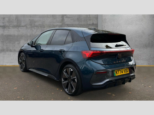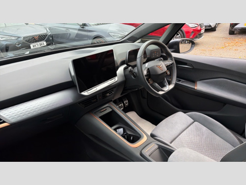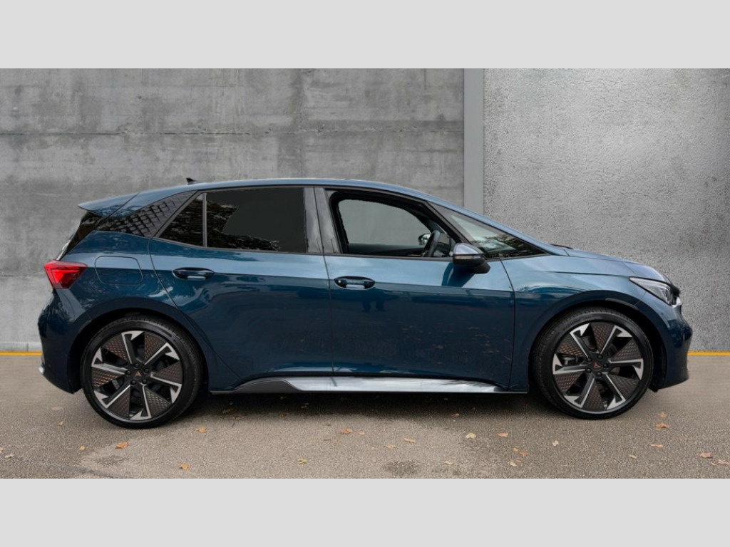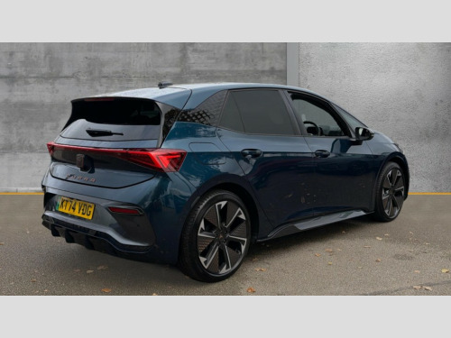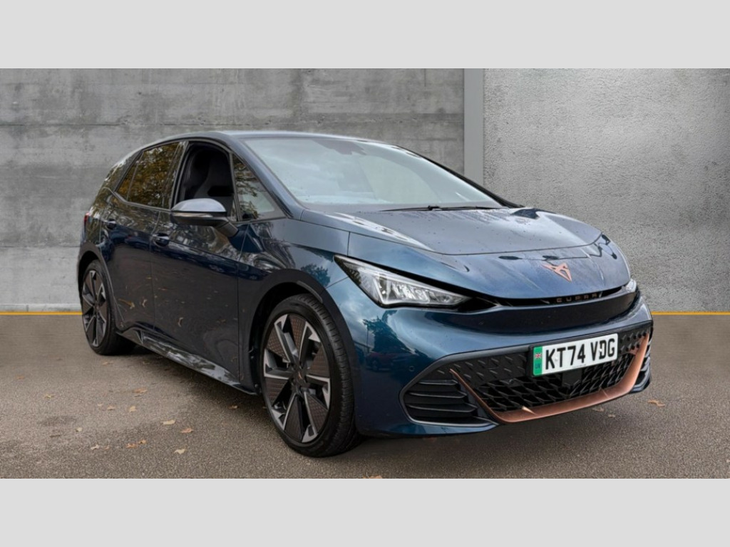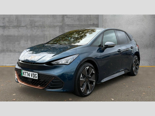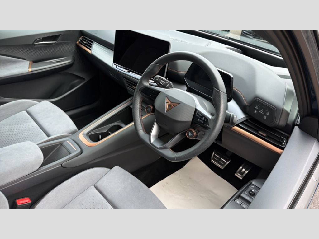 Cupra Born 170kW e-Boost V3 59kWh 5dr Auto 5.3" digital cockpit with 12.9" central display infotainment system, Augmented reality head up display, Bluetooth, Dynamic steering, e-call service, Emergency steering support with turn assist, Forward collision warning with automatic braking, Lane assist, Right hand drive vehicle, Tailgate, Voice assistant, Wireless full link smartphone integration, 11 kW Onboard charger, 165kW DC charging capacity, Charging cable mode 3, type 2/3 32 A, Gear ratio 12976, Shock absorption in front, Sports rear shock absorption, 2x USB sockets in front, 2x USB sockets in rear, charge only, DAB (Digital Audio Broadcasting) and AM/FM radio, Acoustic windshield, Auto dimming rear view mirror, Dark tinted rear windows, Electric adjustable/heated/folding door mirrors, Full LED headlights, Grey exterior mirrors, Heat insulated glass, LED 3rd brake light, LED daytime running lights, LED rear lights, Rear side wing doors, Rear wiper, Transport protection film, Variable intermittent wiper, Welcome home function and adverse weather function, Windshield wiper with light/rain sensor, 3 seat bench in 2nd row, Aluminium pedals, CUPRA emblem on steering wheel, Dual zone climatronic air conditioning, Electric auxiliary air heater, Front bucket seats with 12 way electrically adjustable, pneumatically adjustable lumbar support and massage function, Heated front seats, Heated leather wrapped multi function steering wheel with satellite buttons, Integrated front head restraints, ISOFIX points in outer rear seats with top tether anchorage points, Rear headrests, Single front passenger seat, Sunvisors with illuminated mirror, Unsplit rear seat bench, split folding backrest, with centre armrest, 3 point seatbelts on all rear seats, Attention and drowsiness assist, Driver and front passenger airbags with front passenger airbag deactivation, side airbag in front with curtain airbag and front interaction airbag, Extended safety system with proactive passenger protection system, Tyre pressure monitoring system, Visual and acoustic seat belt reminder, Anti theft alarm system with interior monitoring in cab, backup horn and towing protection, Anti theft wheel bolts, Keyless go central locking system, Manual child locks, Preparation for alcohol interlock, Warranty - 5 years/90,000 miles, Tool kit, Tyre repair kit
