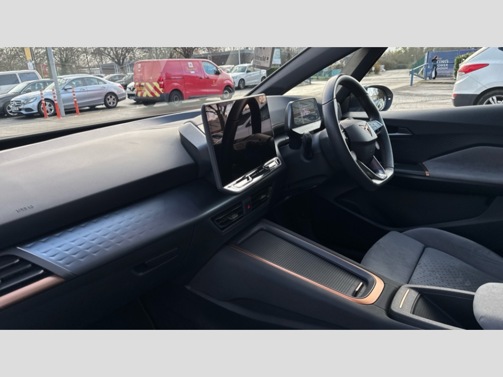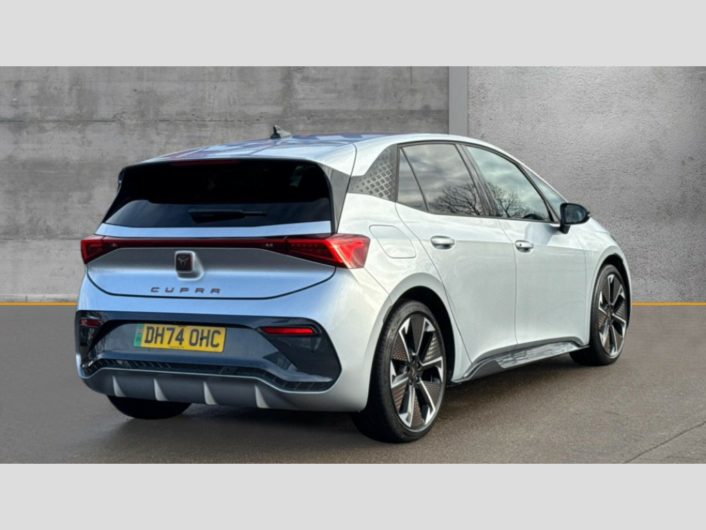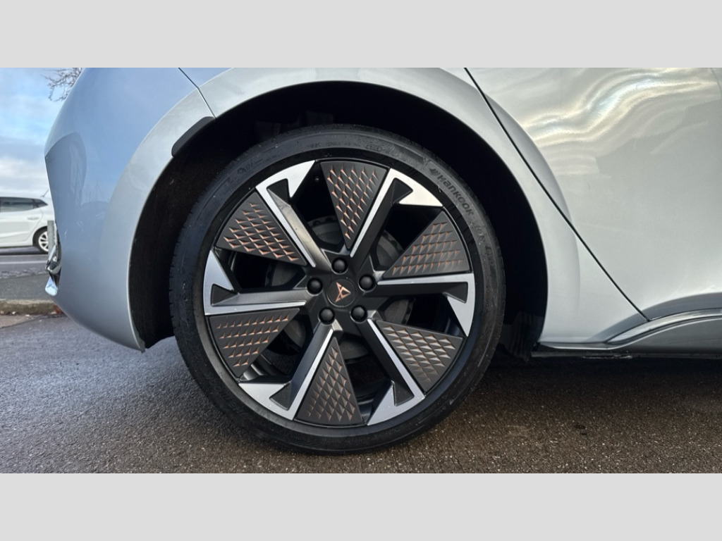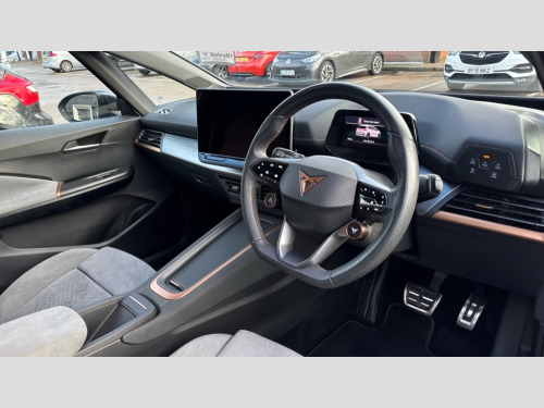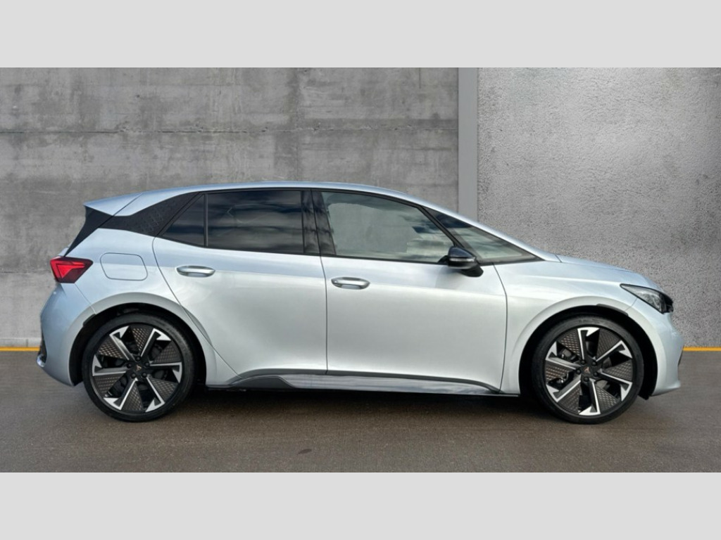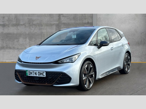 Cupra Born 170kW e-Boost V3 59kWh 5dr Auto 5.3" digital cockpit with 12.9" central display infotainment system, Augmented reality head up display, Bluetooth, Dynamic steering, e-call service, Emergency steering support with turn assist, Forward collision warning with automatic braking, Lane assist, Right hand drive vehicle, Tailgate, Voice assistant, Wireless full link smartphone integration, 11 kW Onboard charger, 165kW DC charging capacity, Charging cable mode 3, type 2/3 32 A, Gear ratio 12976, Shock absorption in front, Sports rear shock absorption, 2x USB sockets in front, 2x USB sockets in rear, charge only, DAB (Digital Audio Broadcasting) and AM/FM radio, Acoustic windshield, Auto dimming rear view mirror, Dark tinted rear windows, Electric adjustable/heated/folding door mirrors, Full LED headlights, Grey exterior mirrors, Heat insulated glass, LED 3rd brake light, LED daytime running lights, LED rear lights, Rear side wing doors, Rear wiper, Transport protection film, Variable intermittent wiper, Welcome home function and adverse weather function, Windshield wiper with light/rain sensor, 3 seat bench in 2nd row, Aluminium pedals, CUPRA emblem on steering wheel, Dual zone climatronic air conditioning, Electric auxiliary air heater, Front bucket seats with 12 way electrically adjustable, pneumatically adjustable lumbar support and massage function, Heated front seats, Heated leather wrapped multi function steering wheel with satellite buttons, Integrated front head restraints, ISOFIX points in outer rear seats with top tether anchorage points, Rear headrests, Single front passenger seat, Sunvisors with illuminated mirror, Unsplit rear seat bench, split folding backrest, with centre armrest, 3 point seatbelts on all rear seats, Attention and drowsiness assist, Driver and front passenger airbags with front passenger airbag deactivation, side airbag in front with curtain airbag and front interaction airbag, Extended safety system with proactive passenger protection system, Tyre pressure monitoring system, Visual and acoustic seat belt reminder, Anti theft alarm system with interior monitoring in cab, backup horn and towing protection, Anti theft wheel bolts, Keyless go central locking system, Manual child locks, Preparation for alcohol interlock, Warranty - 5 years/90,000 miles, Tool kit, Tyre repair kit