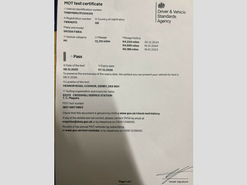 This Skoda Fabia TSI SE from 2015 offers excellent peace of mind with its MOT valid until December 2026 and a clear vehicle history check. Having had its last service on 25th November 2025 at 72,685 miles, this 1.2 litre petrol model is presented with a 6 month warranty for your confidence. The SE trim level includes practical features such as rear parking sensors with parking assistance, manual air conditioning for comfort, and Bluetooth connectivity for seamless phone integration. You can also enjoy the Arkamys Surround Sound Package, which includes a branded sound system for an enhanced audio experience.The Skoda Fabia TSI SE stands out with its impressive fuel economy, achieving a remarkable 60 miles per gallon, which is better than many similar vehicles. Its low CO2 emissions also contribute to its appeal, making it an environmentally conscious choice. Furthermore, this Fabia benefits from a low insurance group, meaning lower running costs for owners. The acceleration from 0 to 60 miles per hour in just 10.5 seconds offers a responsive driving experience, and you will appreciate the generous boot space, providing ample room for shopping or luggage, making it a practical and economical option. in alloy wheels - mato, 3 spoke leather steering wheel, abs - anti-lock braking system, asr - anti slip regulation, air conditioning - manual, airbags - driver, airbags - front passenger, airbags - front side, airbags - passenger deactivation switch, alarm with interior monitoring, anti-theft locking wheel bolts, arkamys surround sound package, bluetooth, bolero radio with telephone control, central locking - remote, centre console - satin black, chrome pack, curtain airbags, dab radio, dashboard - satin black-light brushed, daytime running lights, door handles - body coloured, door mirrors - body coloured, door panels - satin black, eds - electronic differential system, esp - electronic stability programme, electric windows - front, electrically adjustable and heated door mirrors, front assistant, gearknob - leather, grab handles - roof, hba - hydraulic brake assist, handbrake - leather, headlining - pearl grey, height and reach adjustable steering wheel, isofix child seat preparation - outer rear, luggage compartment - hooks, msr - motor slip regulation, mirror link, parking sensors - rear, pollen filter, power steering, reading lights - front, sd card reader, seatbelt warning - front, seats - drivers height adjustment, seats - front passenger height adjustment, speakers x6, speed limiter, storage - under drivers seat, storage - under passenger seat, tpms - tyre pressure monitoring system, trip computer - maxi-dot, usb connection, vanity mirrors - front