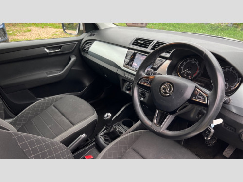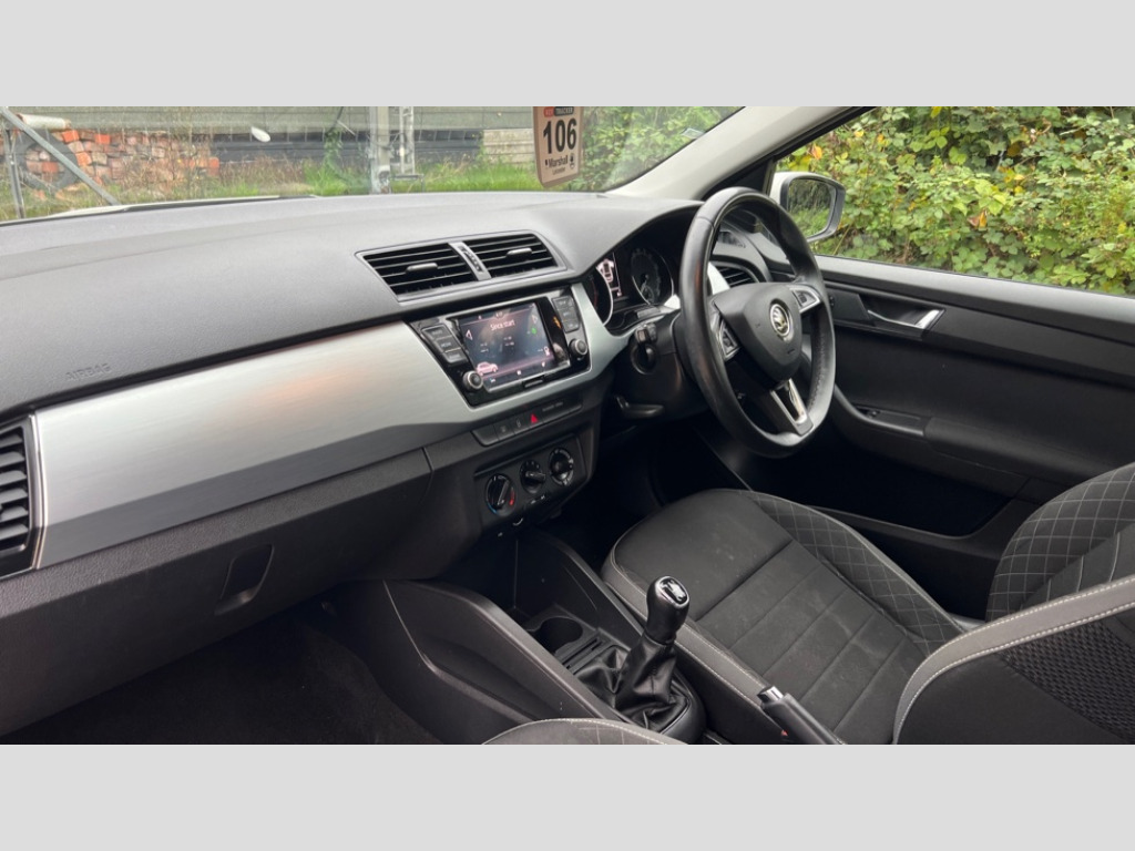 Skoda Fabia 1.0 MPI 75 SE 5dr Exterior temperature gauge, Front assistant collision mitigation, Multi function trip computer, PAS, Service interval indicator, SmartLink plus, Auxiliary socket for external MP3 player, Bolero Radio, DAB Digital radio, Radio swing with 6.5" touchscreen display, Bluetooth, SD card slot, USB port and 6 speakers, Body colour bumpers, Body colour door mirrors and handles, Chrome grille surround, Electric front windows, Electrically adjustable and heated door mirrors, Heated rear window, Height adjustable headlamps, Intermittent rear wash/wipe, LED daytime running lights, Rear fog lights, Tinted rear windows, Tinted windscreen, 1.5L bottle holder in front door panels, 2 height adjustable rear headrests, 60/40 split folding rear seat, Boot stowage box, Cargo area storage tray, Cloth upholstery, Folding grab handles, Front and rear interior lights, Front reading lights, Height adjustable driver's seat, Height adjustable front headrests, Height adjustable passenger seat, Height/reach adjust steering wheel, Isofix child seat mounting points on outer rear seats, Leather handbrake and gearshift lever, Lower glovebox cover, Luggage hooks in the boot, Multifunction leather steering wheel, Parcel shelf, Pearl grey headlining, Pollen filter, Rear courtesy light, Rear storage trays, Sunvisors with vanity mirrors, Ticket holder, Umbrella under front passenger seat, 3x3 point rear seatbelts, ABS + MSR, Curtain and side airbags, Driver and front passenger airbag with front passenger airbag deactivation, EDS, ESC with ASR, Front and rear passenger seatbelt warning light, Front seatbelt pretensioners, Hydraulic Brake Assist (HBA), Tyre pressure monitor, Immobiliser, Locking wheel bolts, Remote central locking with SAFE function and alarm with interior monitoring